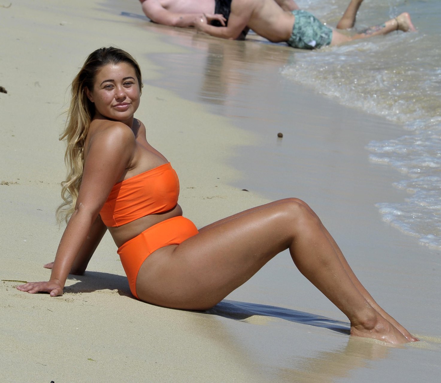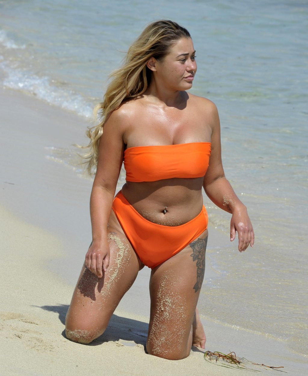 Ibiza Weekender y Big Brother Ellie Young muestra un busto exuberante mientras exhibe escote con un bikini naranja brillante, mientras juega en la playa con su compañero de TV David Potts (David Weekender) – Magaluf, España (octubre de 2018).