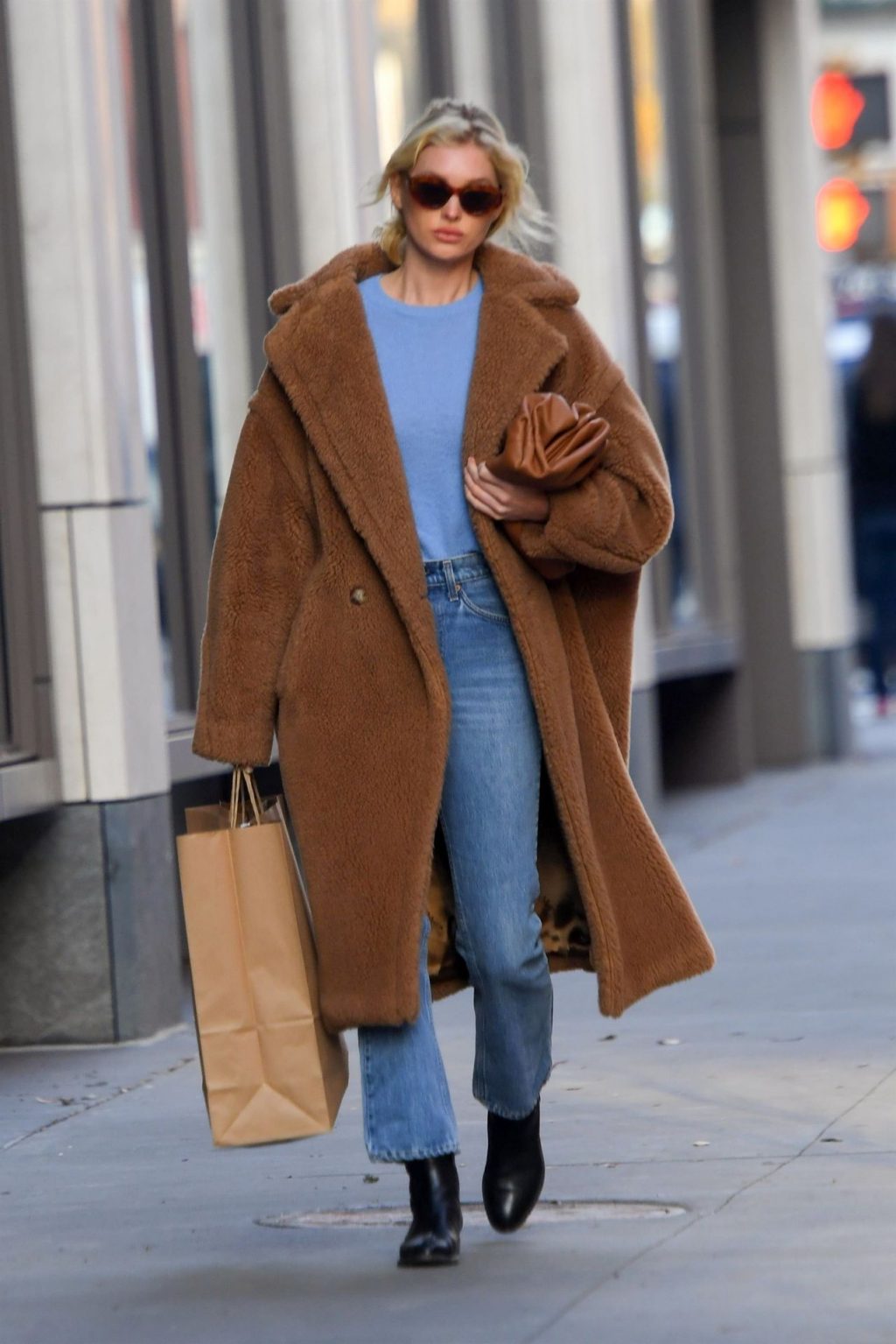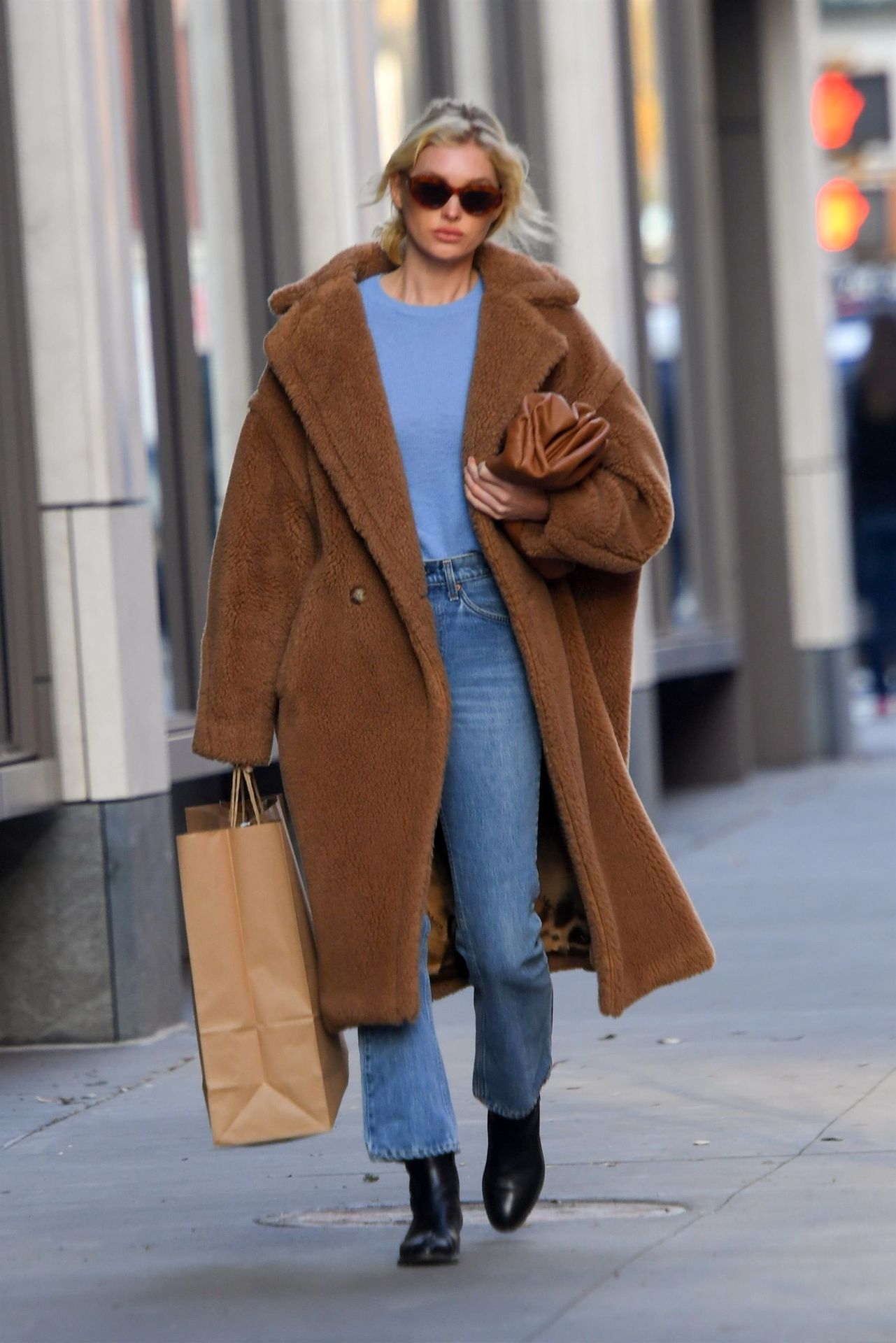 Elsa Hosk sin sujetador sale a pasear por la ciudad de Nueva York y la modelo se ve cómoda con un abrigo de peluche marrón, 25/11/2019.