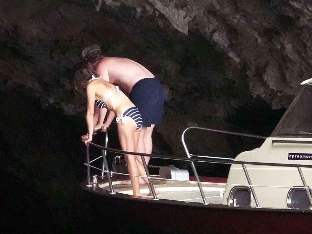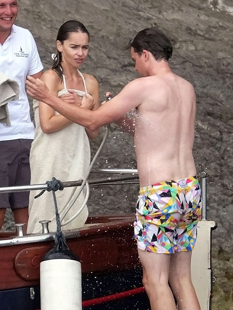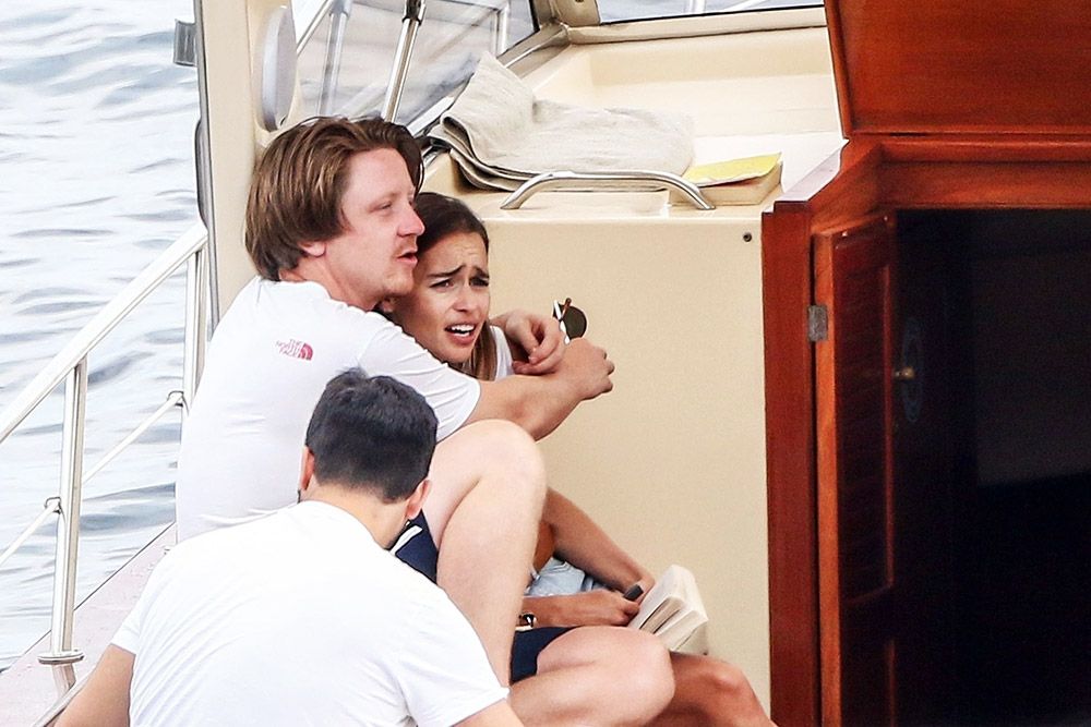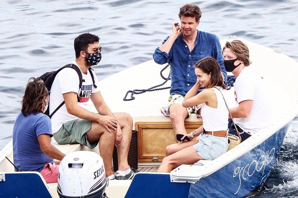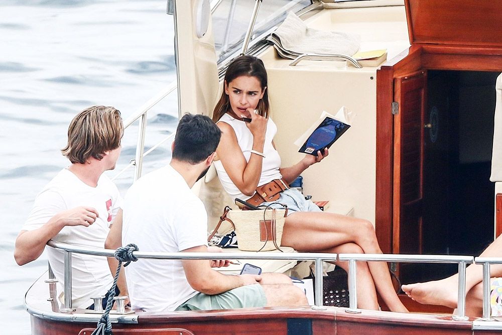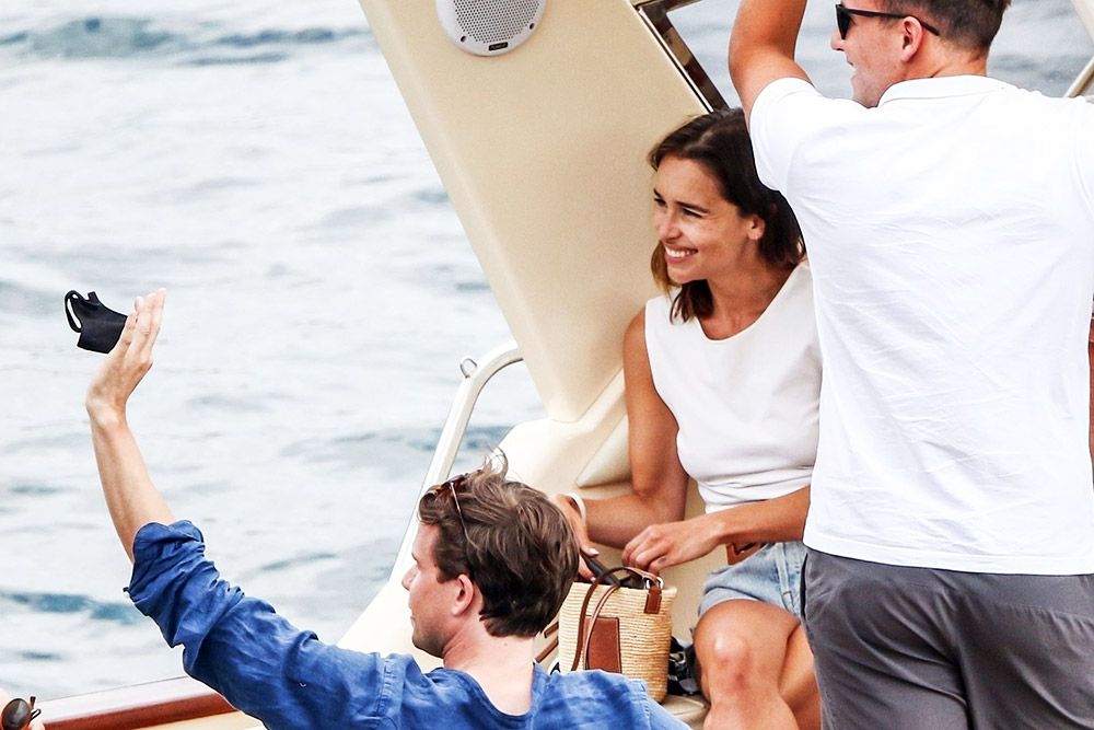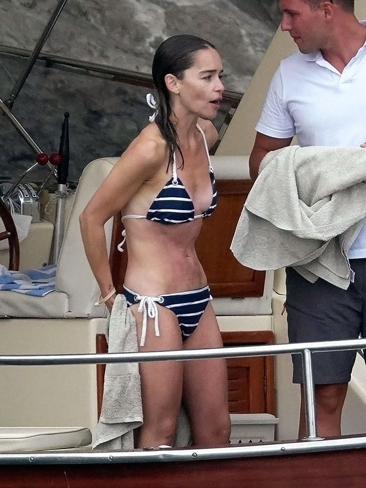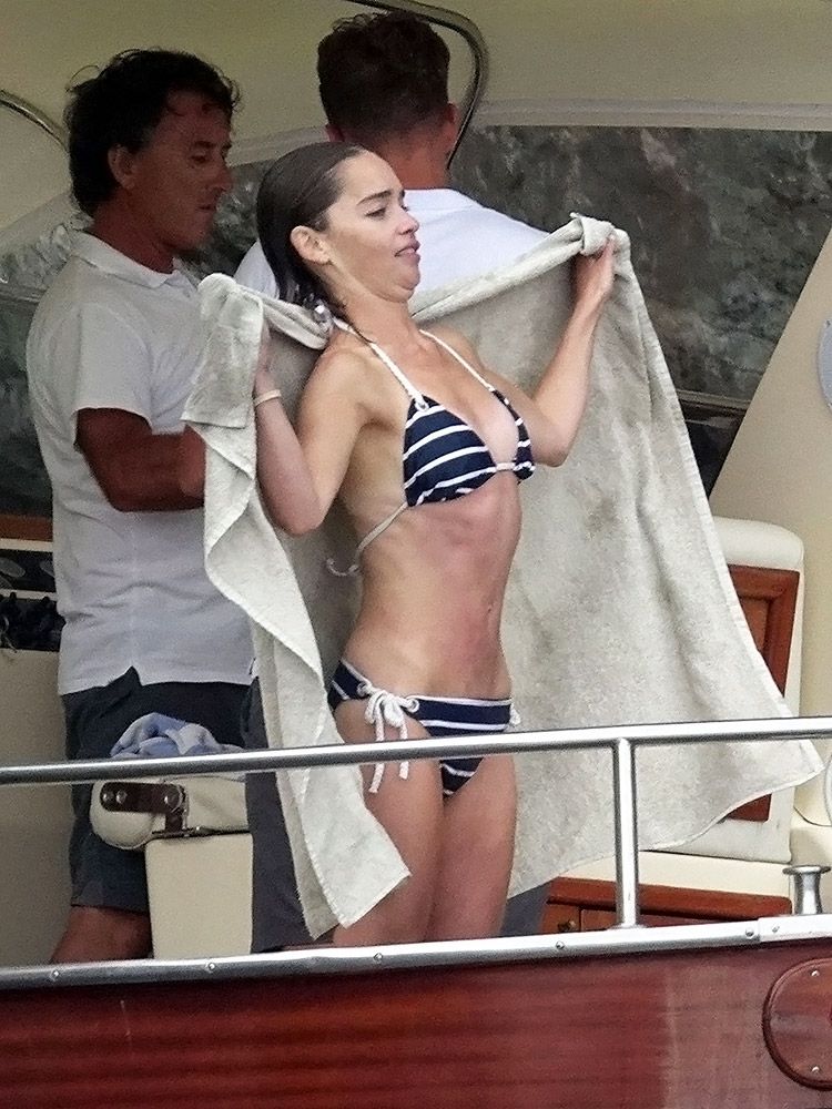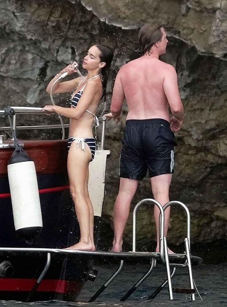 The actress Emilia Clarke is seen with her friends during the summer holiday in Italy. The English beau enjoyed a boat trip with the male friends and went for a swim in a striped bikini. The group visited some caves while out on their boat enjoying the summer in Italy! Emilia Clarke wore a sexy bikini and showed a lot of skin!