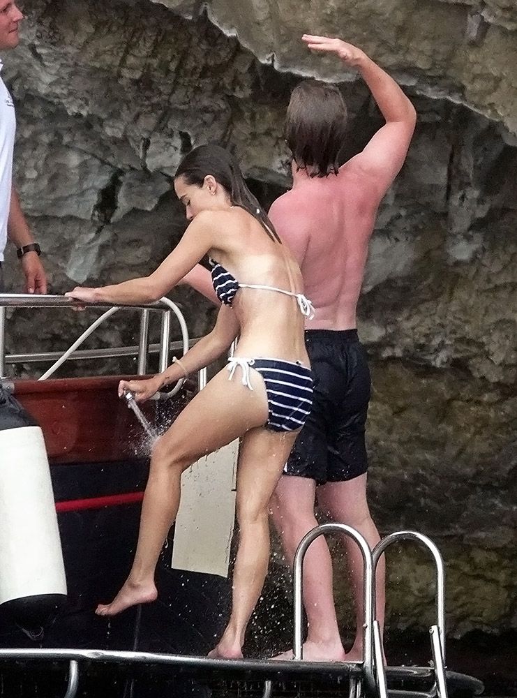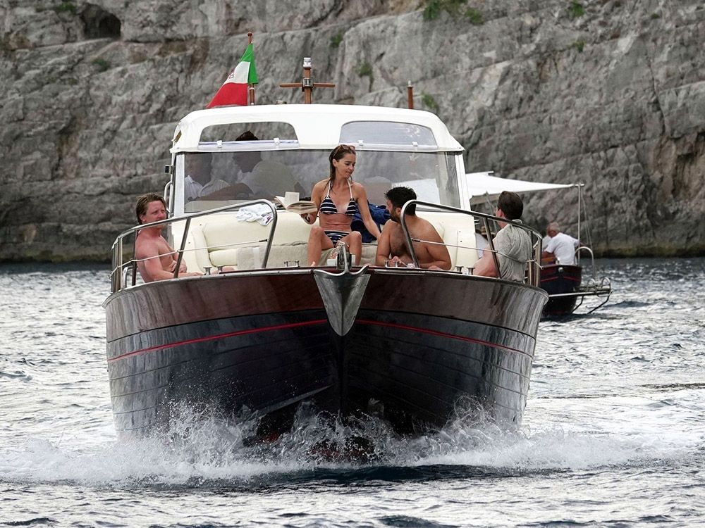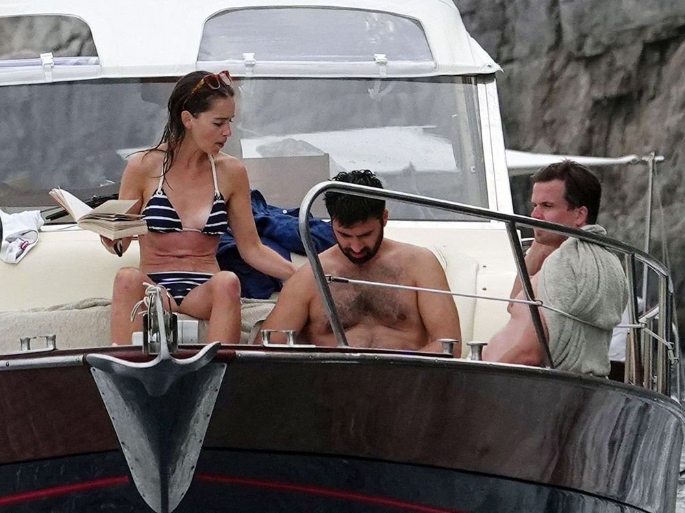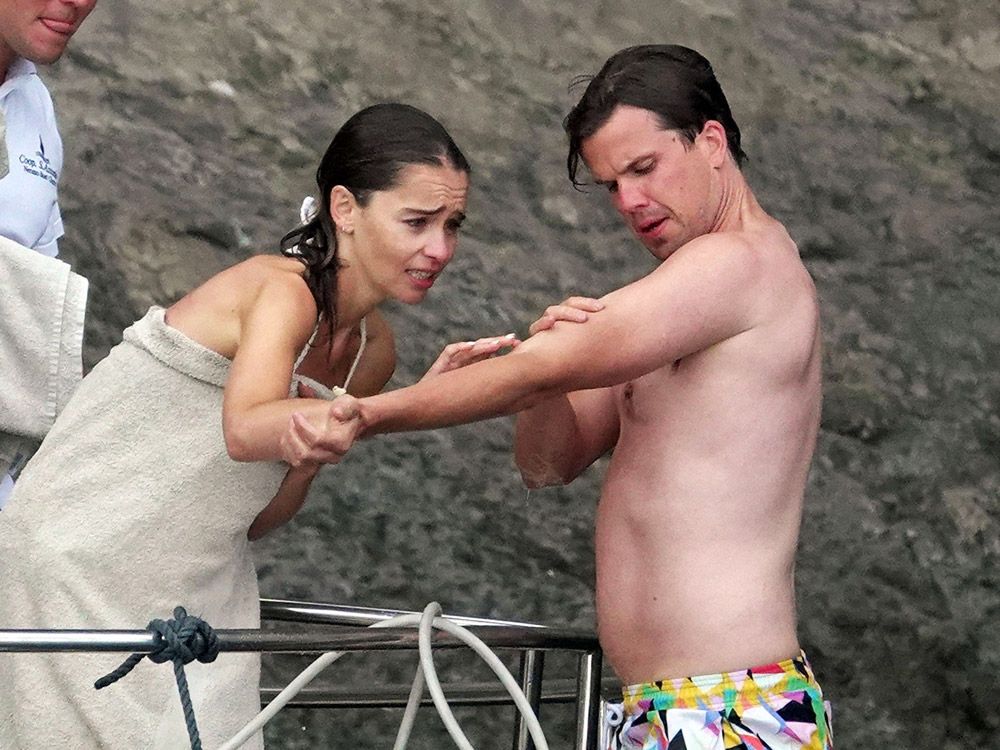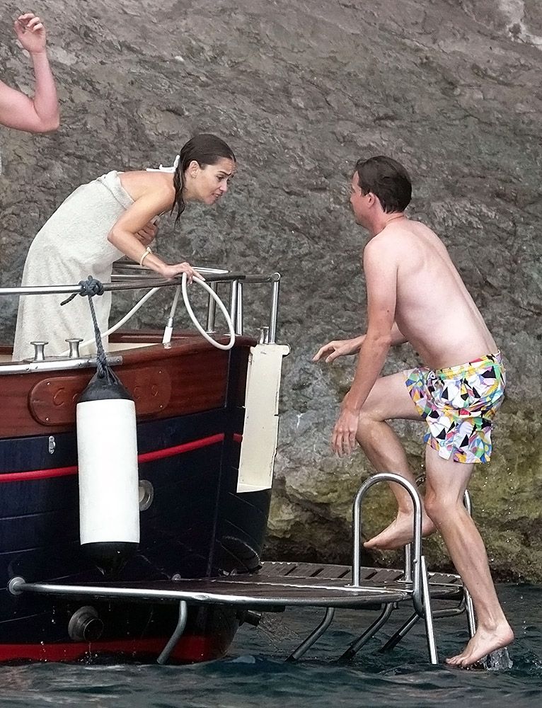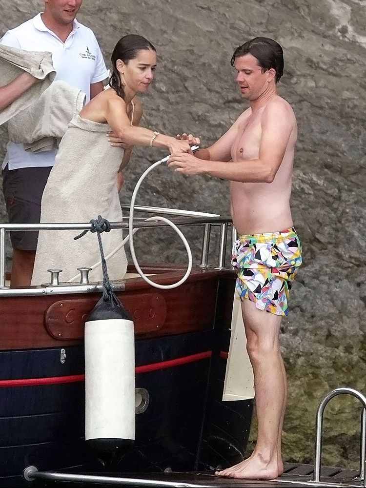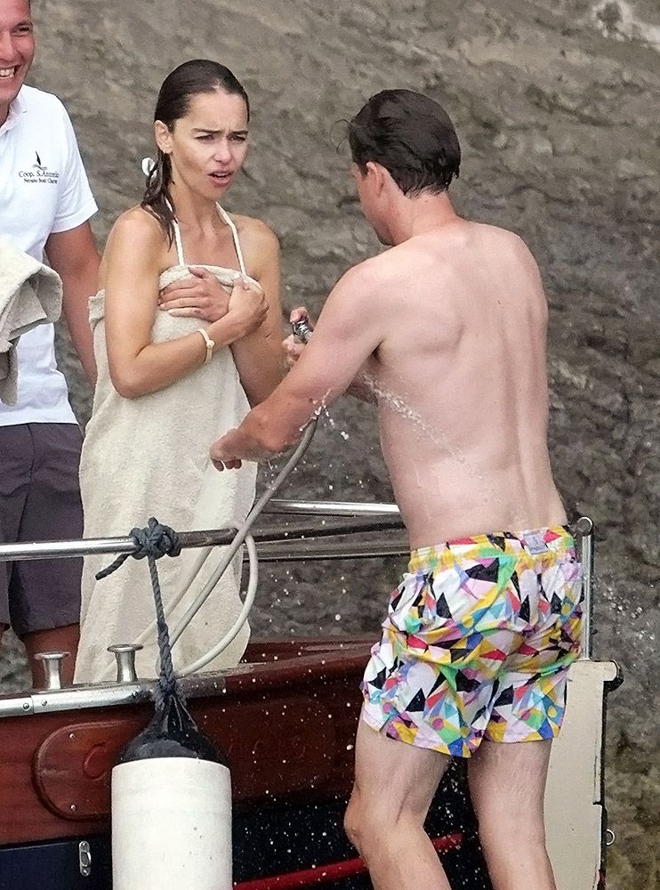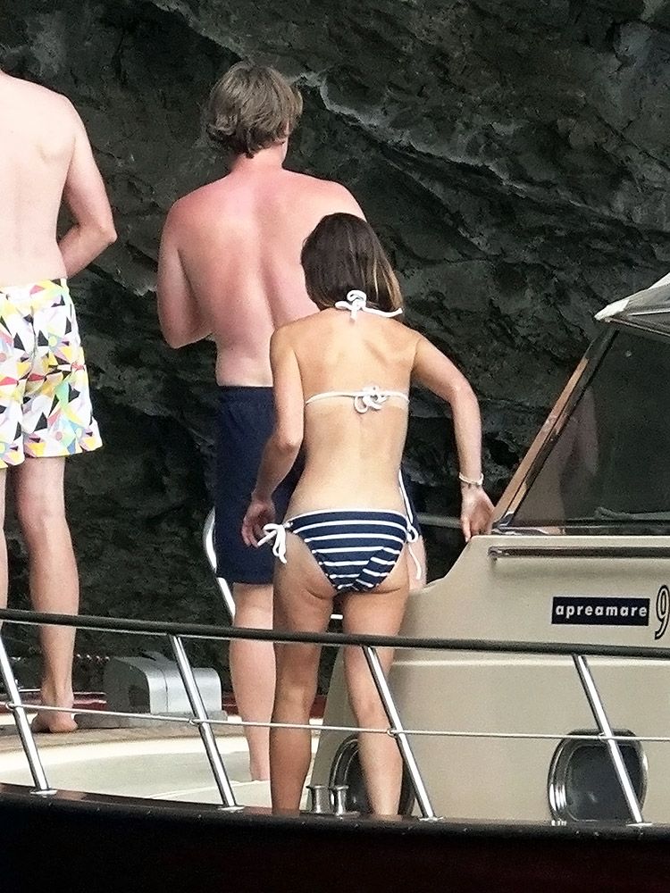 The actress Emilia Clarke is seen with her friends during the summer holiday in Italy. The English beau enjoyed a boat trip with the male friends and went for a swim in a striped bikini. The group visited some caves while out on their boat enjoying the summer in Italy! Emilia Clarke wore a sexy bikini and showed a lot of skin!