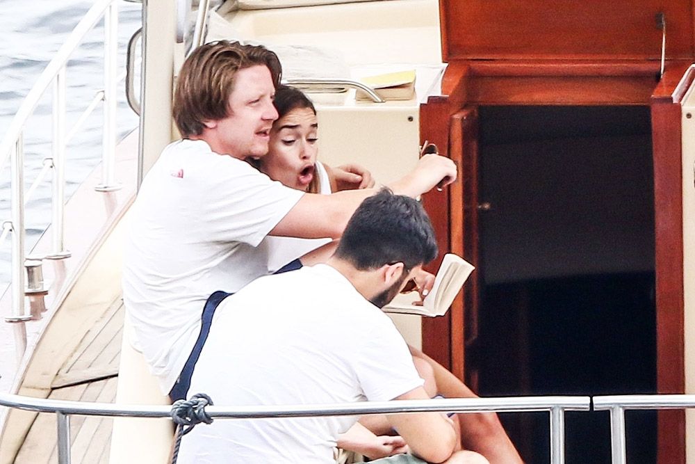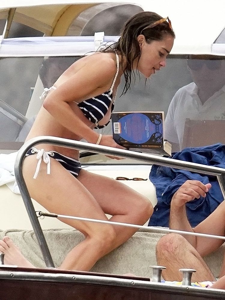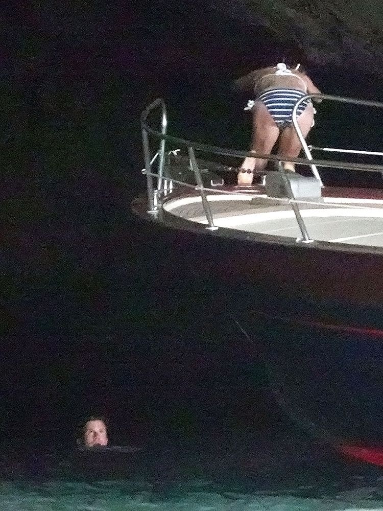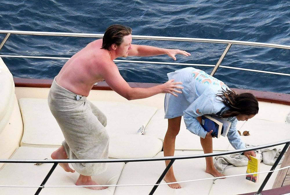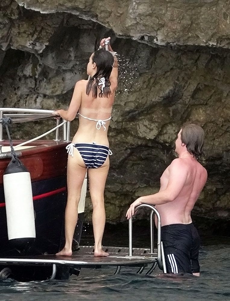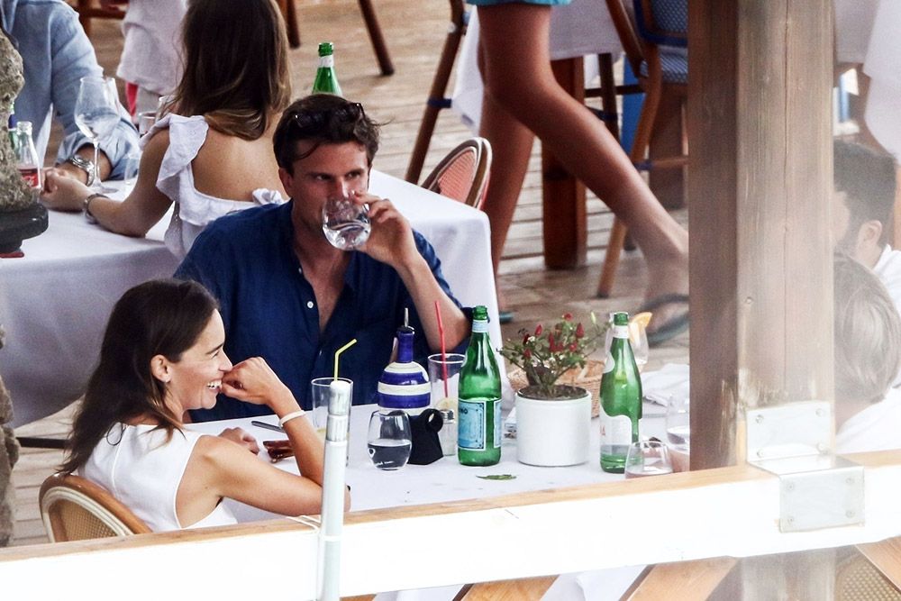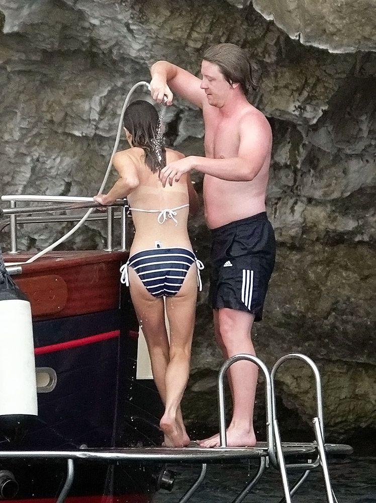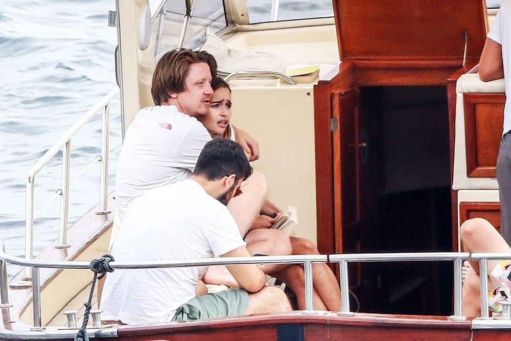 The actress Emilia Clarke is seen with her friends during the summer holiday in Italy. The English beau enjoyed a boat trip with the male friends and went for a swim in a striped bikini. The group visited some caves while out on their boat enjoying the summer in Italy! Emilia Clarke wore a sexy bikini and showed a lot of skin!
