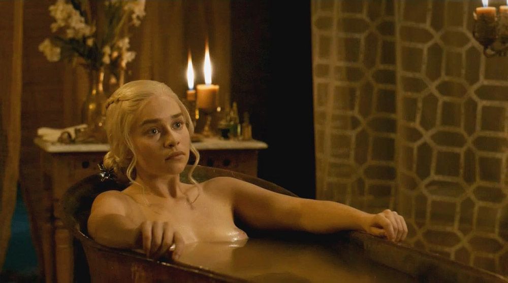 Emilia Clarke nude in the bath and talking to a guy, and her bare breasts and nipples half covered with water. She gets up, and we now have a good look at her nude boobs and firm buttocks.