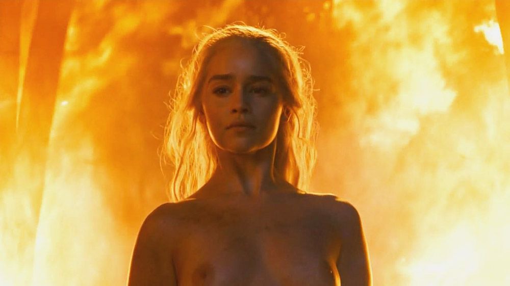 Sexy actress Emilia Clarke emerging naked from a burning building, her breasts becoming visible as she steps out of the flames and looks out over a crowd of people kneeling below.