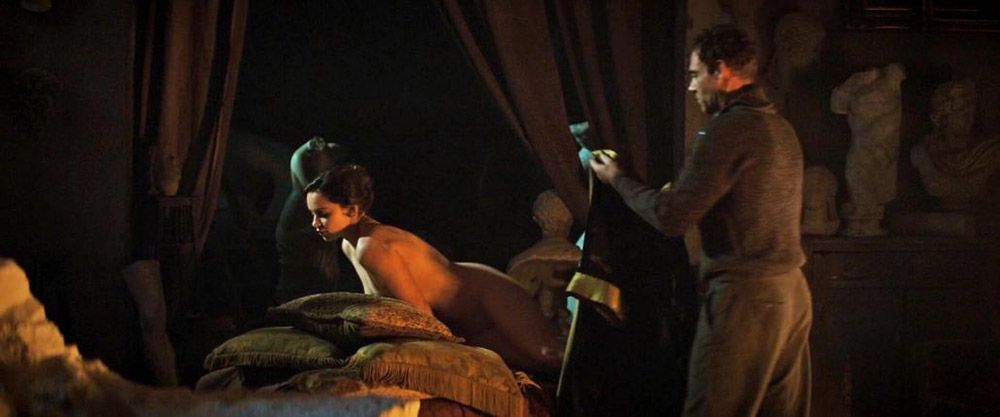 In the second one, Emilia Clarke is posing for an artist. She lowers her robe off the shoulders, and we see her bare naked. The guy then lays her robe over her thighs, and we see Emilia topless for a while. Next, we see the guy chiseling a statue of her form while Emilia is seen lying in bed.
