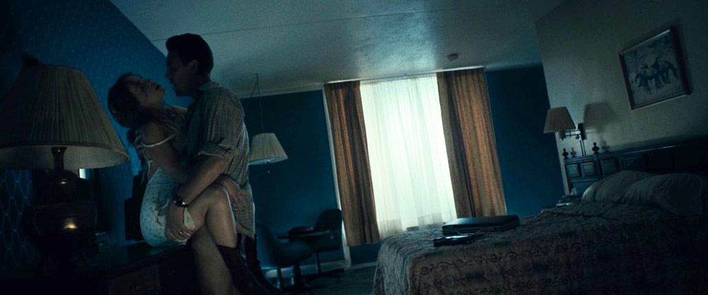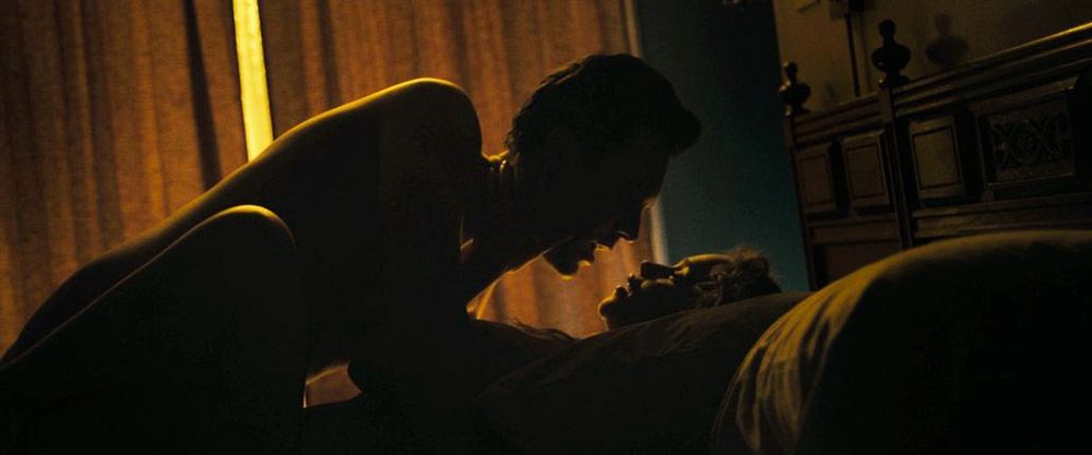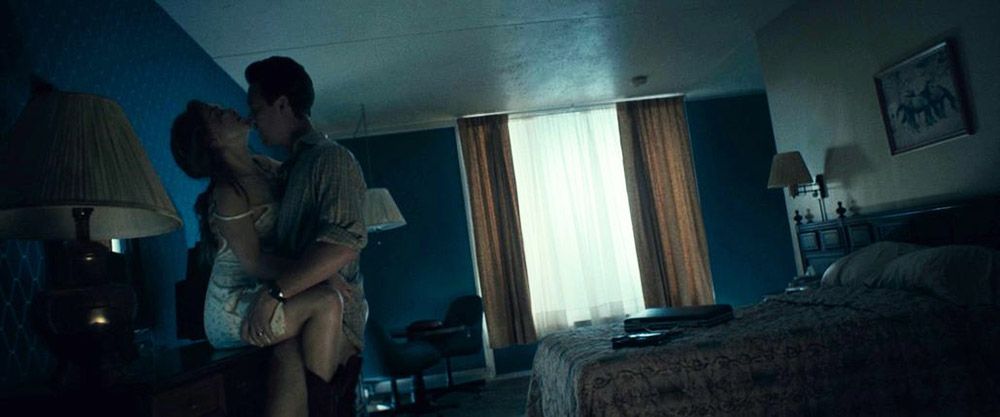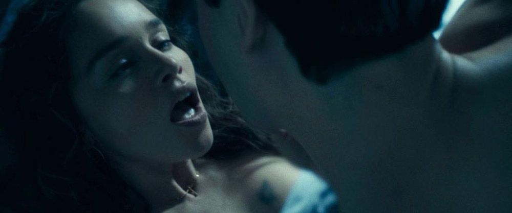 Then Emilia Clarke is sitting on a piece of furniture in a motel room. She and a guy have sex in slow motion, her dress strap off the shoulder. We then see a bit more cleavage from Emilia while on her back under the guy, as they have sex again.