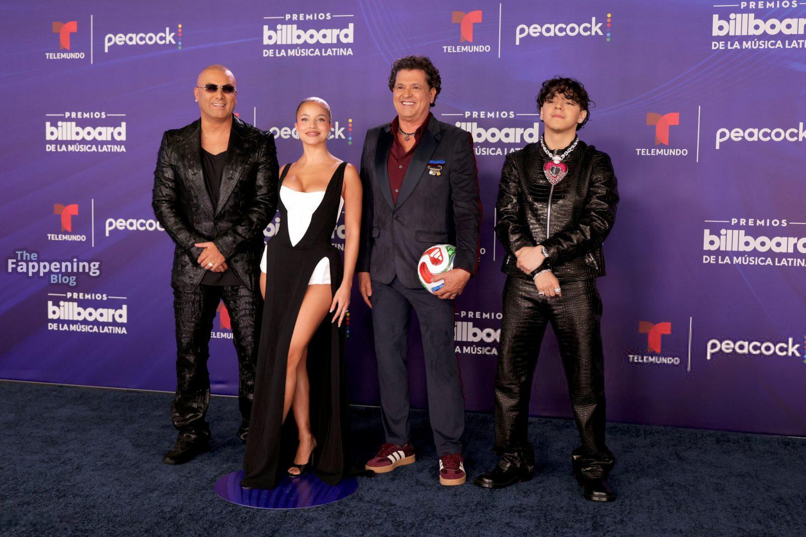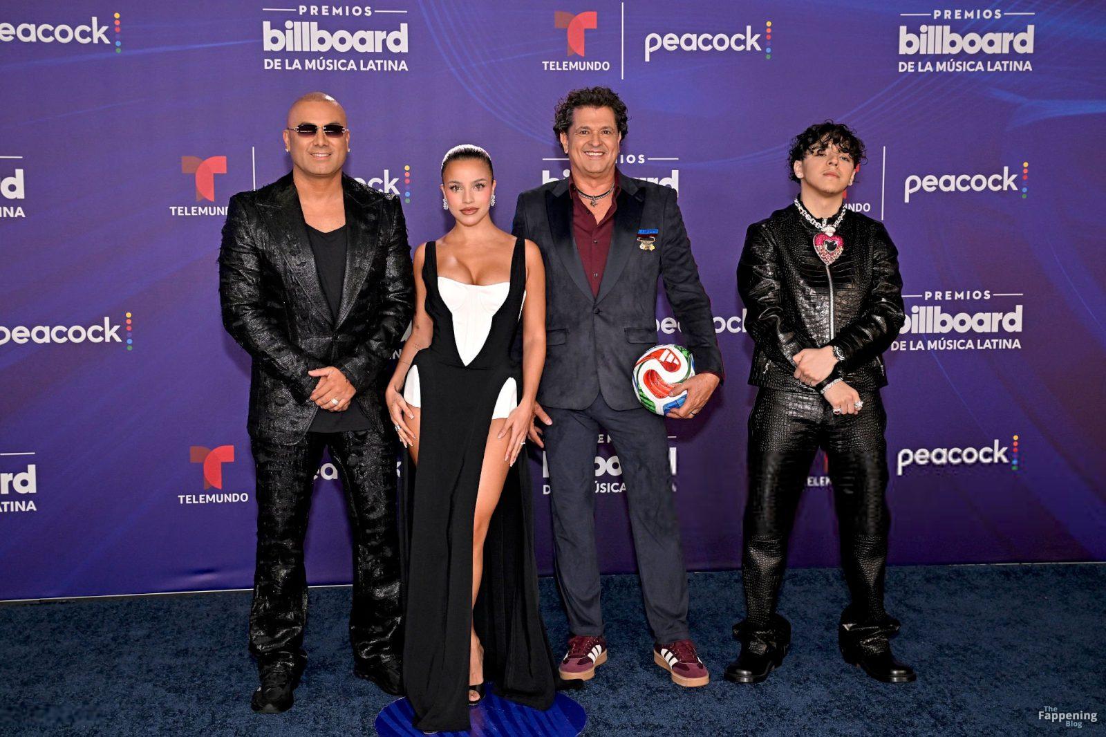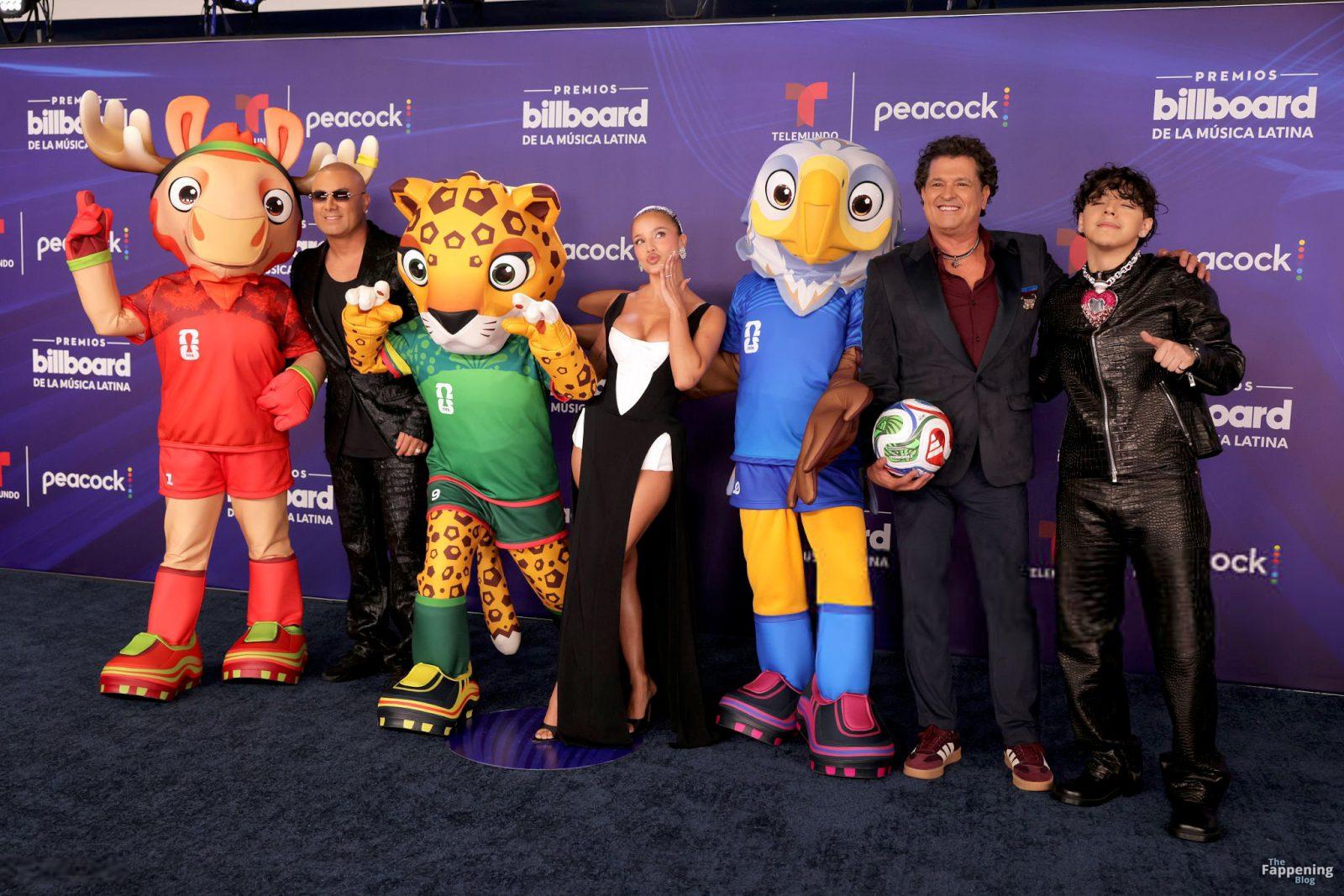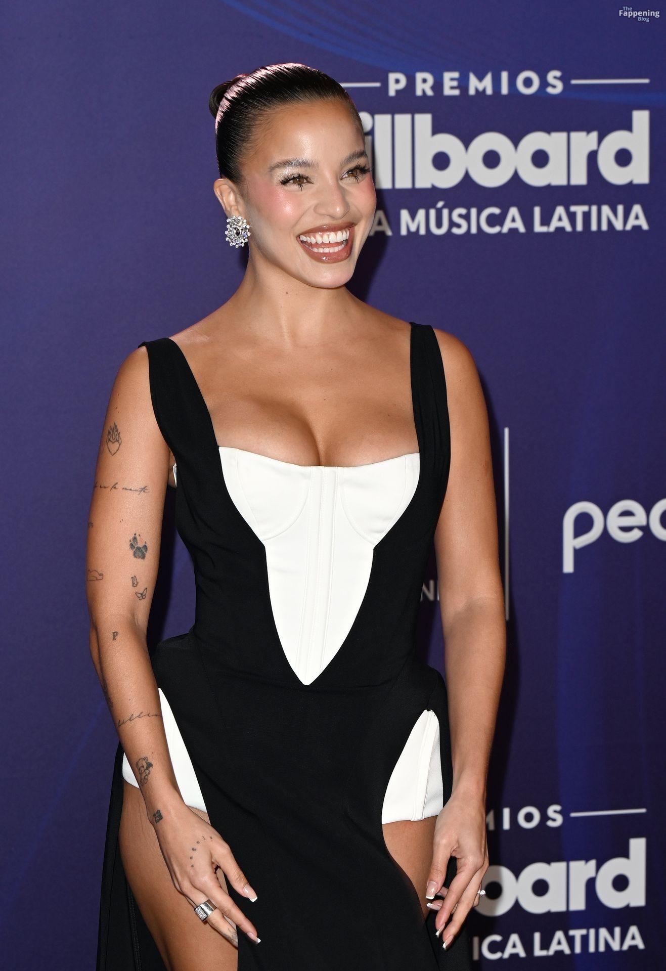 Emilia Mernes asistió a los Premios Billboard de la Música Latina 2025 en Miami, luciendo un vestido blanco y negro con una abertura alta que mostraba sus grandes pechos y piernas tonificadas. Ella pisó la alfombra roja en el James L. Knight Center.