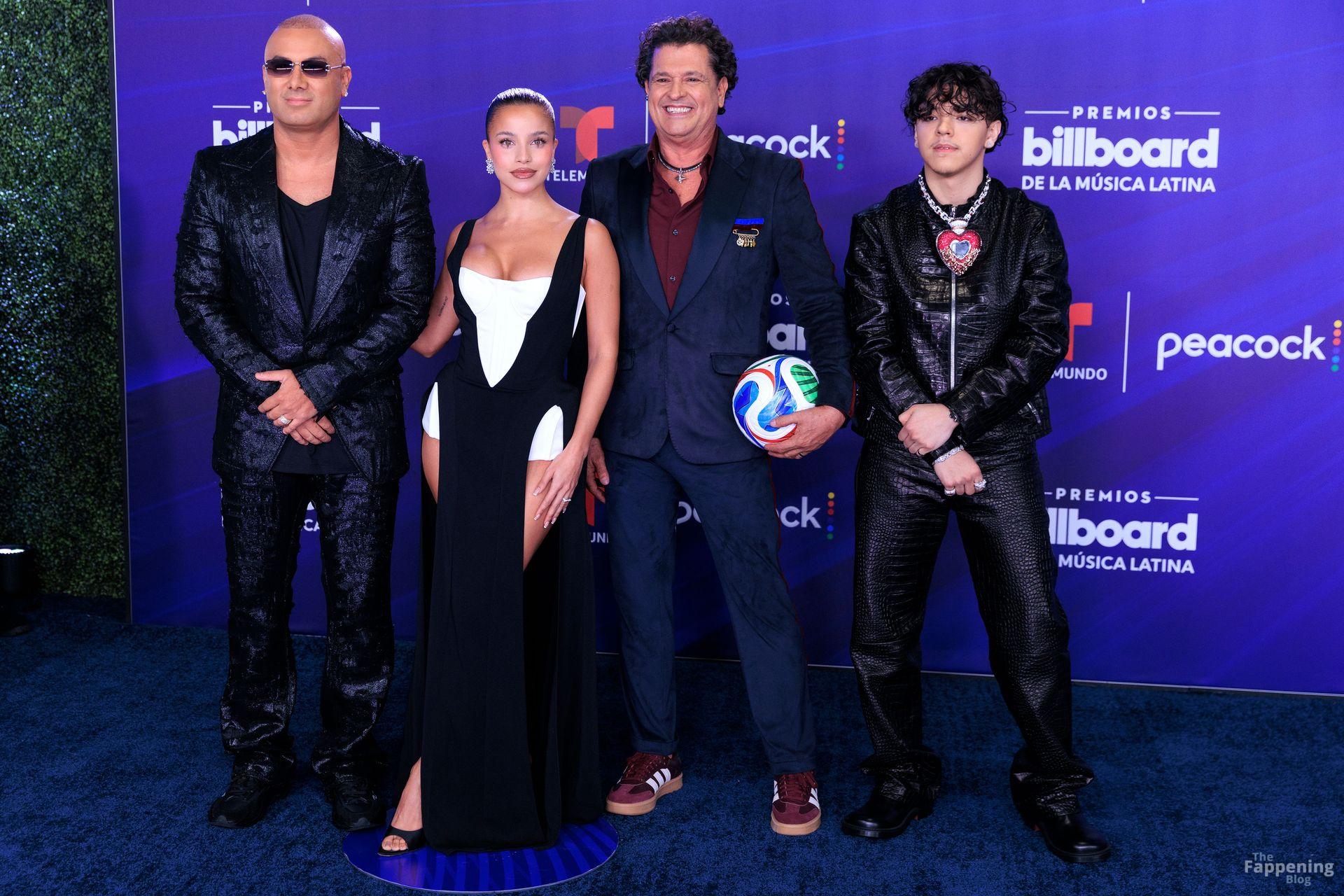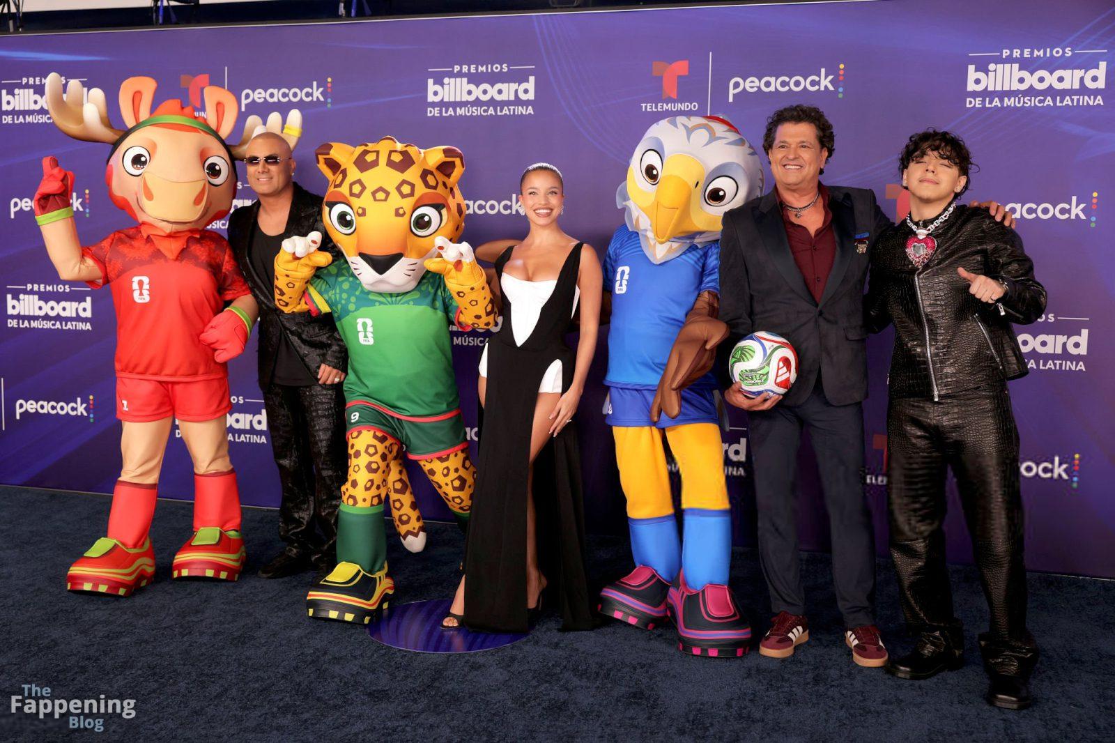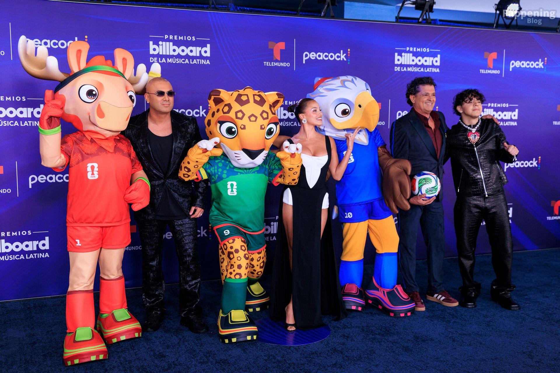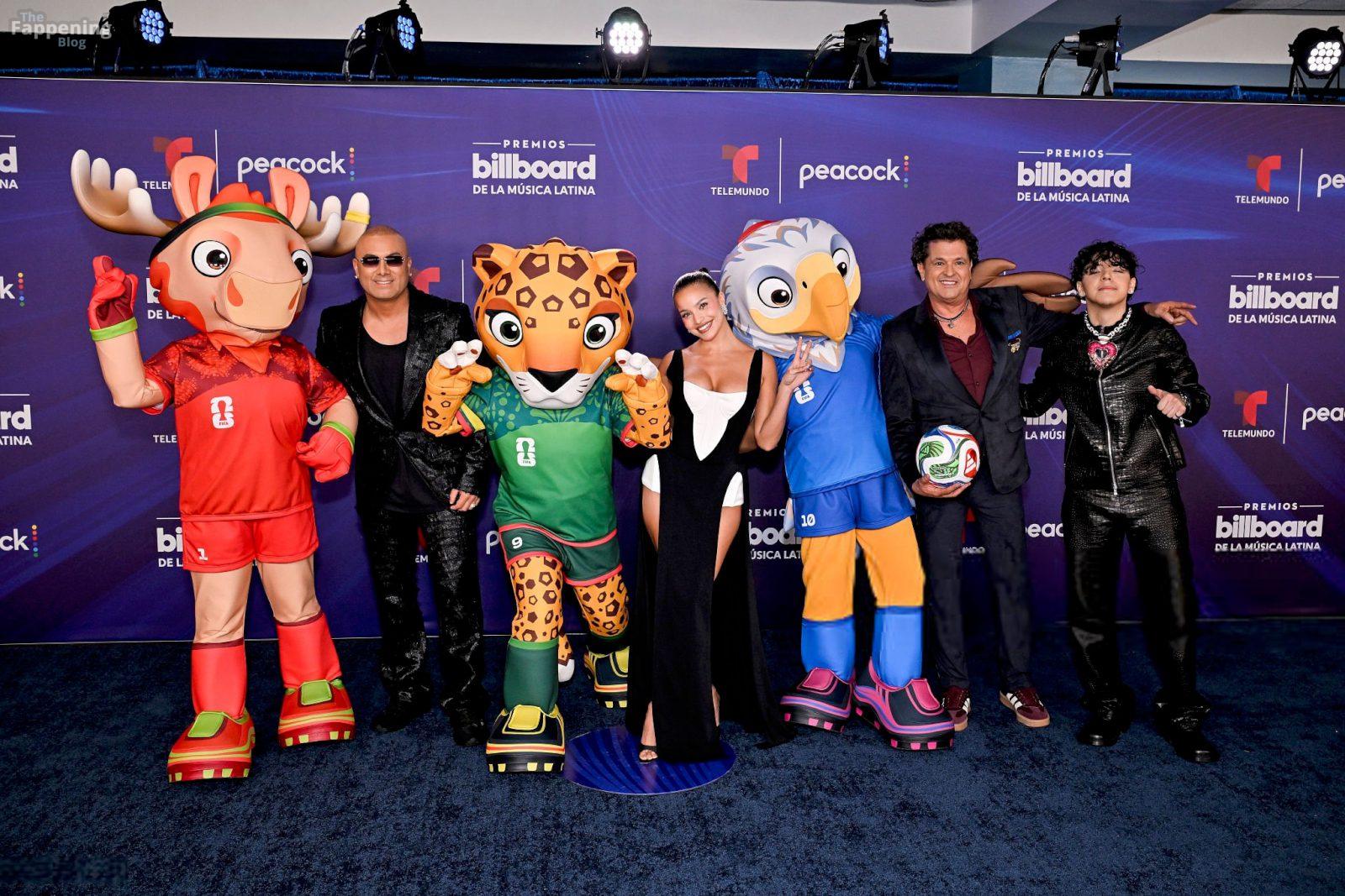 Emilia Mernes asistió a los Premios Billboard de la Música Latina 2025 en Miami, luciendo un vestido blanco y negro con una abertura alta que mostraba sus grandes pechos y piernas tonificadas. Ella pisó la alfombra roja en el James L. Knight Center.
