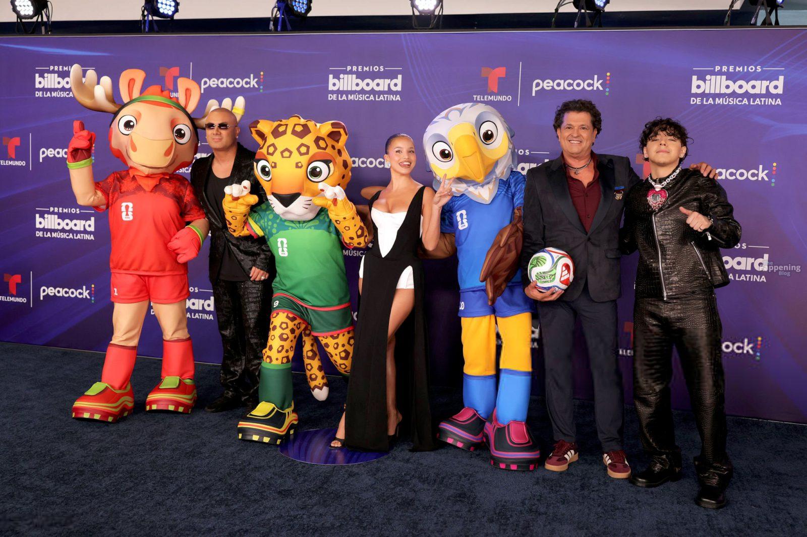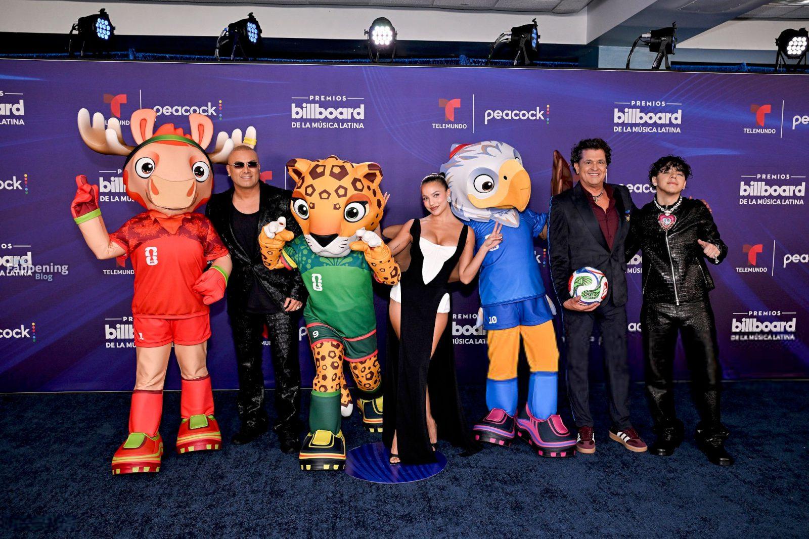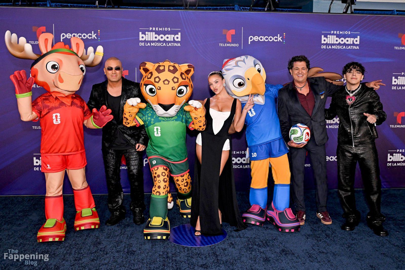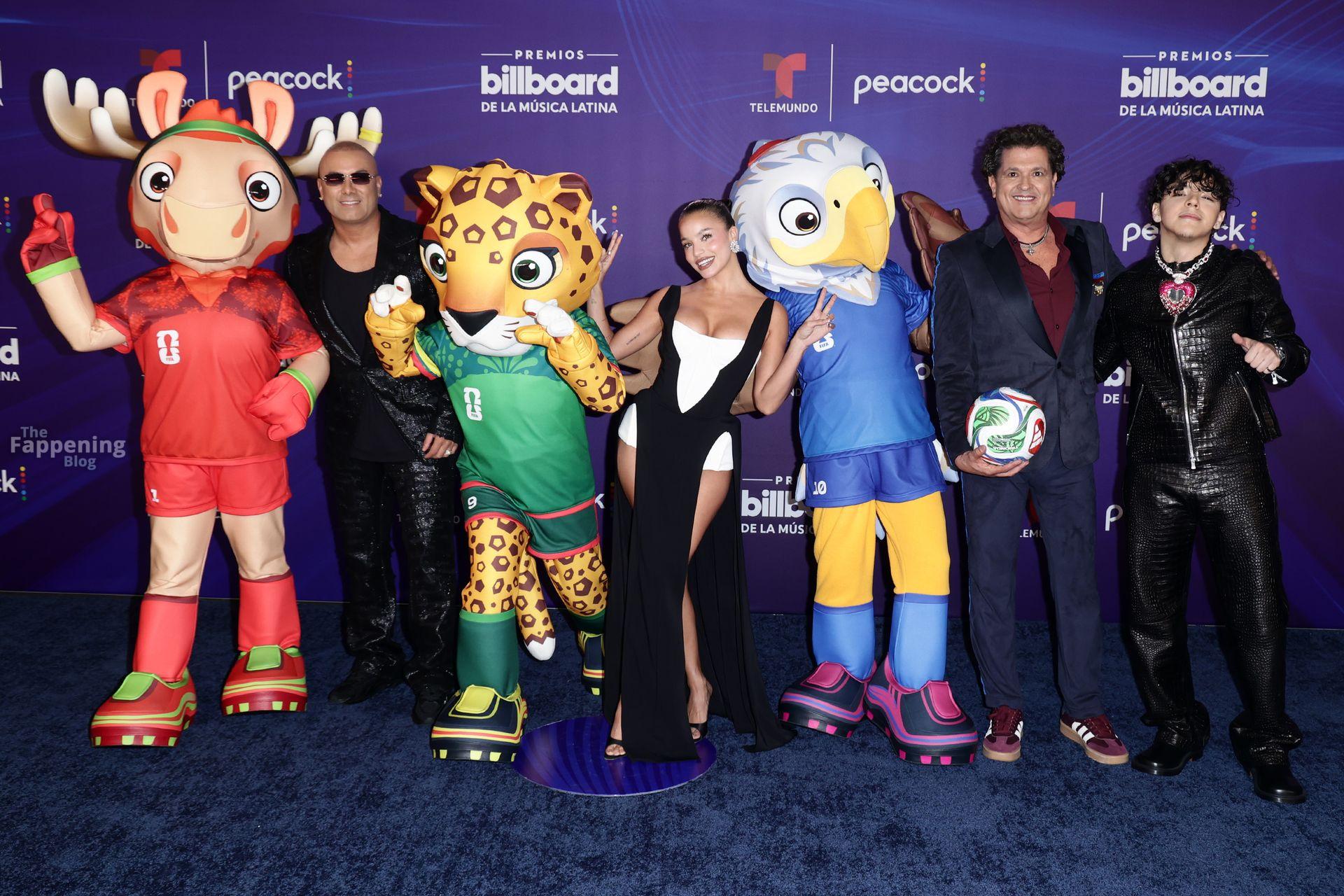 Emilia Mernes asistió a los Premios Billboard de la Música Latina 2025 en Miami, luciendo un vestido blanco y negro con una abertura alta que mostraba sus grandes pechos y piernas tonificadas. Ella pisó la alfombra roja en el James L. Knight Center.