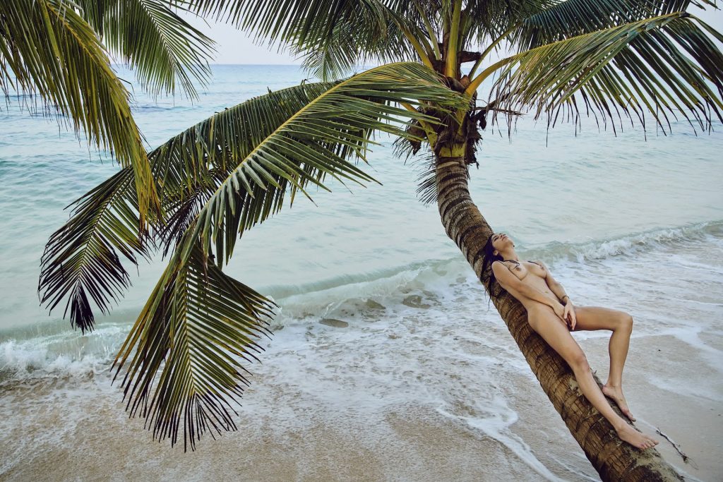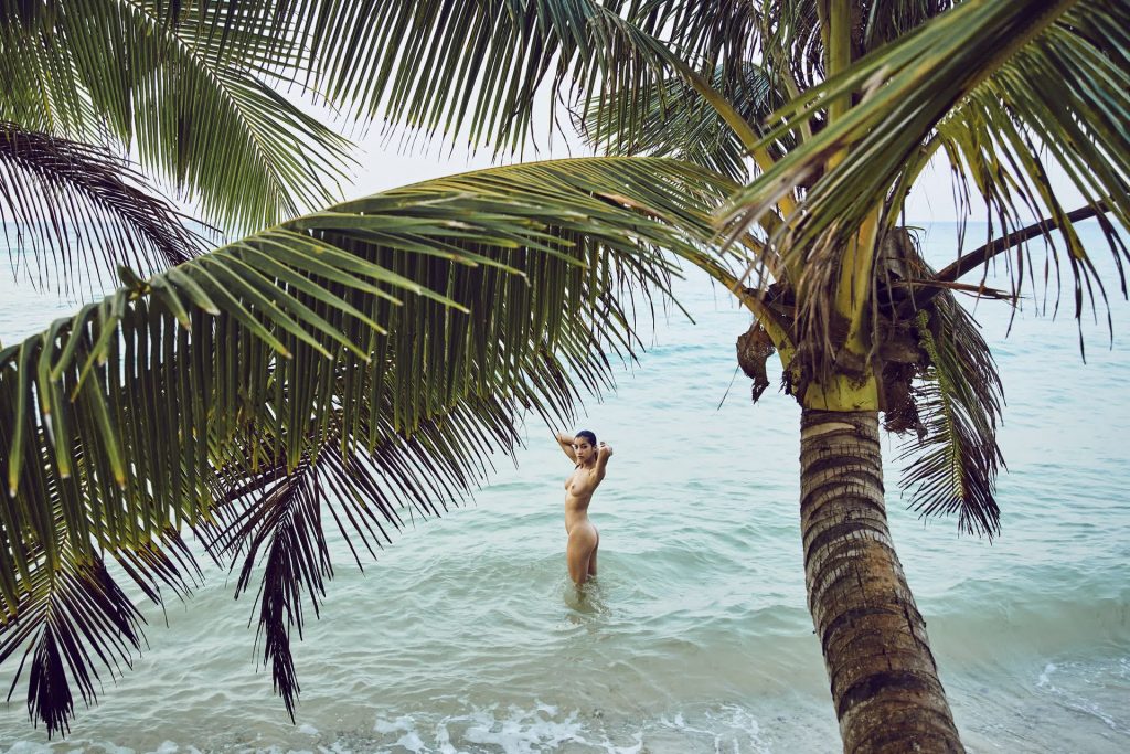 La modelo francesa Emilie Payet muestra sus pechos desnudos y su gran vello púbico en una nueva sesión de fotos en la playa de Tailandia (2020).