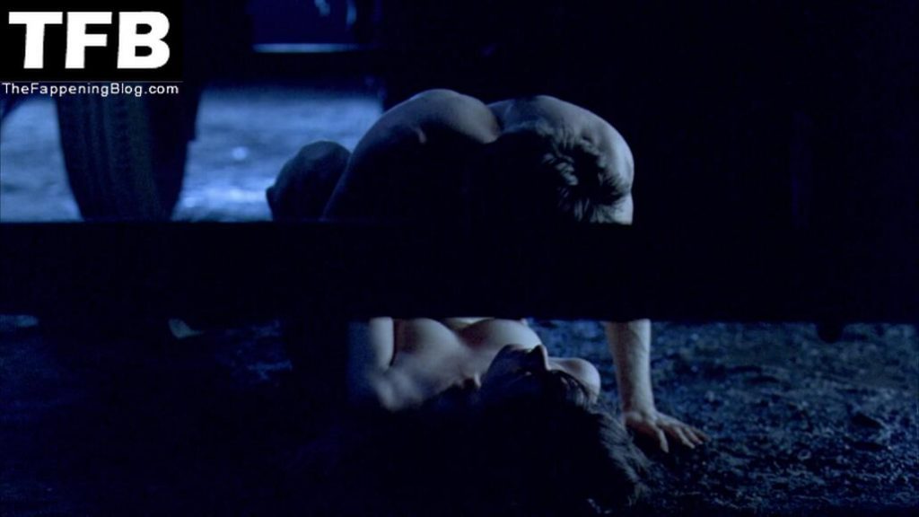 Emily Mortimer se está quitando su camisón por la cabeza para revelar su vello púbico y sus grandes pechos, y luego se acuesta desnuda de espaldas mientras tiene sexo con un hombre afuera bajo un camión estacionado por la noche.