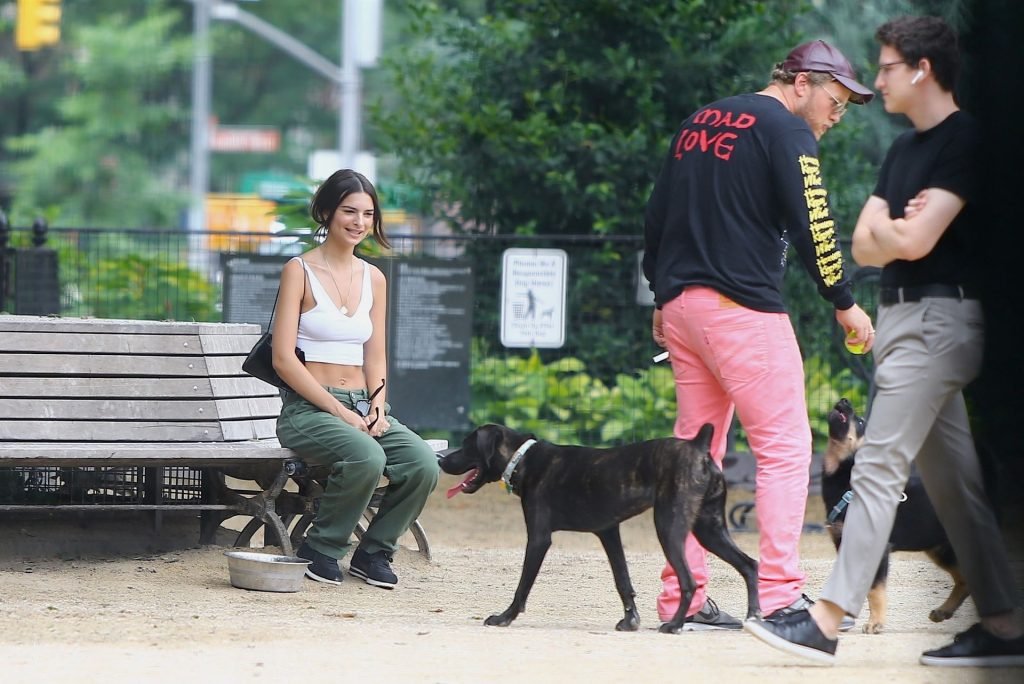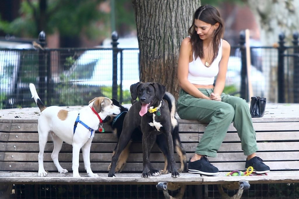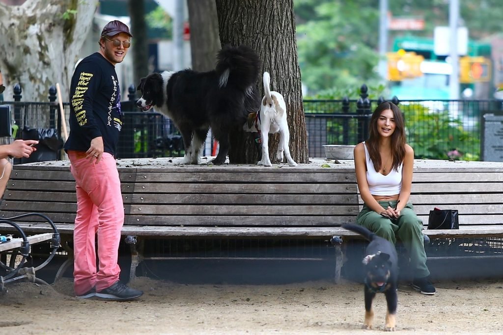 Modelo/actriz sexy Emily Ratajkowski con su esposo Sebastian Bear-McClard y su perro Colombo, fotografiados divirtiéndose en el Parque para Perros Washington Square en Nueva York, 20/06/2019.