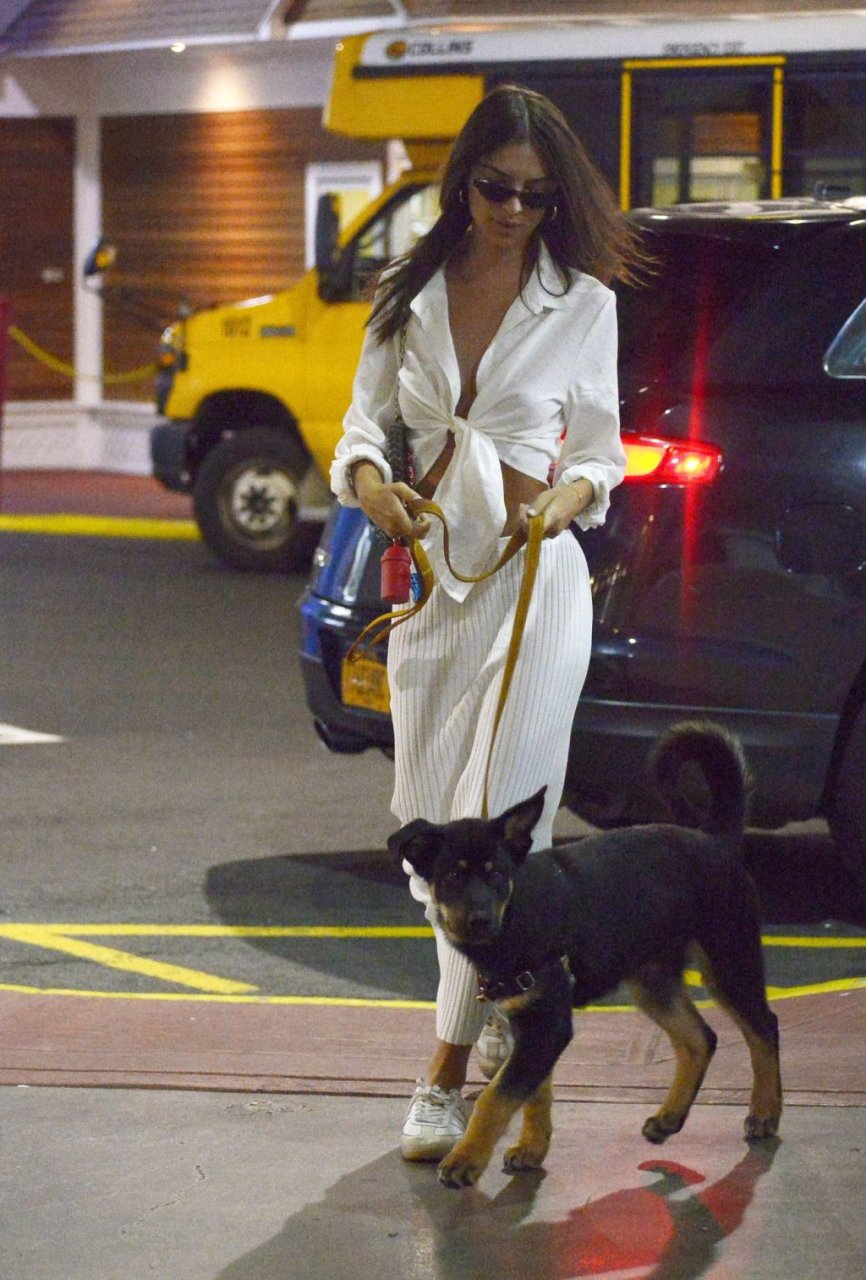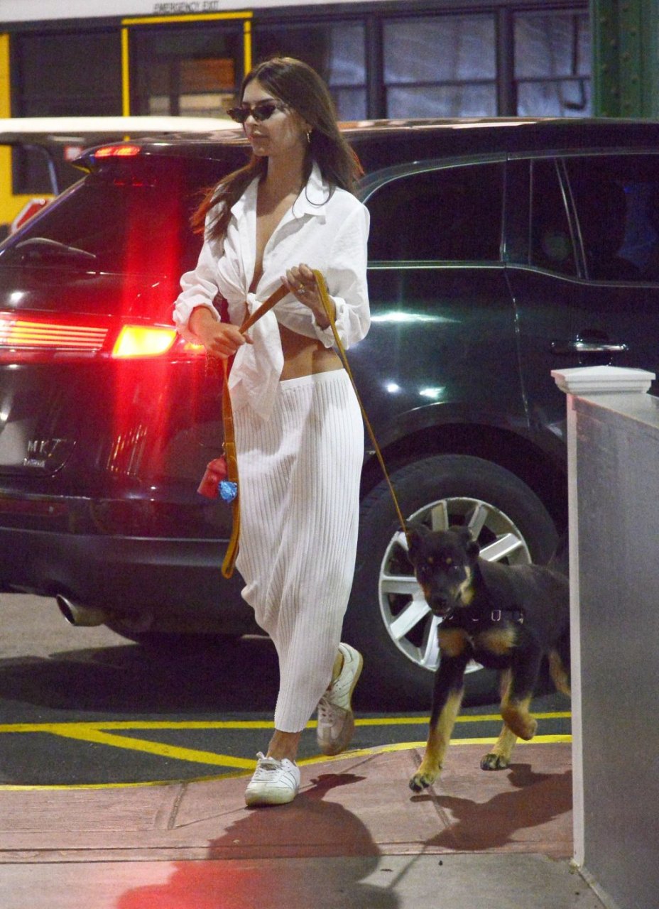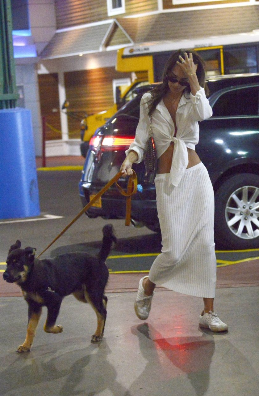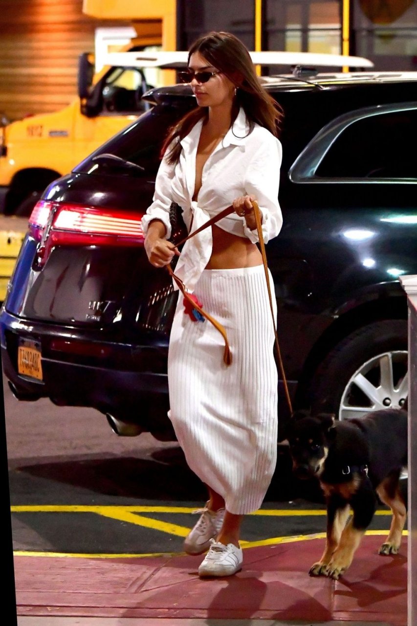 Emily Ratajkowski fue vista saliendo con su perro en la ciudad de Nueva York, 12/07/2019. La modelo de bikini de 28 años llevaba un top corto blanco, falda a rayas y zapatillas blancas.