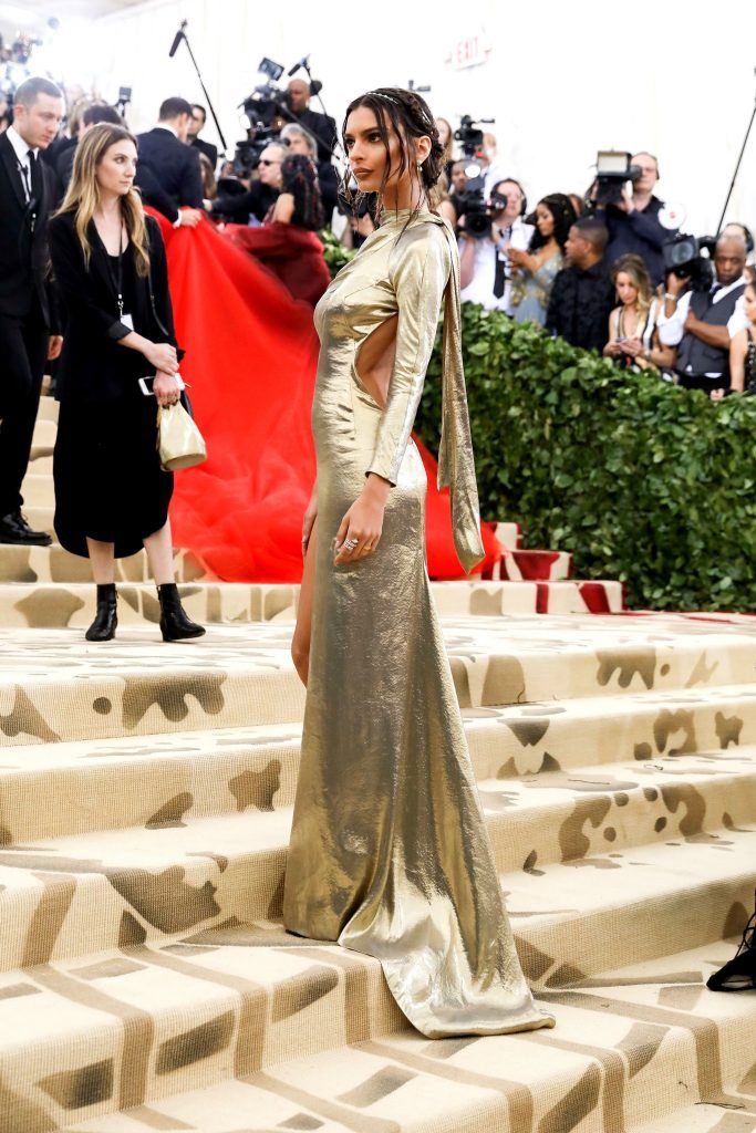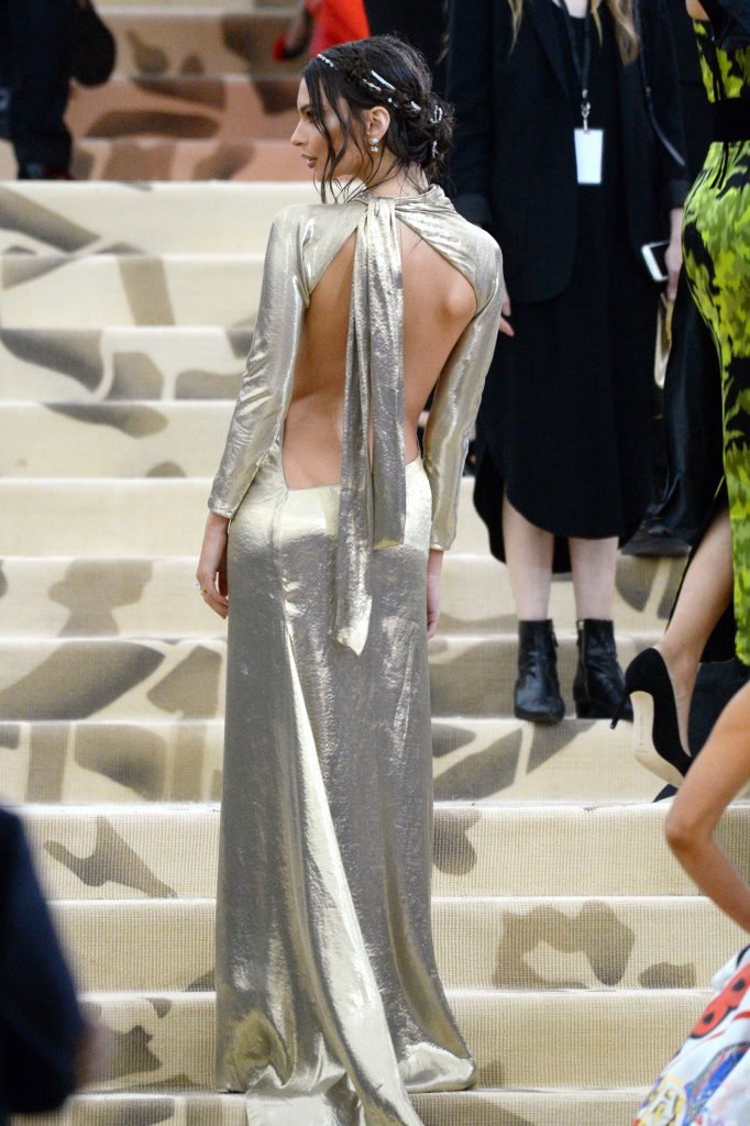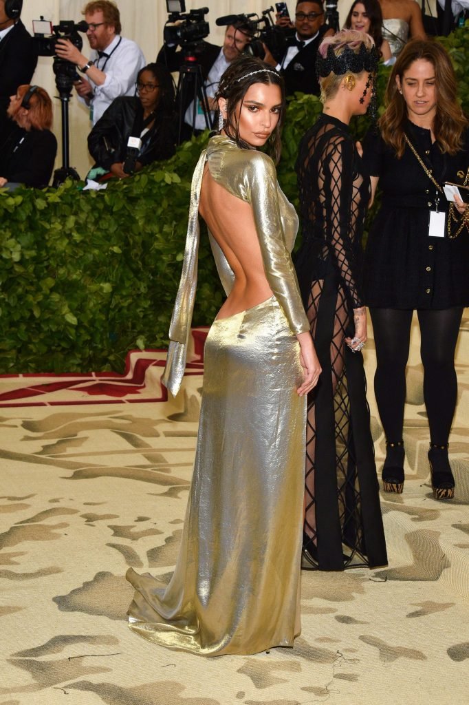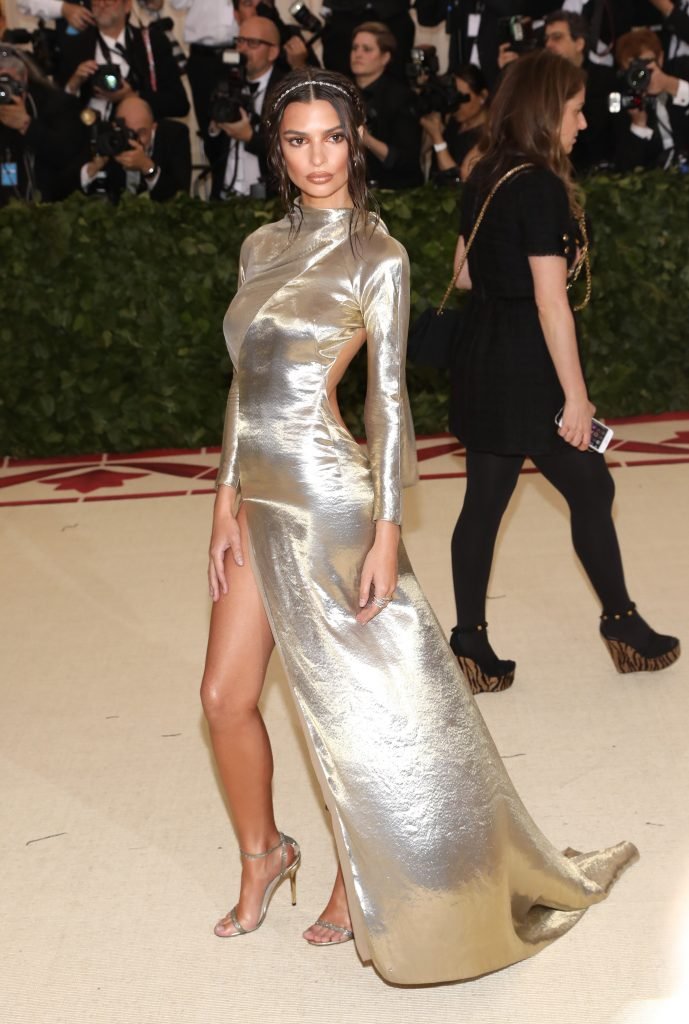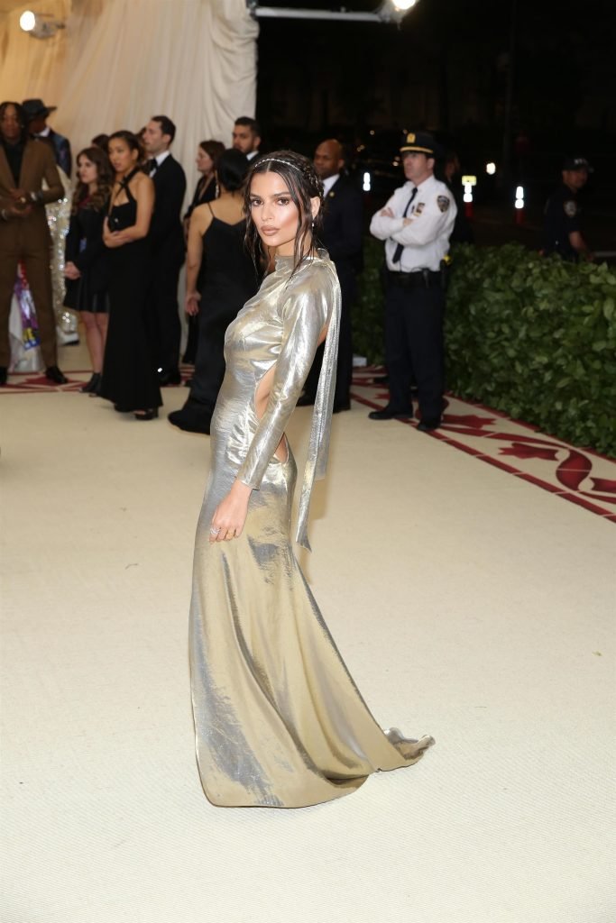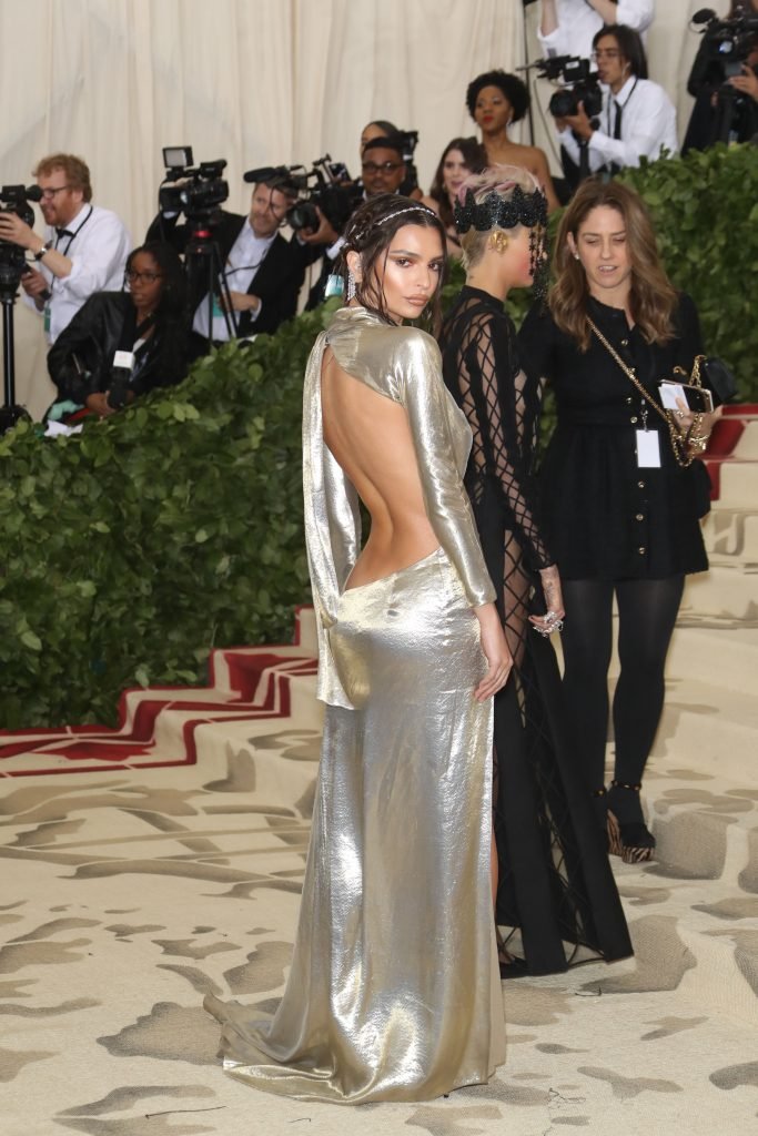 Modelo y actriz Emily Ratajkowski (26) muestra su figura esbelta, piernas y destellos de ropa interior en la Gala del Instituto de Vestuario 2018 en la ciudad de Nueva York. La impresionante morena llevaba un vestido plateado con la espalda descubierta.