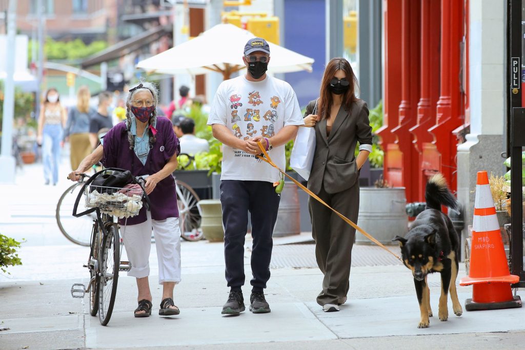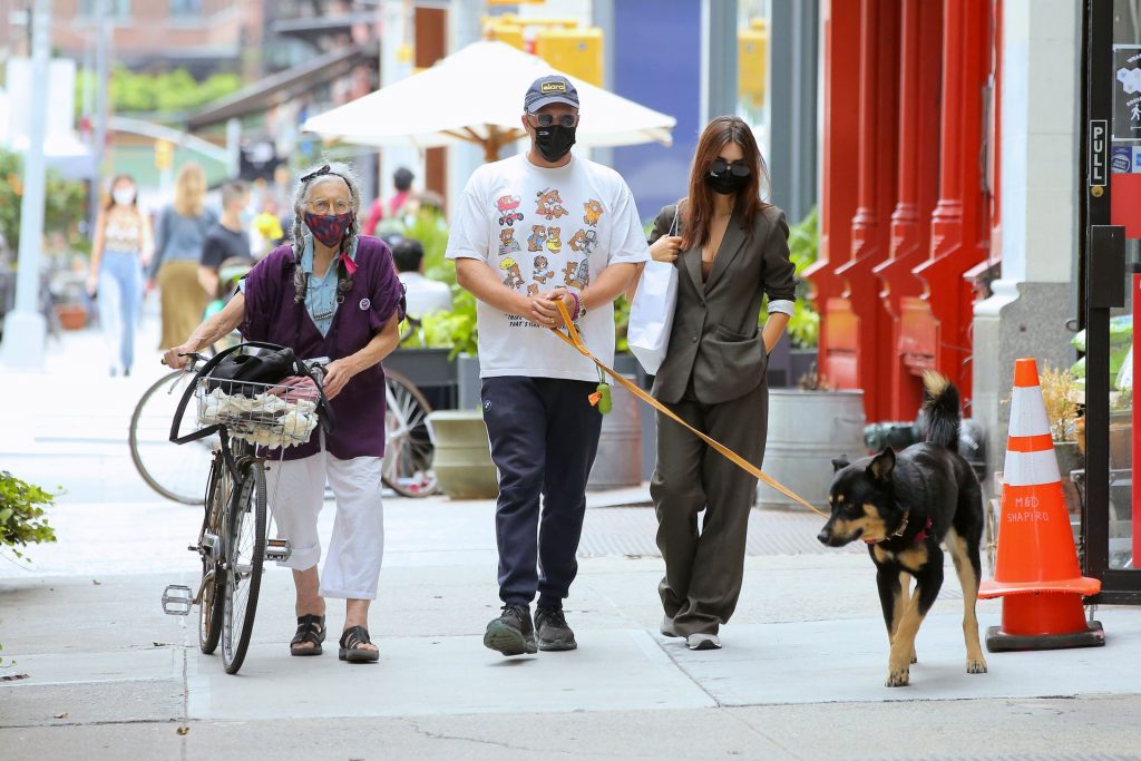 Modelo, actriz y estrella de The Fappening Emily Ratajkowski es vista con un traje de pantalón oliva, zapatillas de tenis y mascarilla después de almorzar en ATLA en la Ciudad de Nueva York, 26/09/2020.