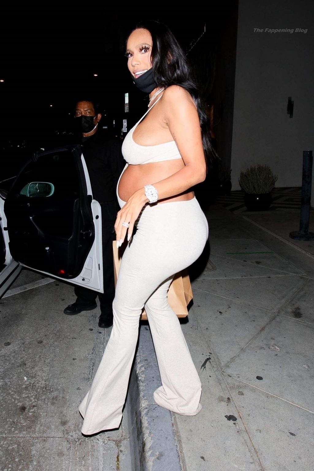 Una Erica Mena muy embarazada se muestra presumiendo su creciente barriga de bebé con un mono blanco revelador mientras llega a Catch LA en West Hollywood, 09/05/2021.