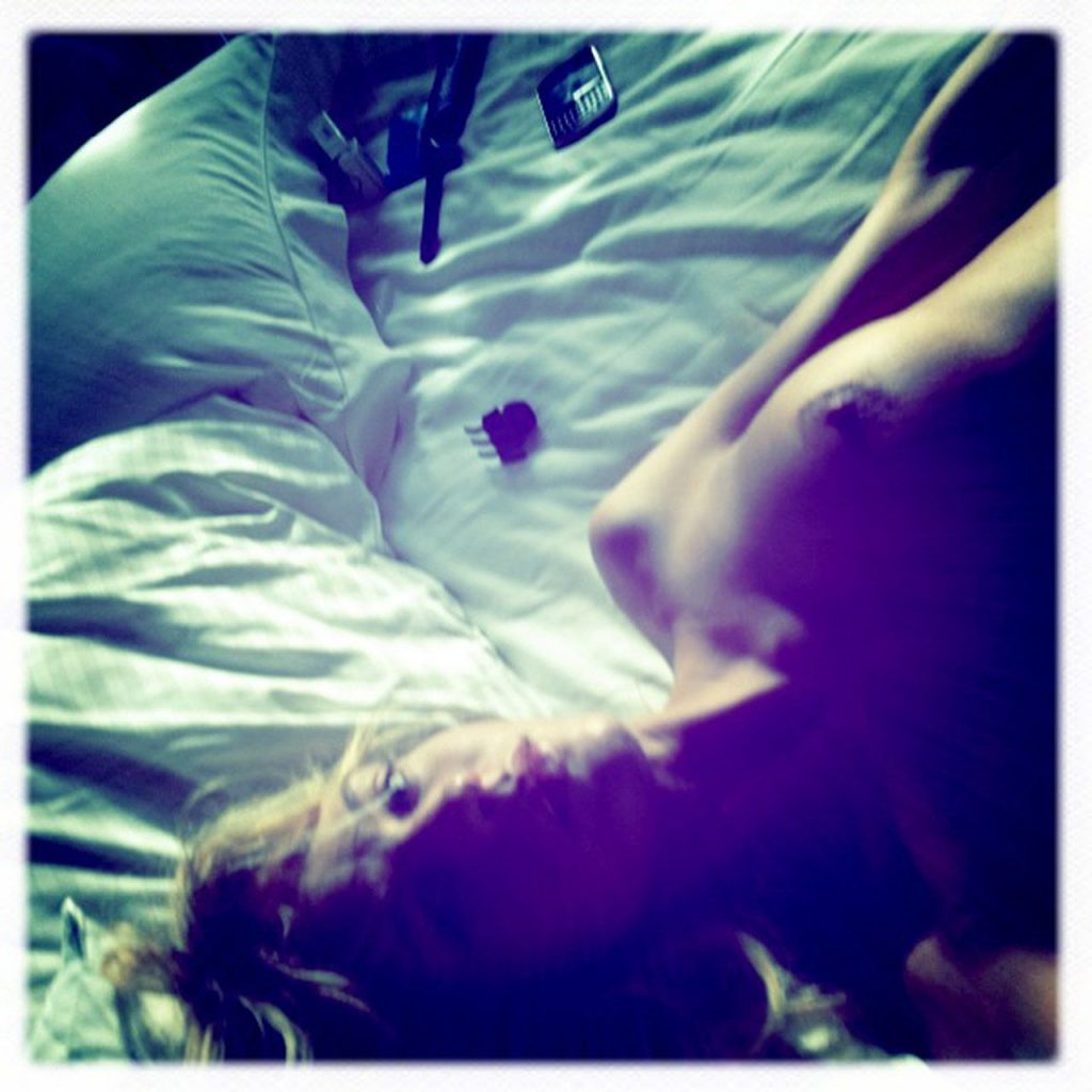 VS model Erin Heatherton is rolling over on top of Ali Larter in bed while topless. She shows most of her left breast as the girls talk to a guy who opens the door on them. Ali is wearing a bra, and Erin can be seen in a pair of purple panties.
