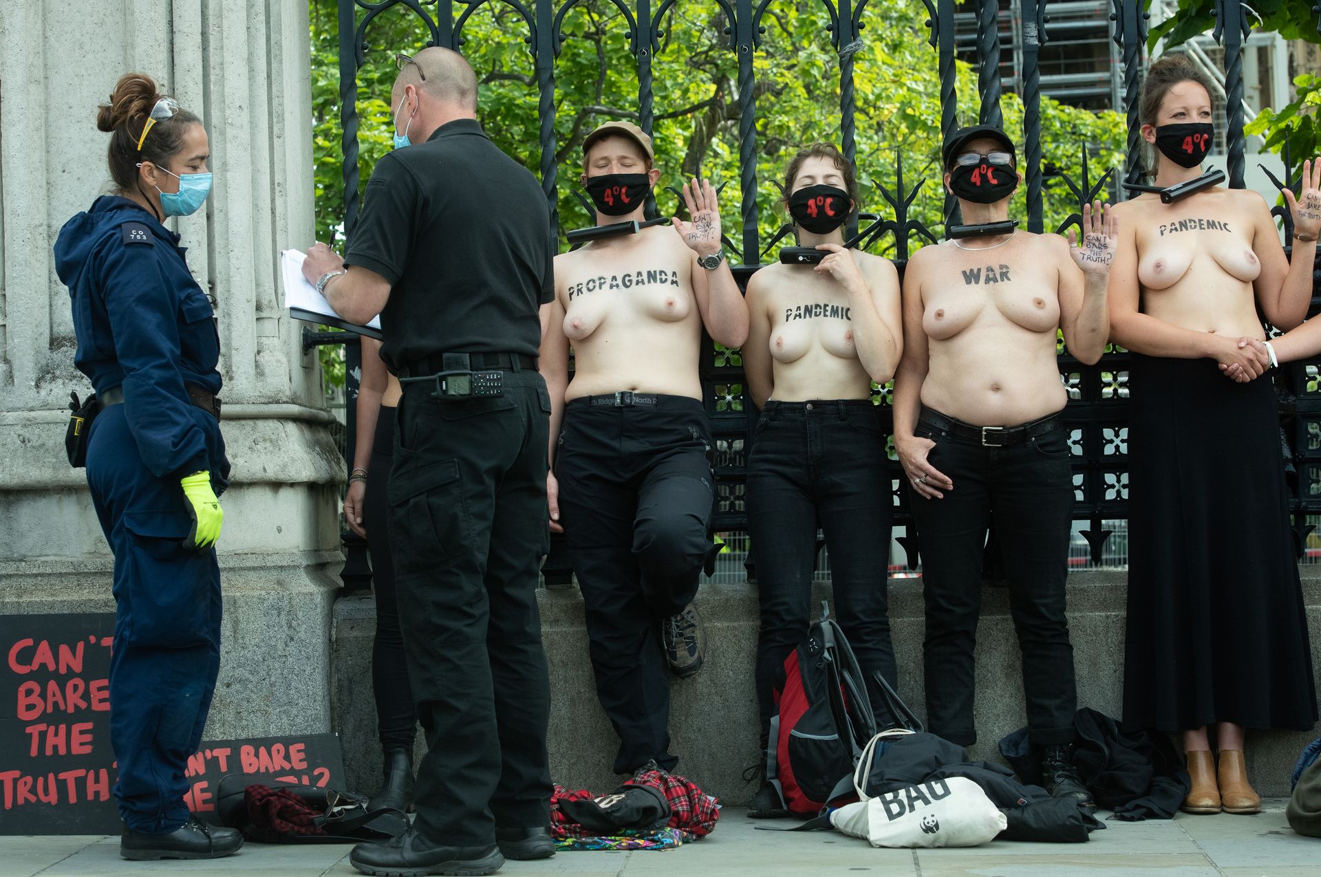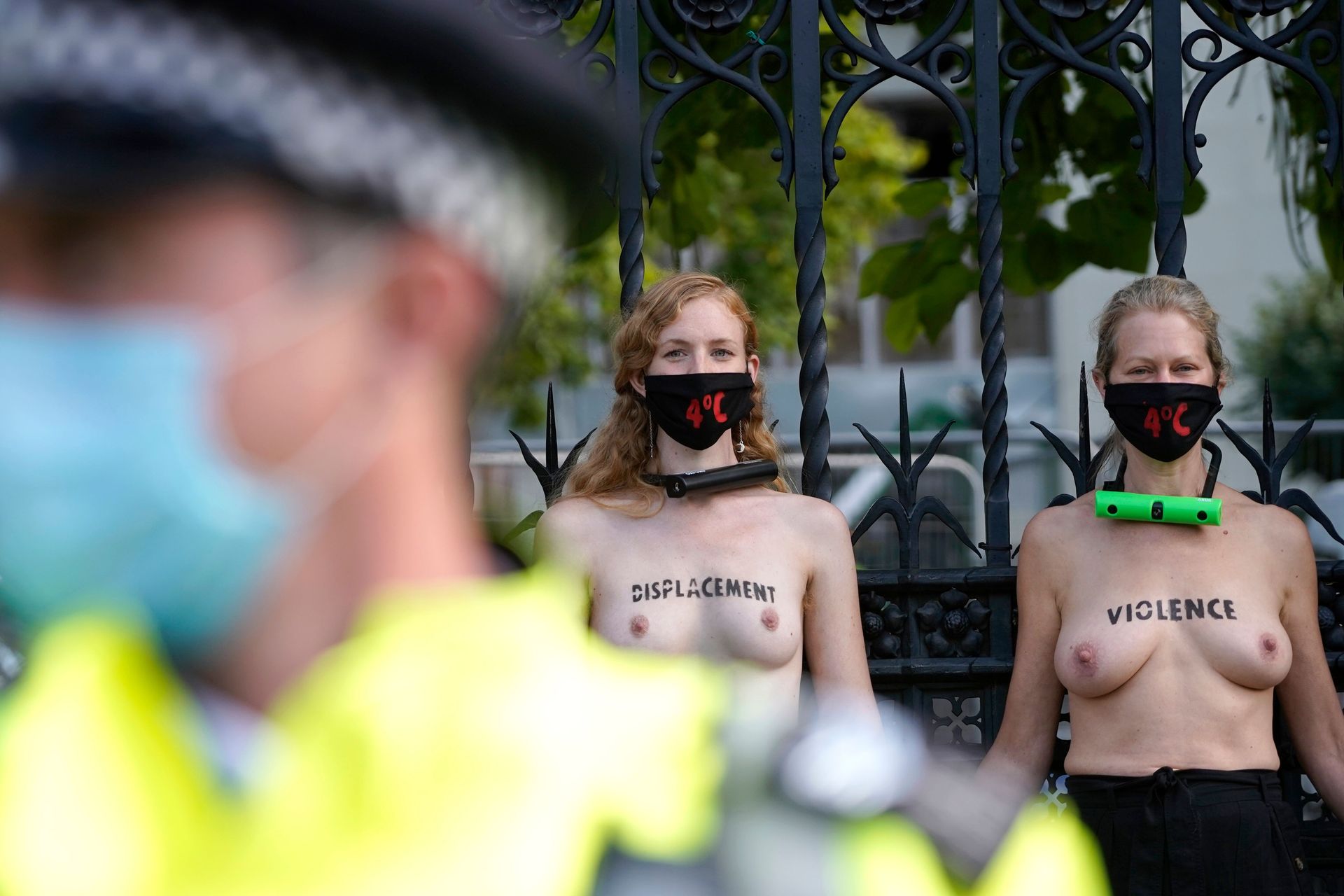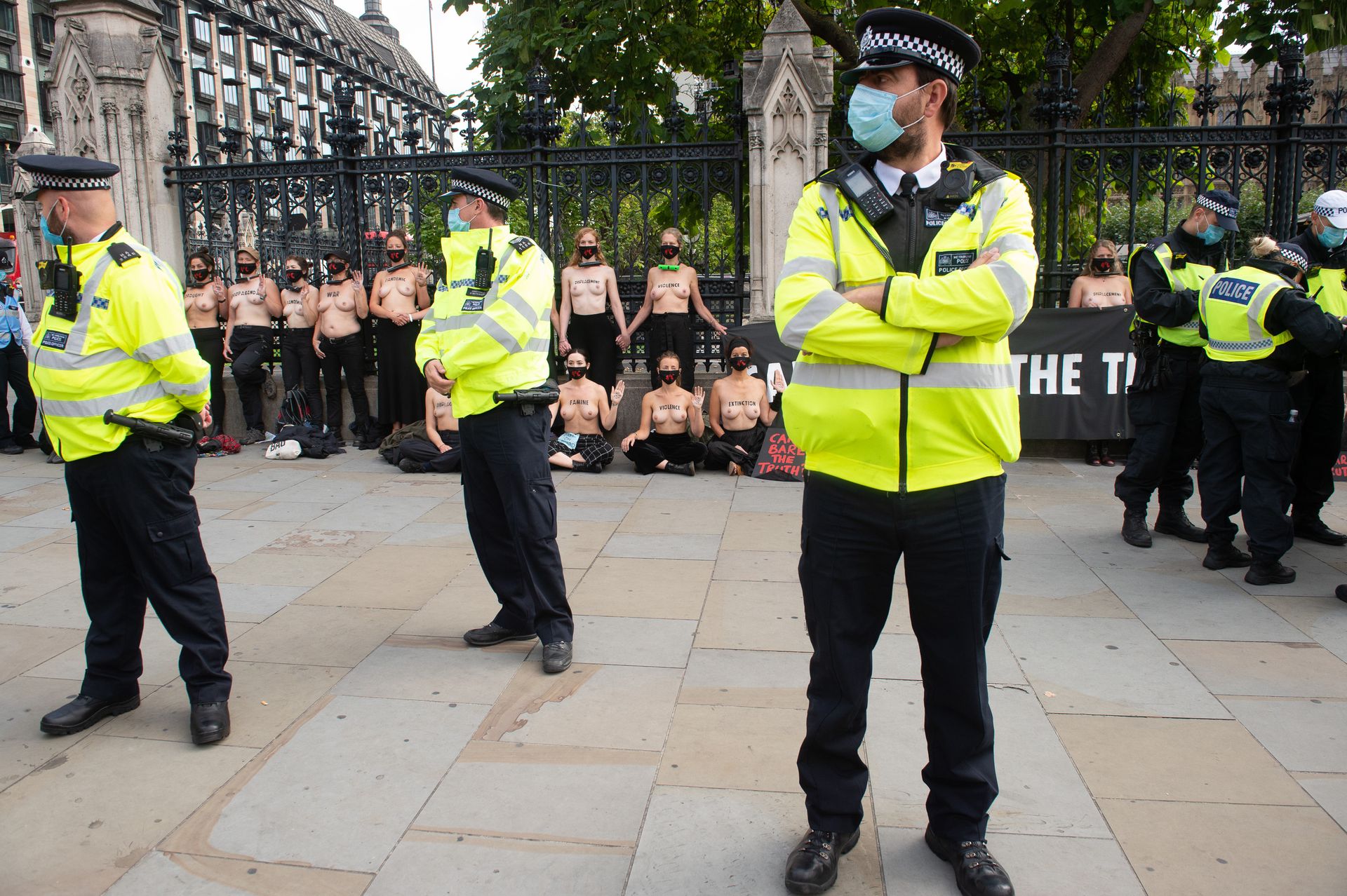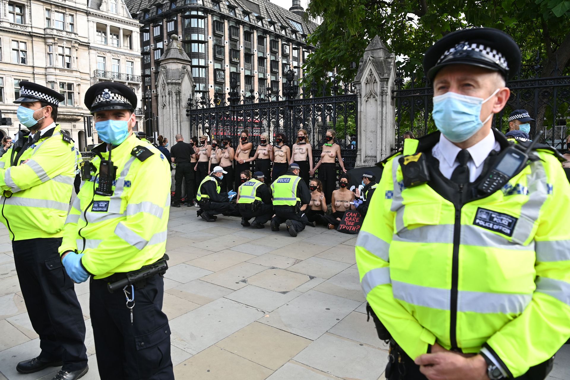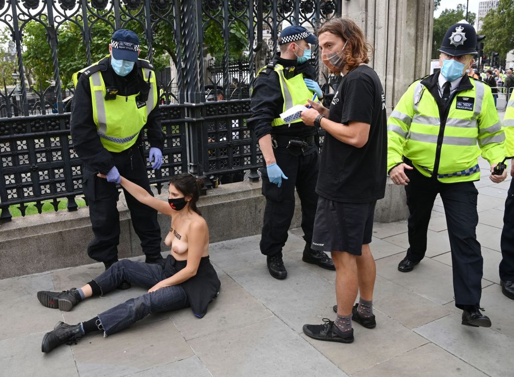 Activistas topless del grupo climático Extinction Rebellion son vigilados por policías después de haberse encadenado a las barandillas en una manifestación frente al parlamento del Reino Unido en el centro de Londres, en el último día de su nueva serie de “rebeliones masivas”. Los manifestantes por el cambio climático han realizado 10 días de protestas, llevadas a cabo en todo el país por el grupo activista Extinction Rebellion.