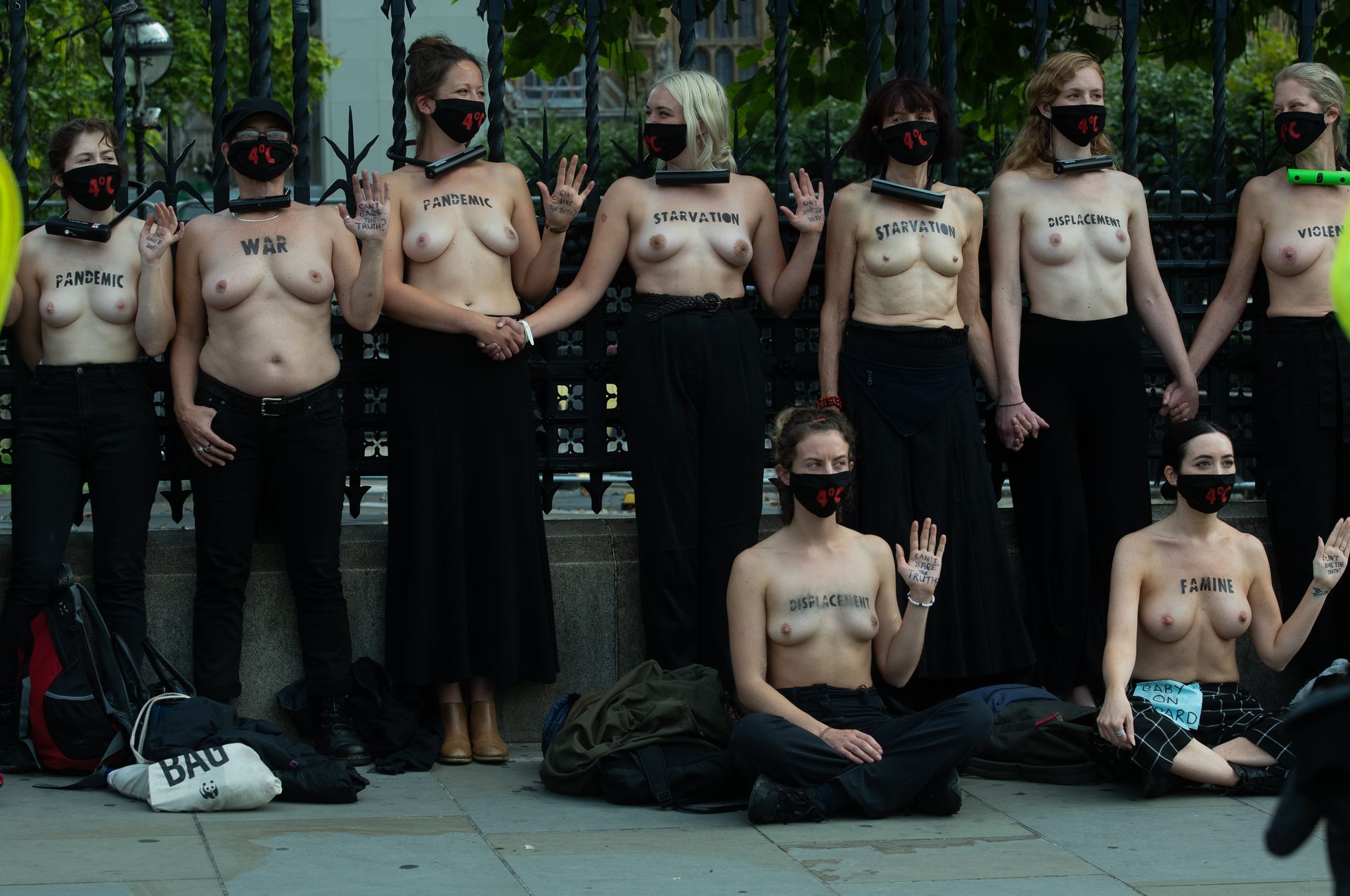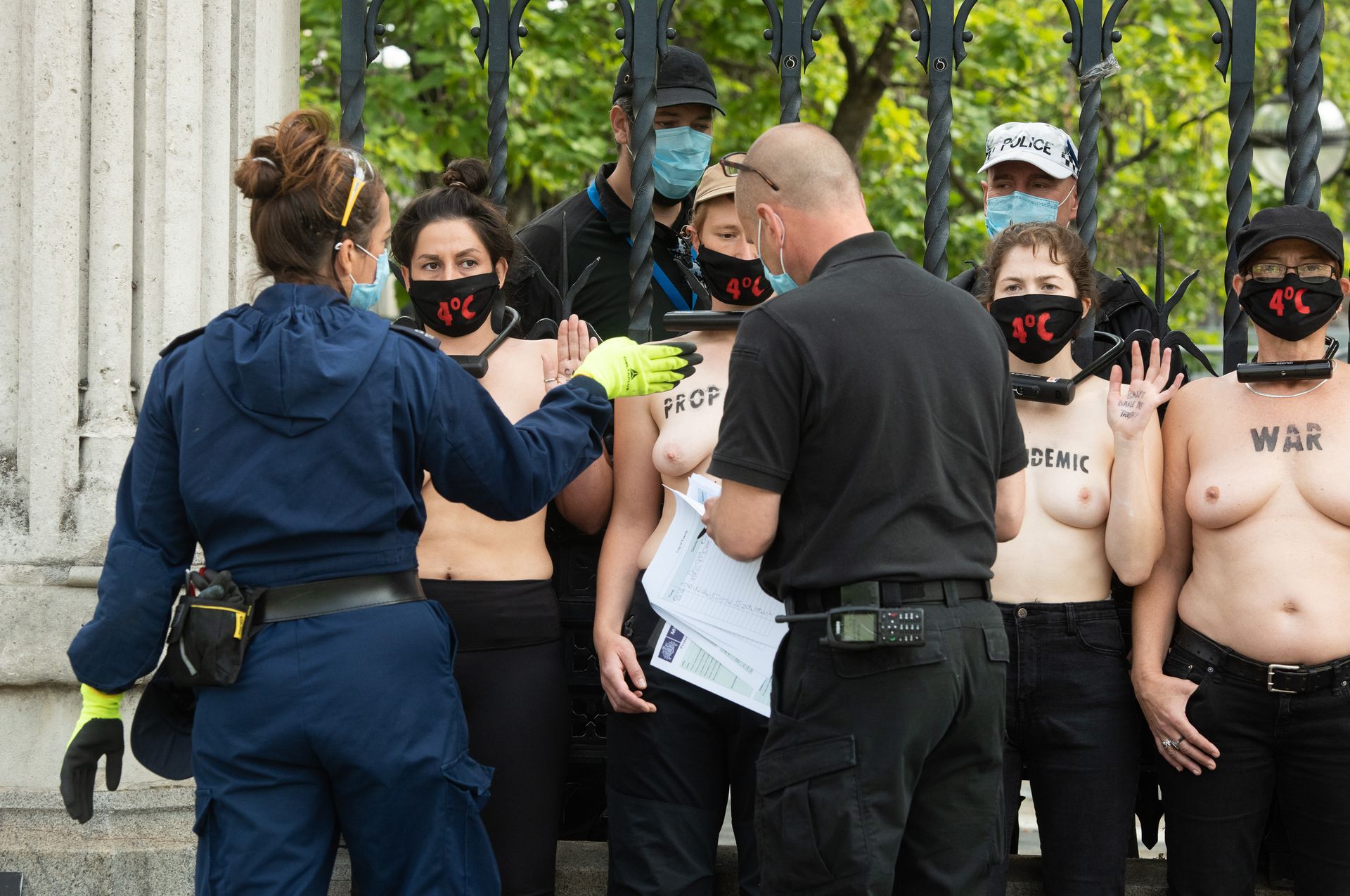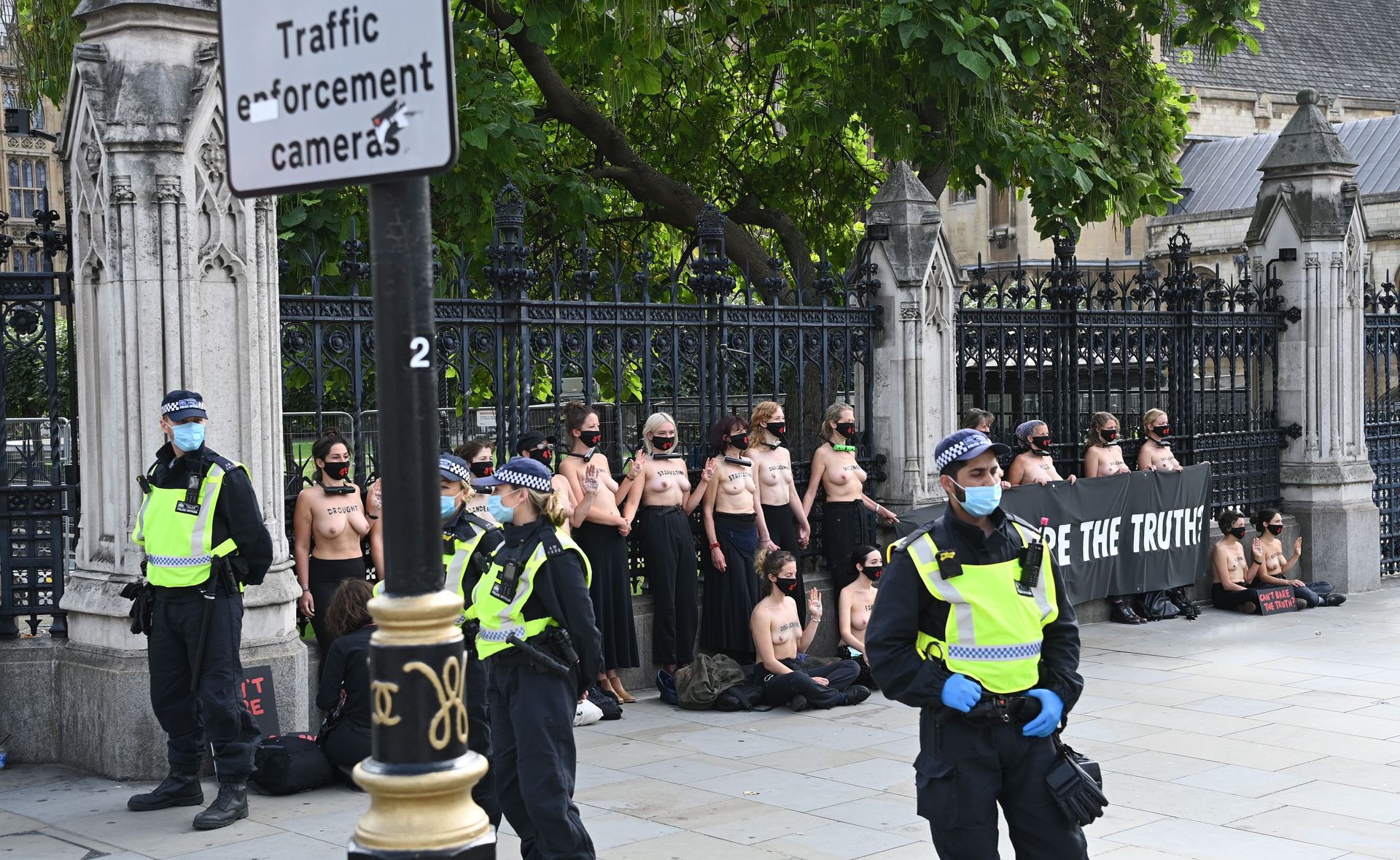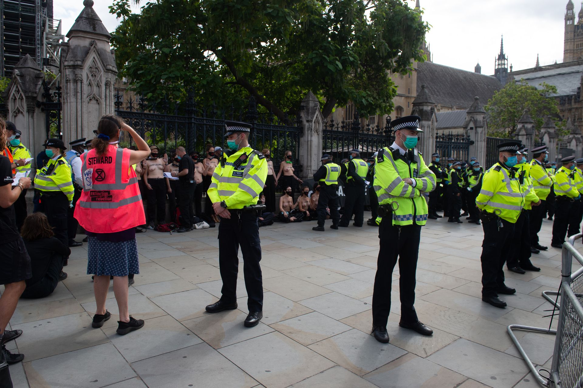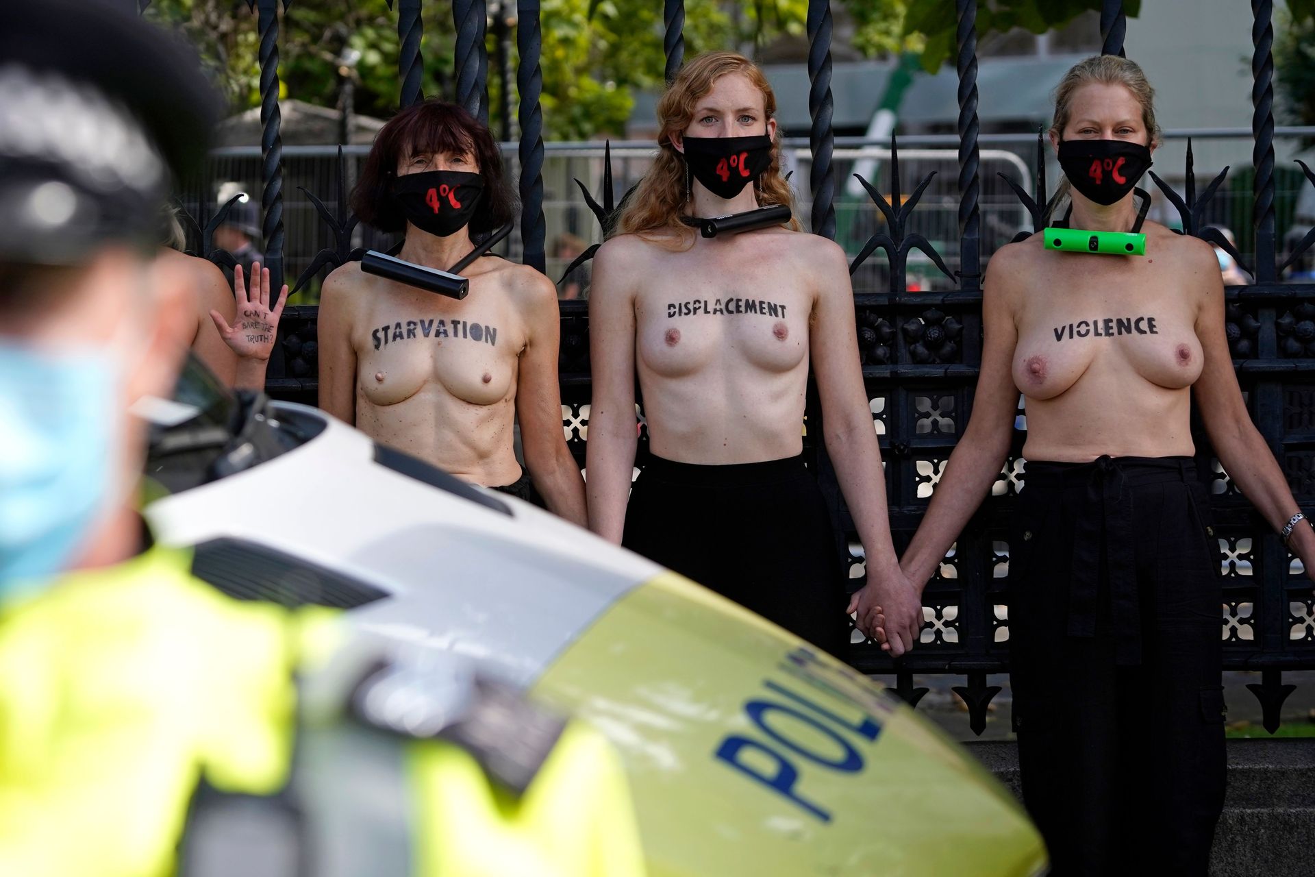 Activistas topless del grupo climático Extinction Rebellion son vigilados por policías después de haberse encadenado a las barandillas en una manifestación frente al parlamento del Reino Unido en el centro de Londres, en el último día de su nueva serie de “rebeliones masivas”. Los manifestantes por el cambio climático han realizado 10 días de protestas, llevadas a cabo en todo el país por el grupo activista Extinction Rebellion.