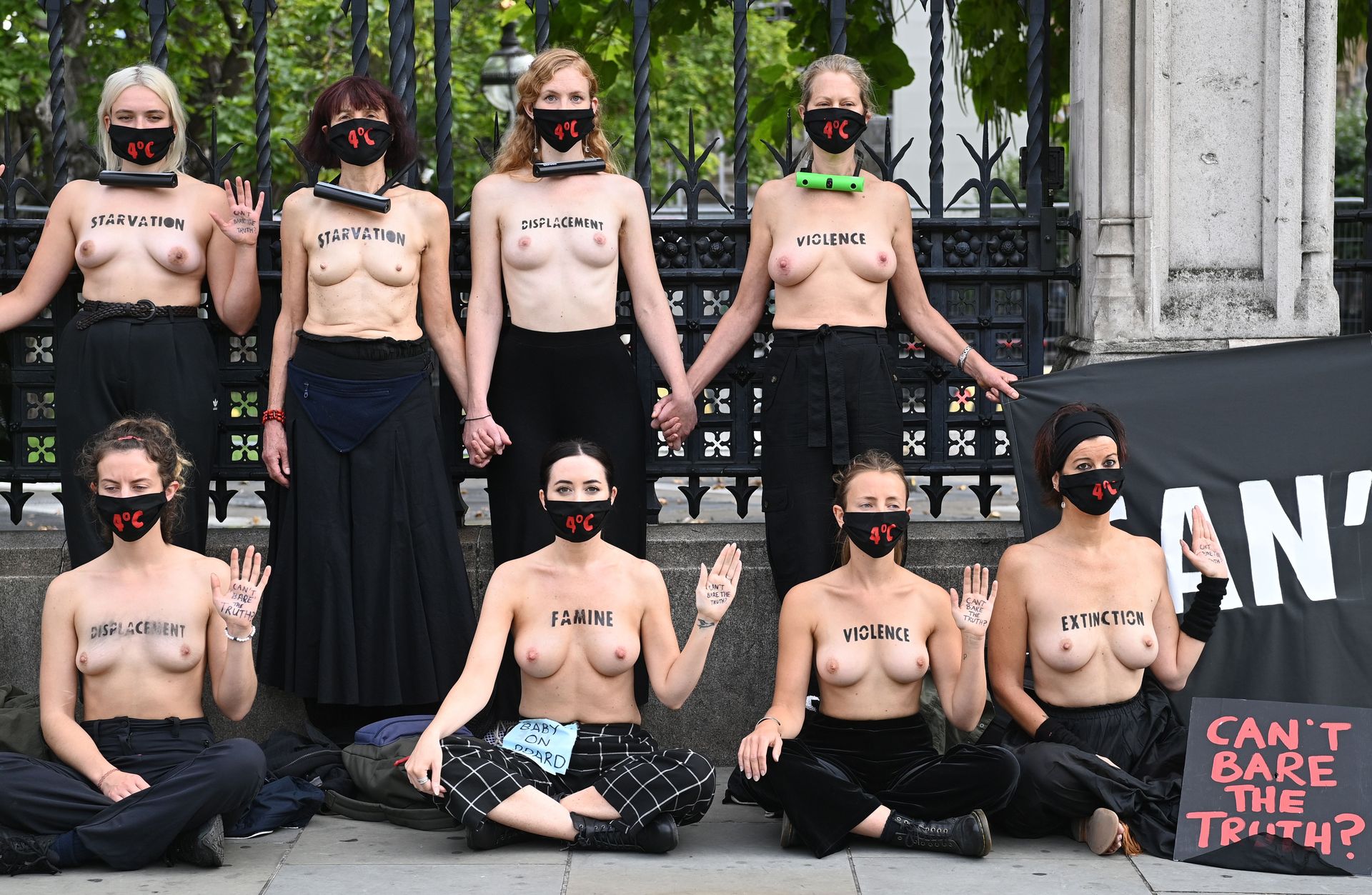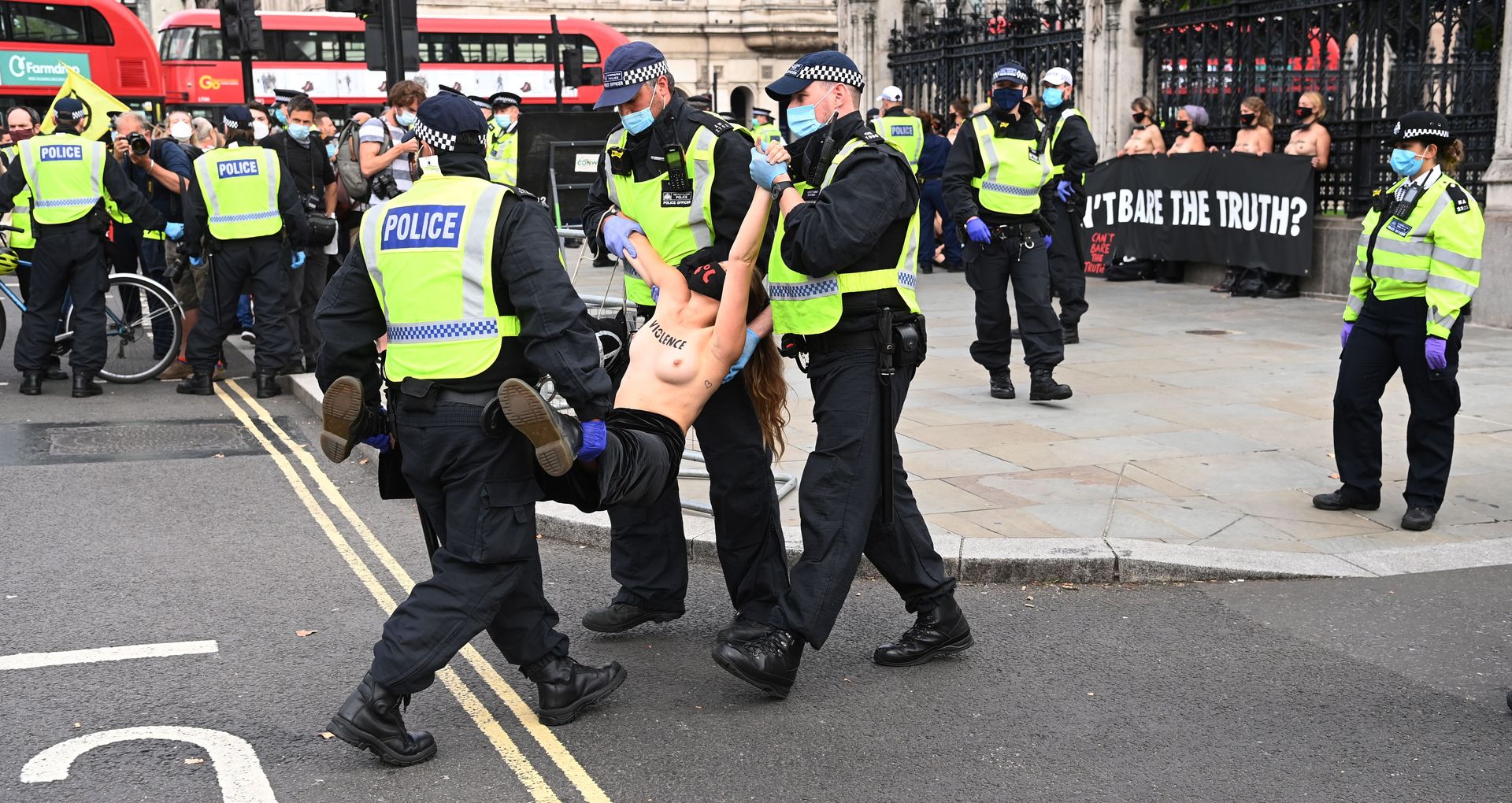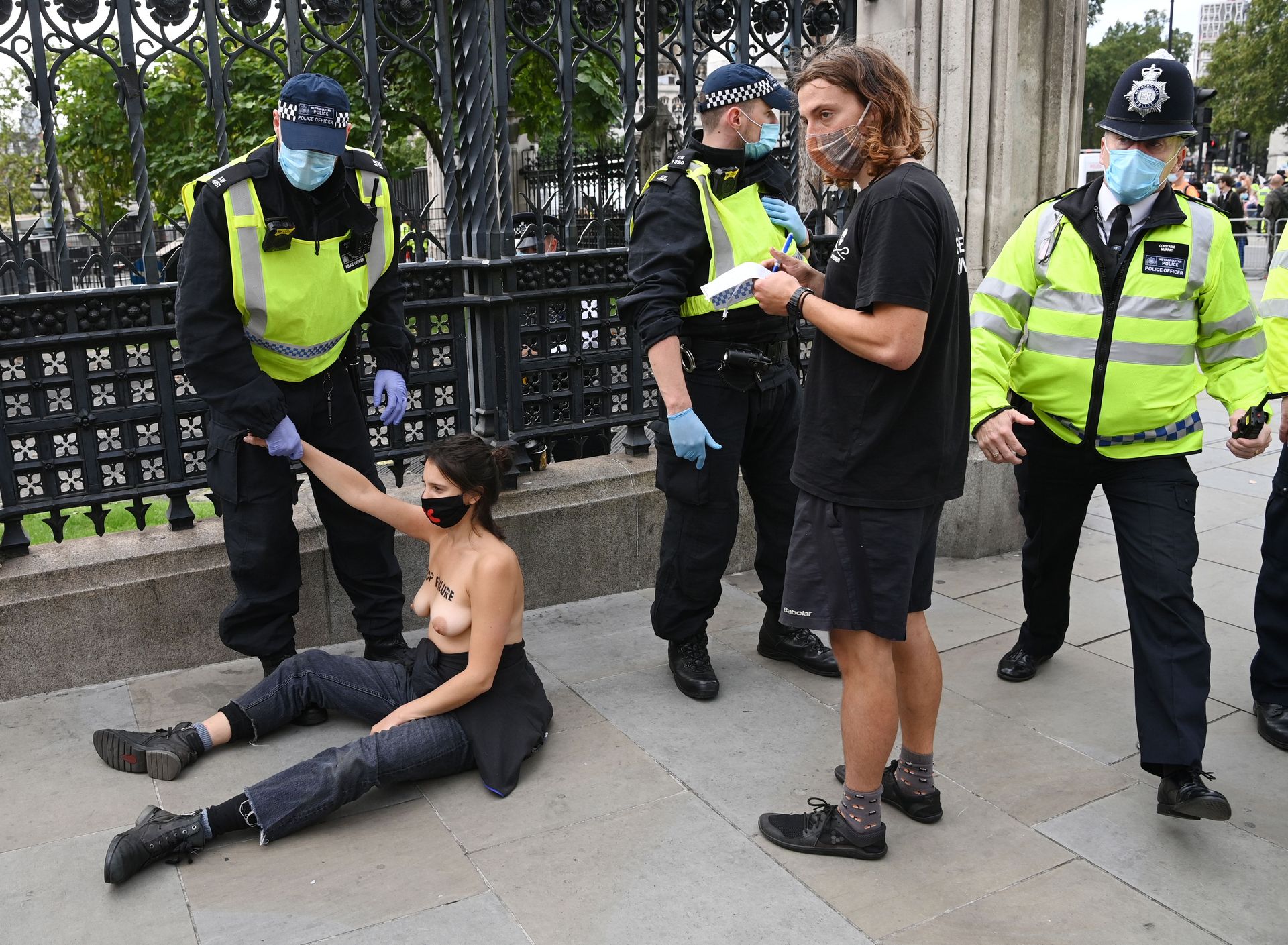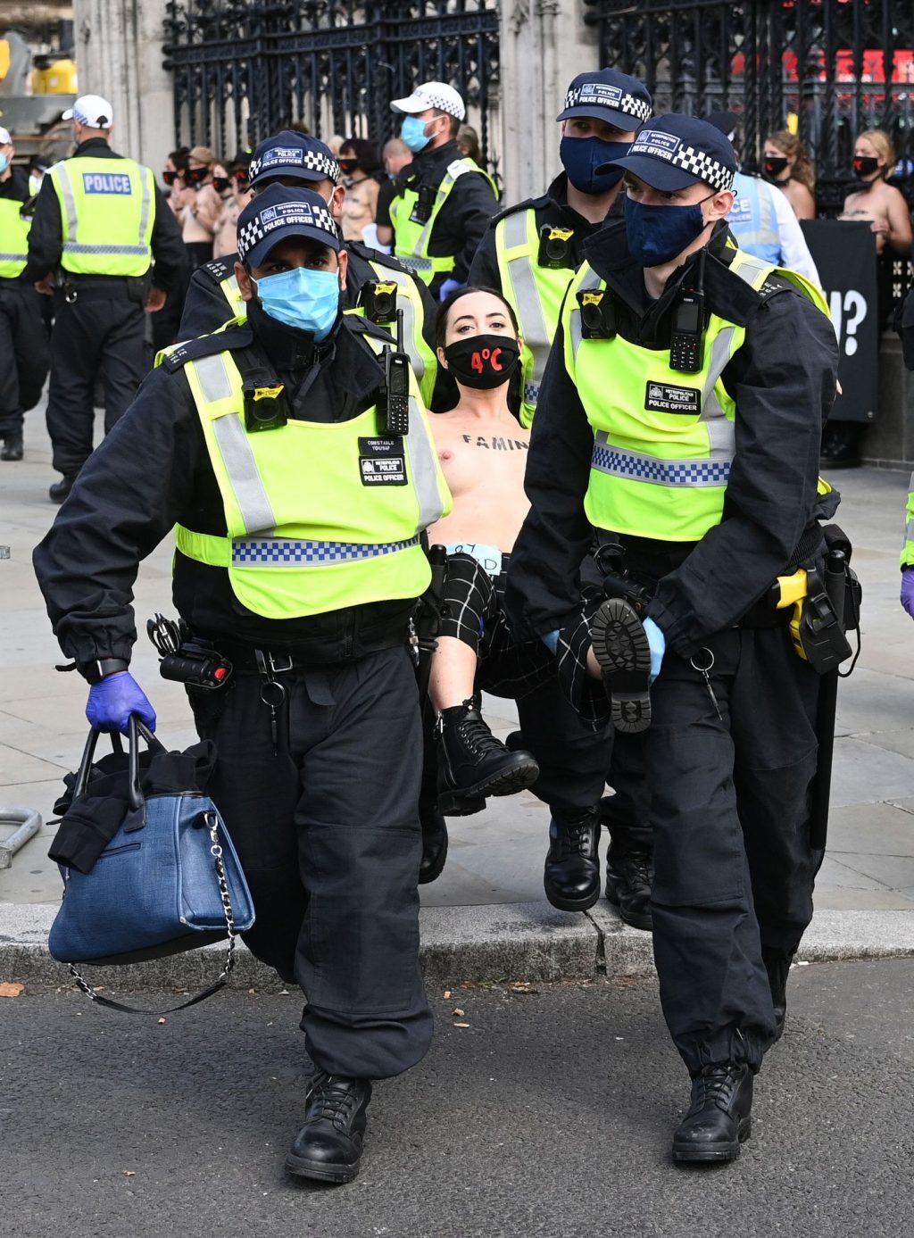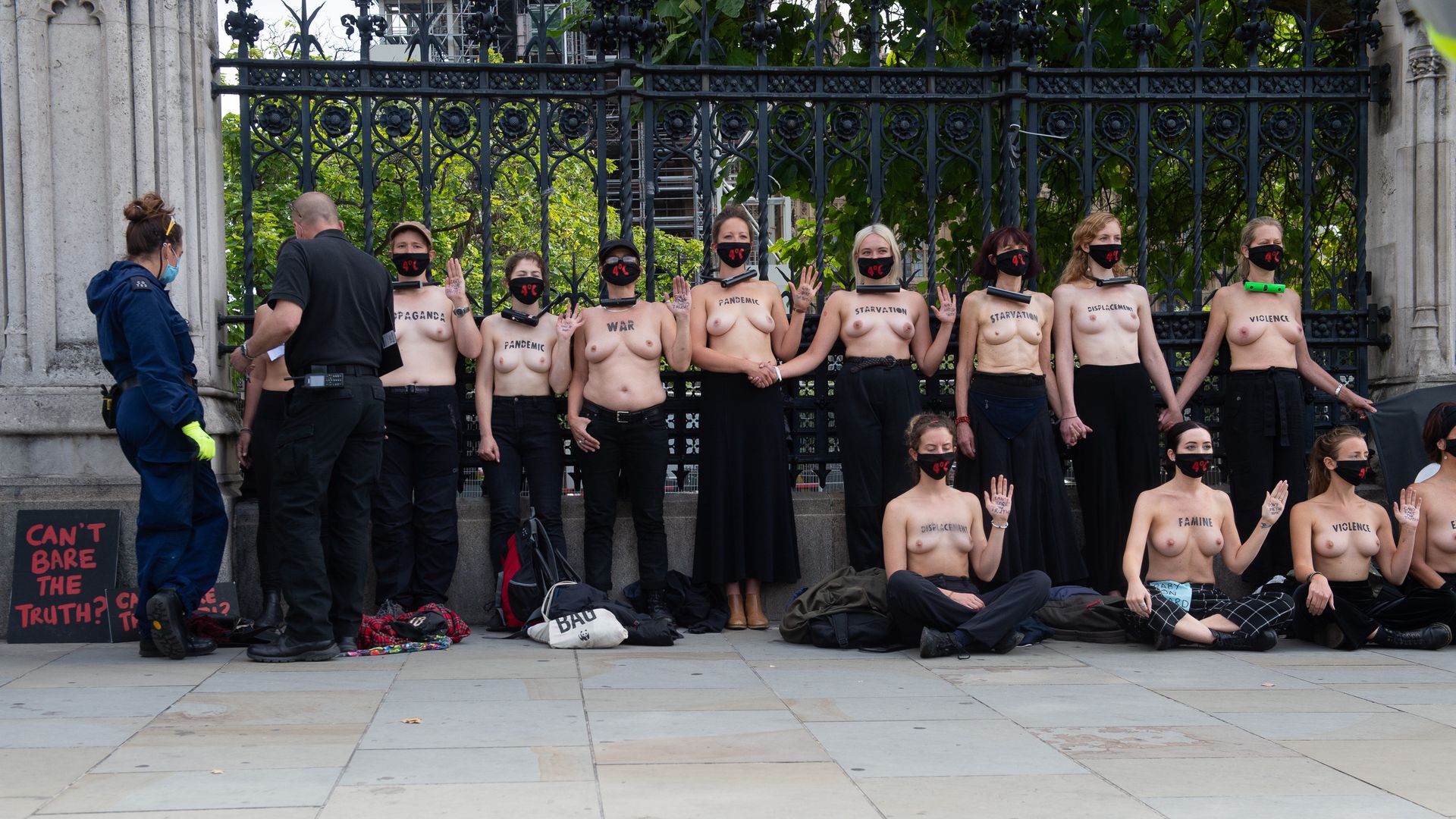 Activistas topless del grupo climático Extinction Rebellion son vigilados por policías después de haberse encadenado a las barandillas en una manifestación frente al parlamento del Reino Unido en el centro de Londres, en el último día de su nueva serie de “rebeliones masivas”. Los manifestantes por el cambio climático han realizado 10 días de protestas, llevadas a cabo en todo el país por el grupo activista Extinction Rebellion.