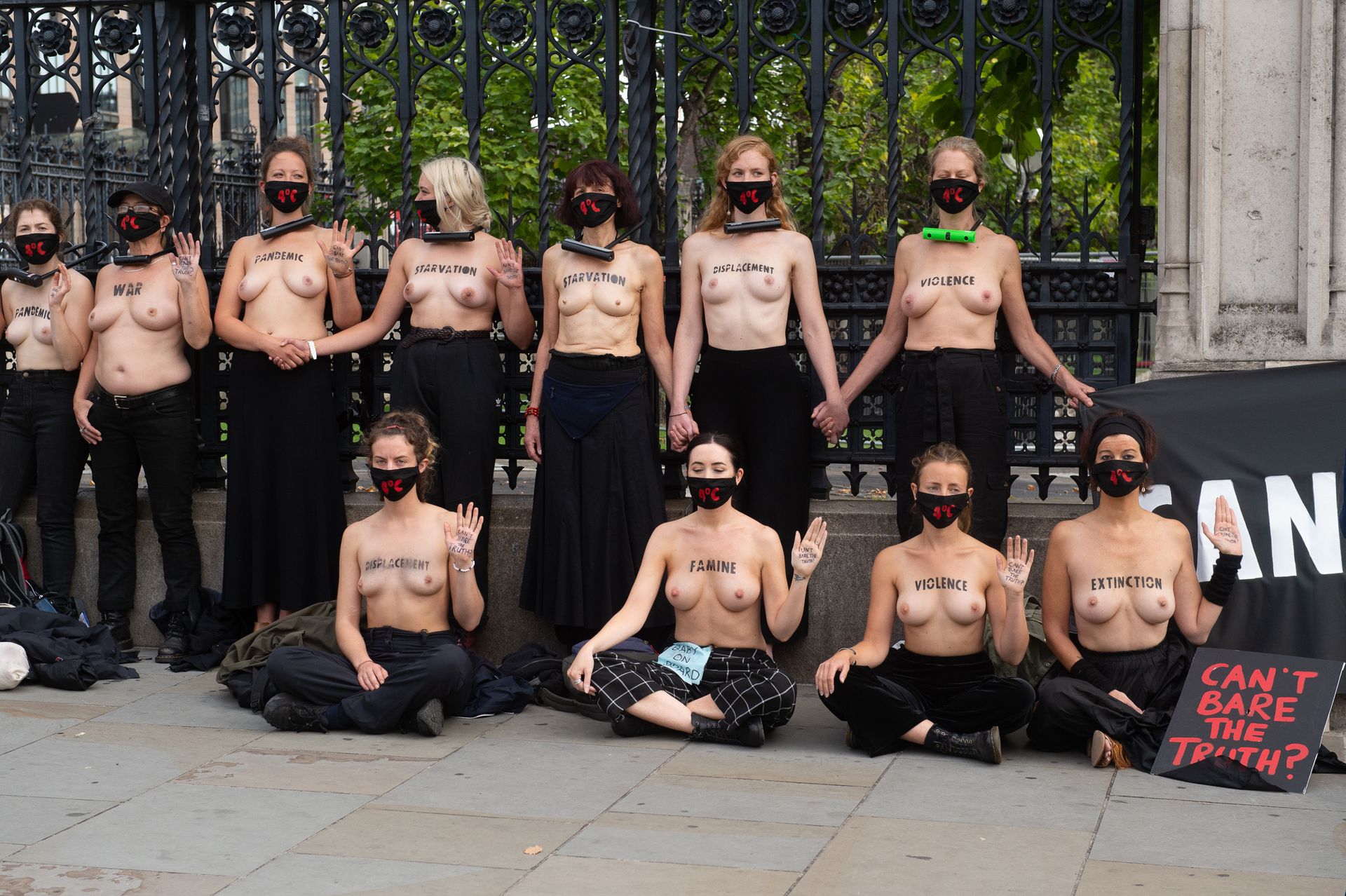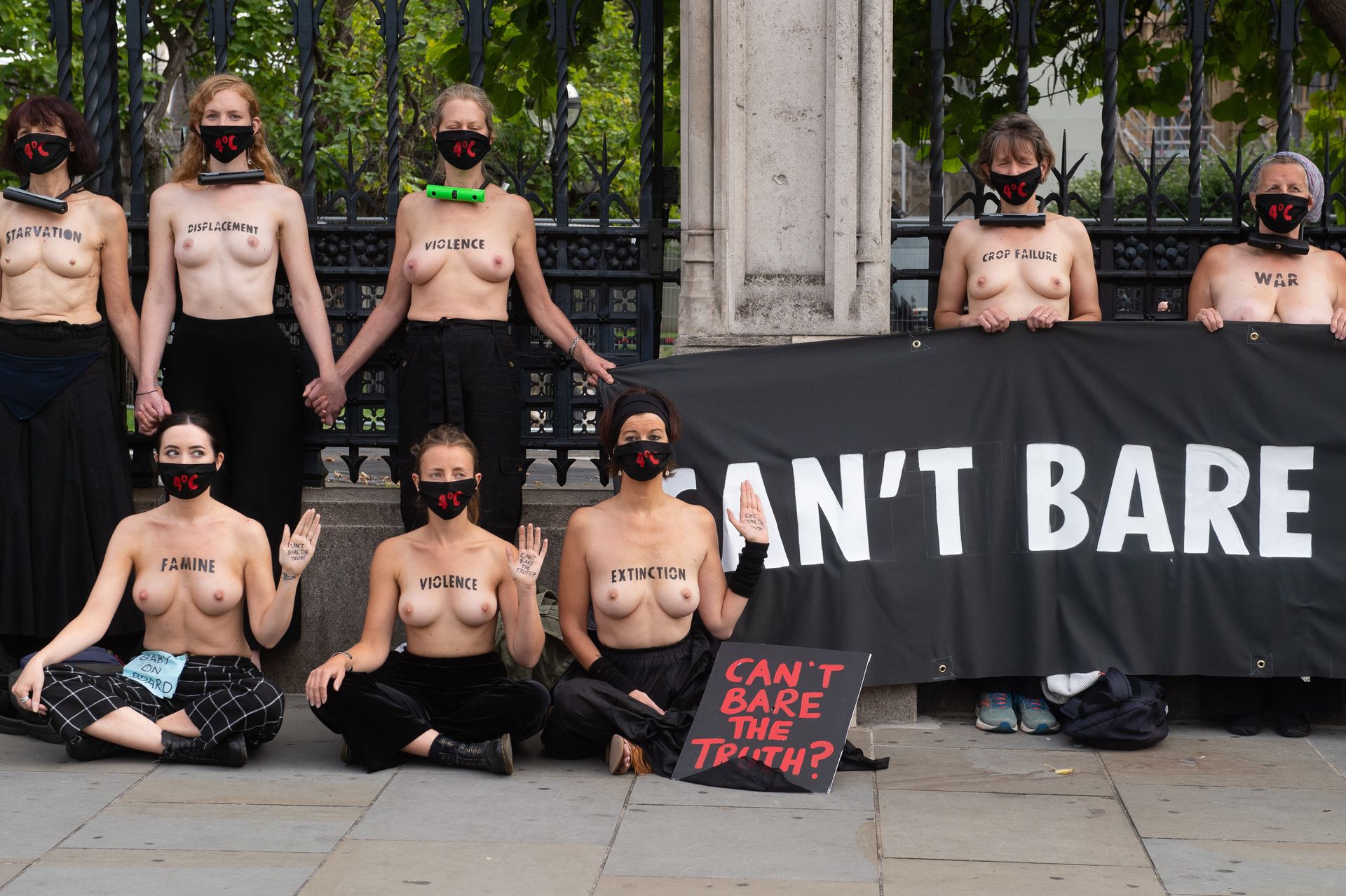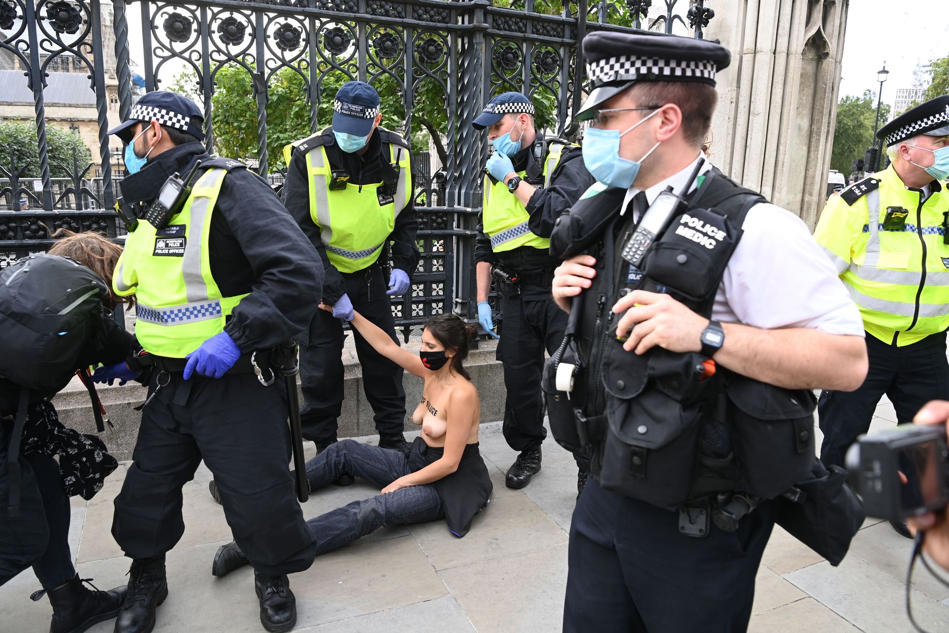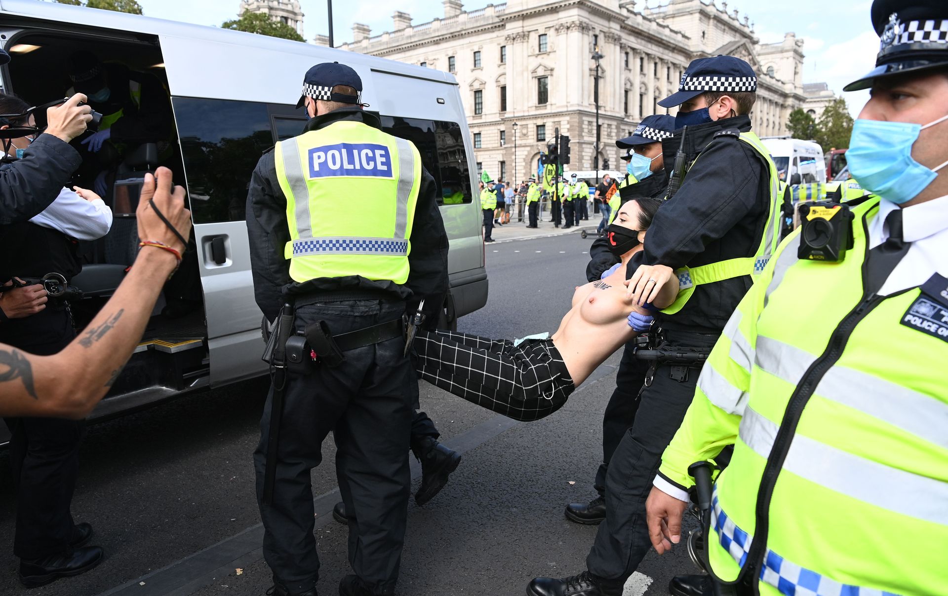 Activistas topless del grupo climático Extinction Rebellion son vigilados por policías después de haberse encadenado a las barandillas en una manifestación frente al parlamento del Reino Unido en el centro de Londres, en el último día de su nueva serie de “rebeliones masivas”. Los manifestantes por el cambio climático han realizado 10 días de protestas, llevadas a cabo en todo el país por el grupo activista Extinction Rebellion.