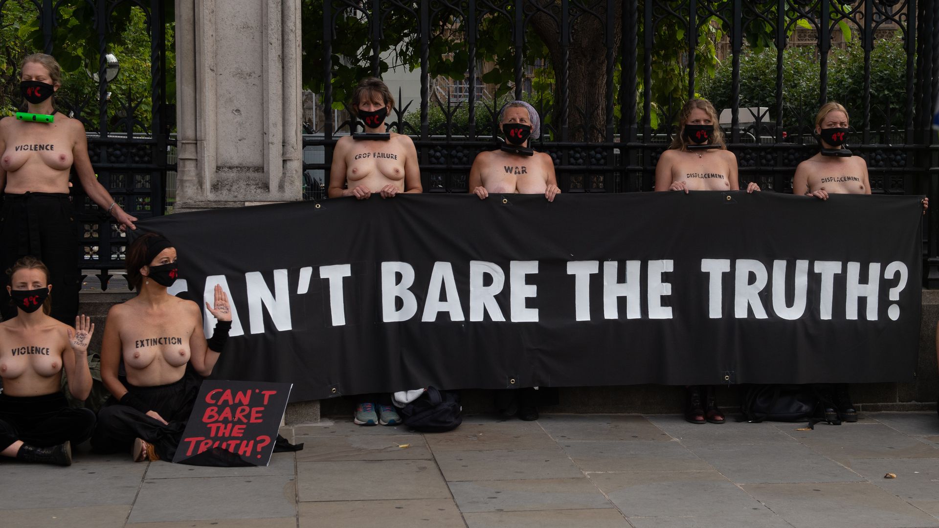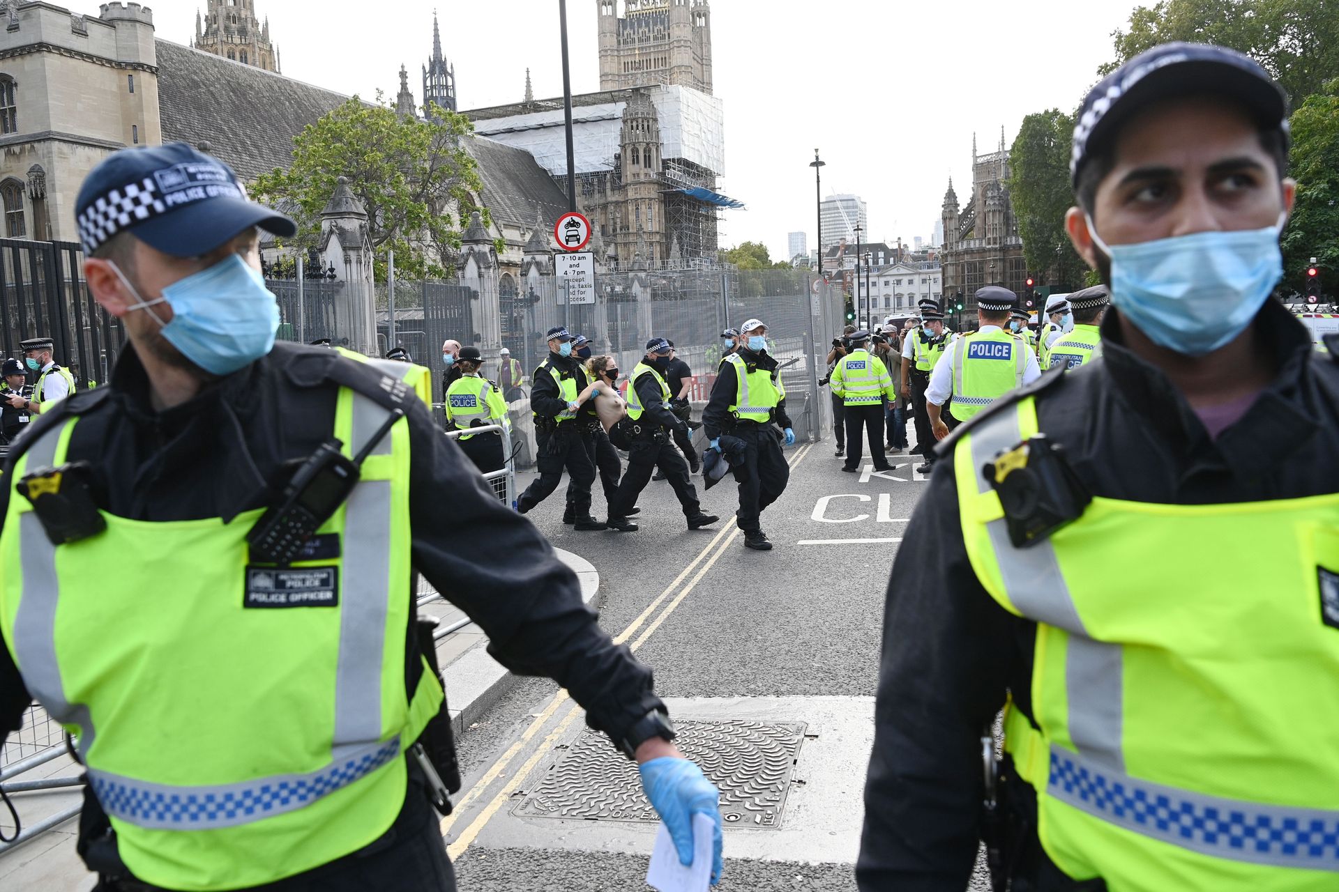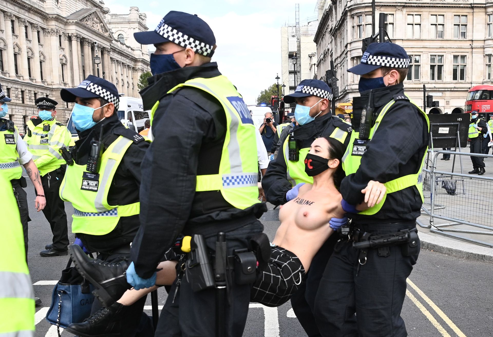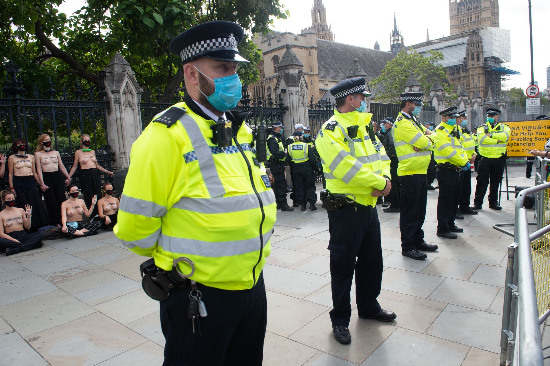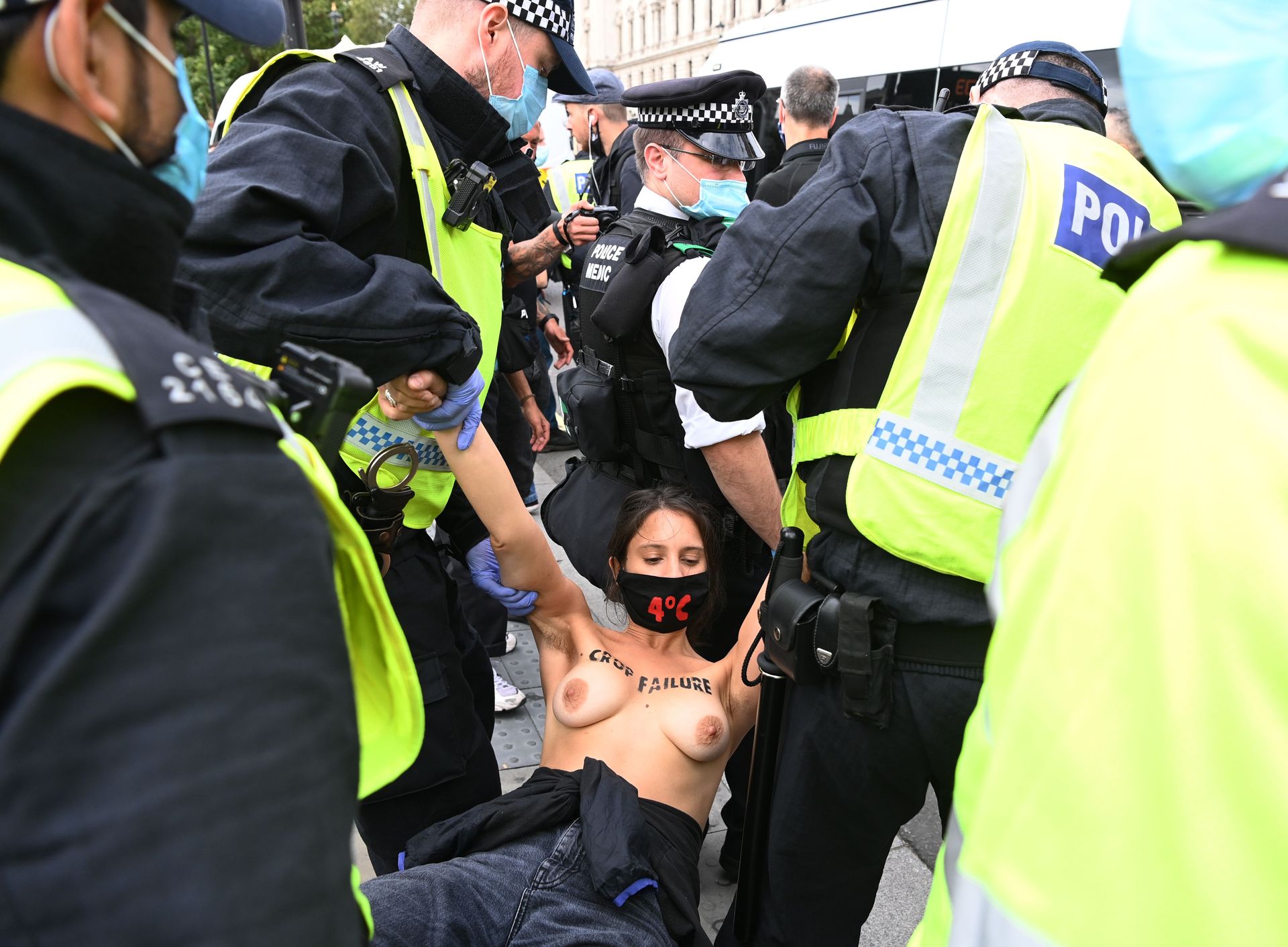 Activistas topless del grupo climático Extinction Rebellion son vigilados por policías después de haberse encadenado a las barandillas en una manifestación frente al parlamento del Reino Unido en el centro de Londres, en el último día de su nueva serie de “rebeliones masivas”. Los manifestantes por el cambio climático han realizado 10 días de protestas, llevadas a cabo en todo el país por el grupo activista Extinction Rebellion.