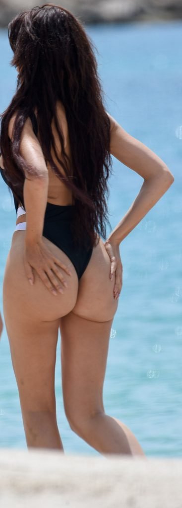 Farrah Abraham (26) llega a la playa en Cannes en el hotel Martinez, vistiendo un bikini B&W de corte alto, 17/05/2018. Farrah fue vista con su hija en la playa, pareciéndose un poco a Kim Kardashian con su cabello largo y bikini tanga que deja al descubierto el trasero.