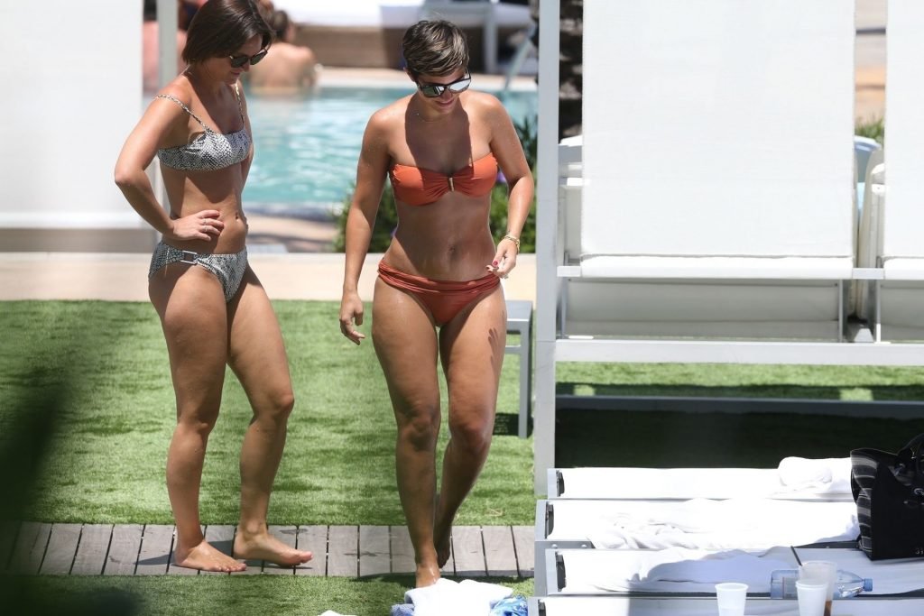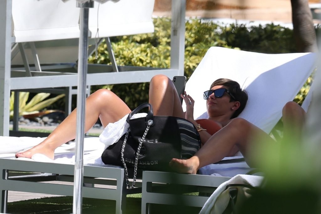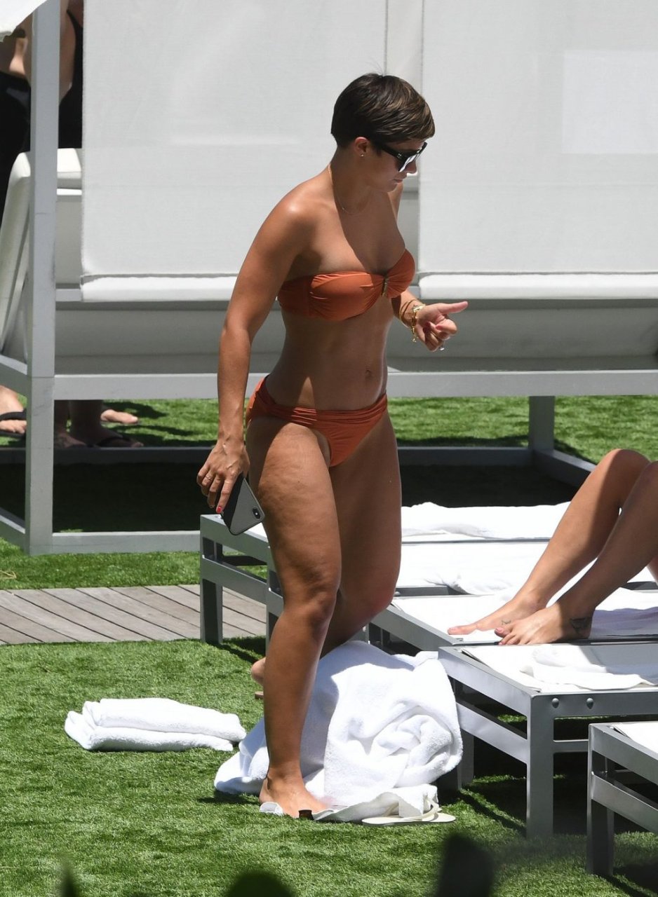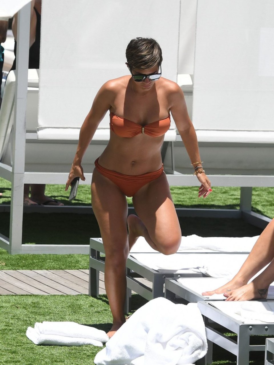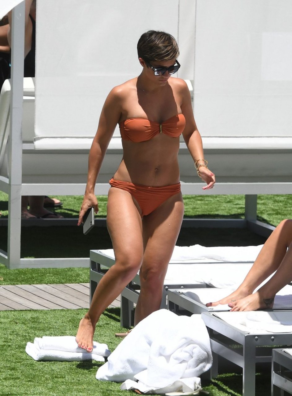 Frankie Bridge se ve pasando el rato en la piscina en Miami, 21/05/2019. Frankie luce genial con un bikini naranja mientras disfruta del sol.
