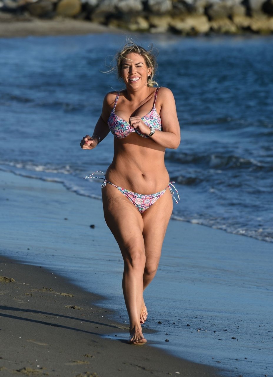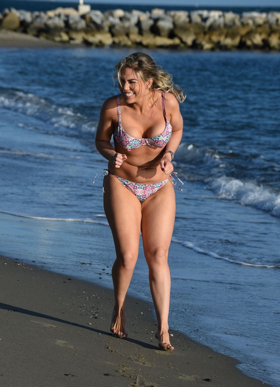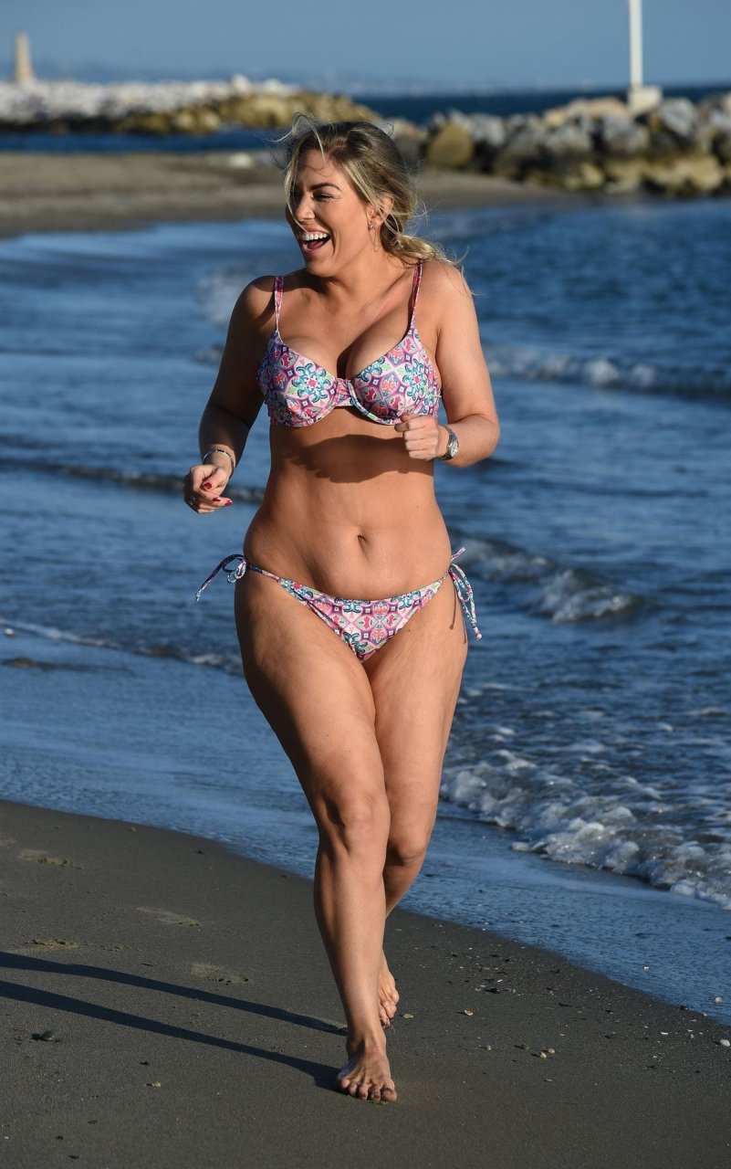 La ex estrella de reality Frankie Essex (30) muestra sus curvas y pone su cuerpo en forma mientras trota por las playas de Tenerife con su bikini multicolor y escaso durante sus vacaciones en España (2018).