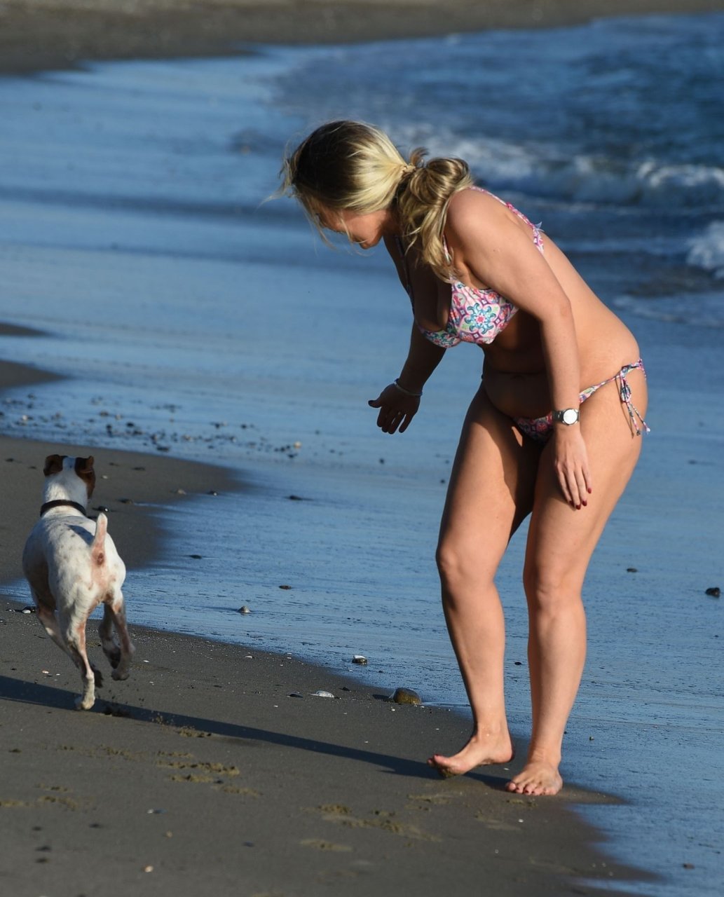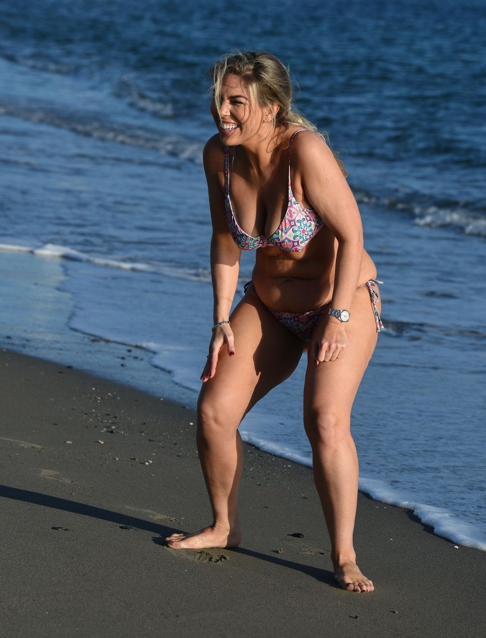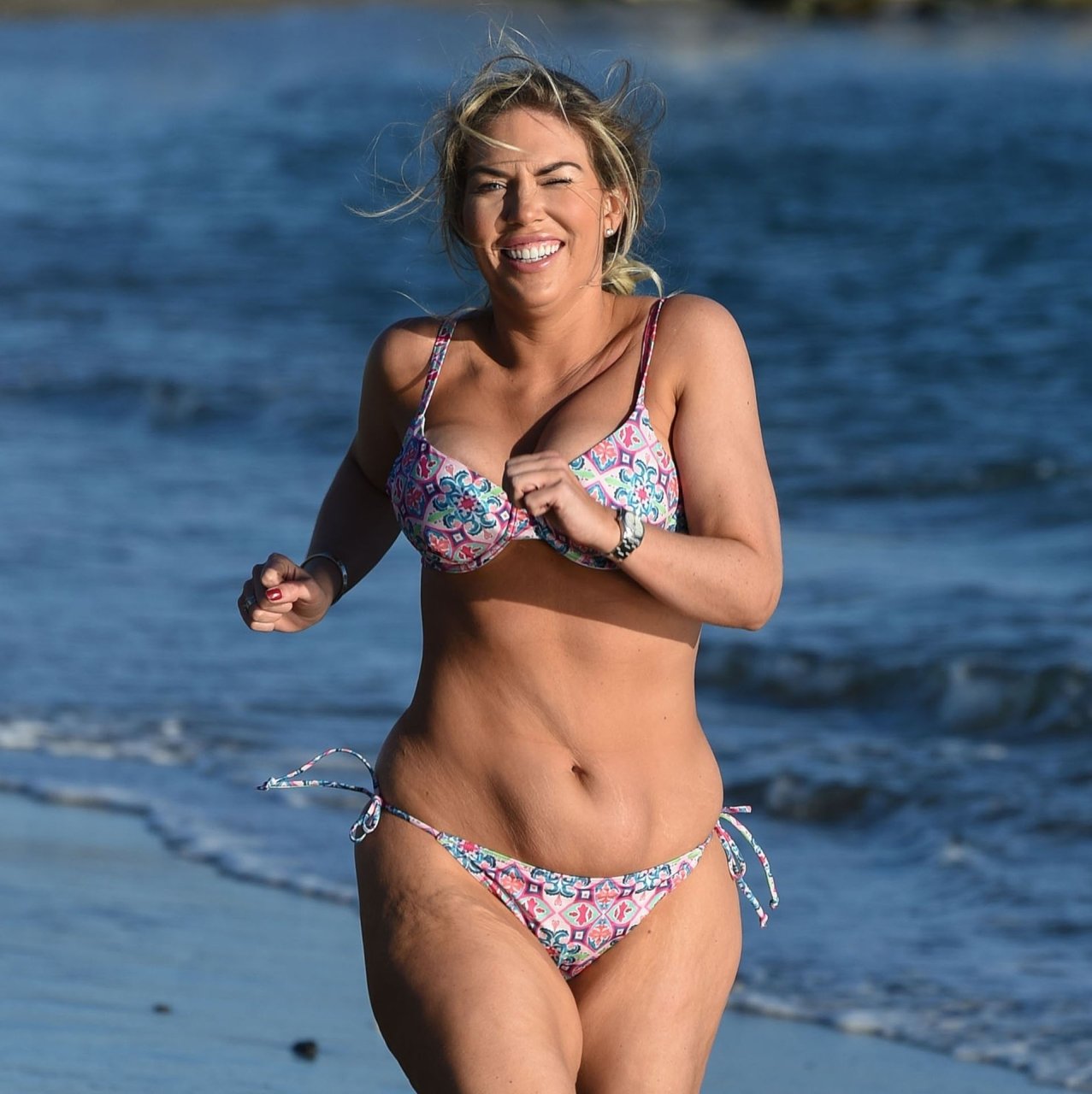 La ex estrella de reality Frankie Essex (30) muestra sus curvas y pone su cuerpo en forma mientras trota por las playas de Tenerife con su bikini multicolor y escaso durante sus vacaciones en España (2018).