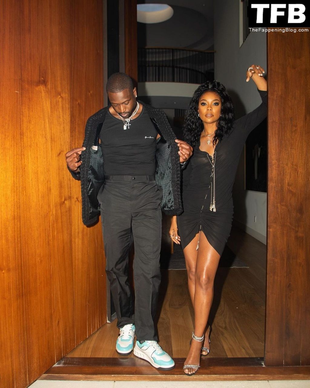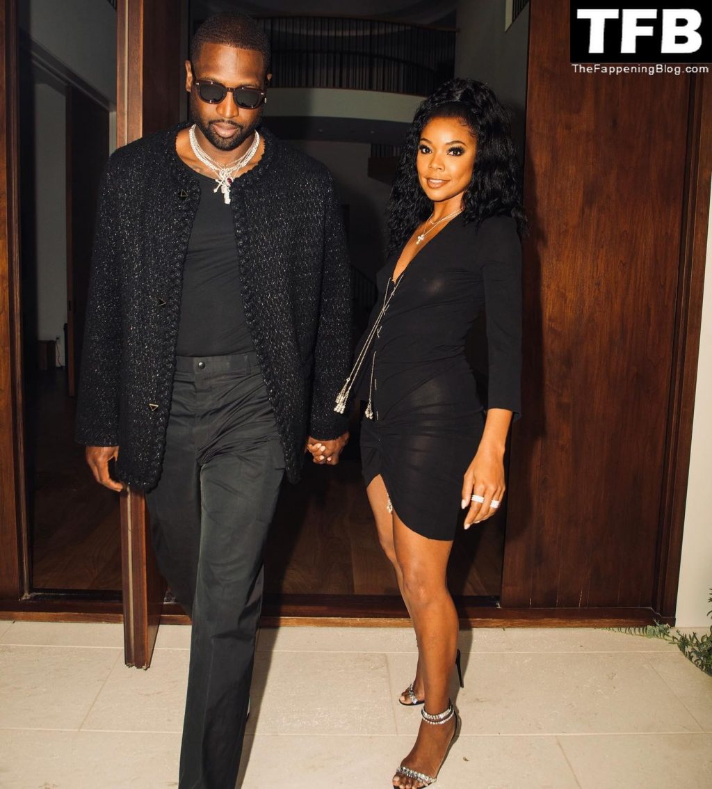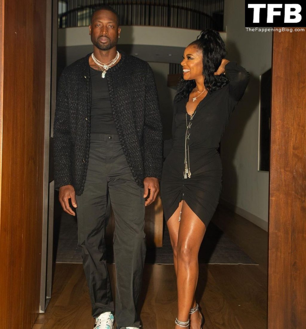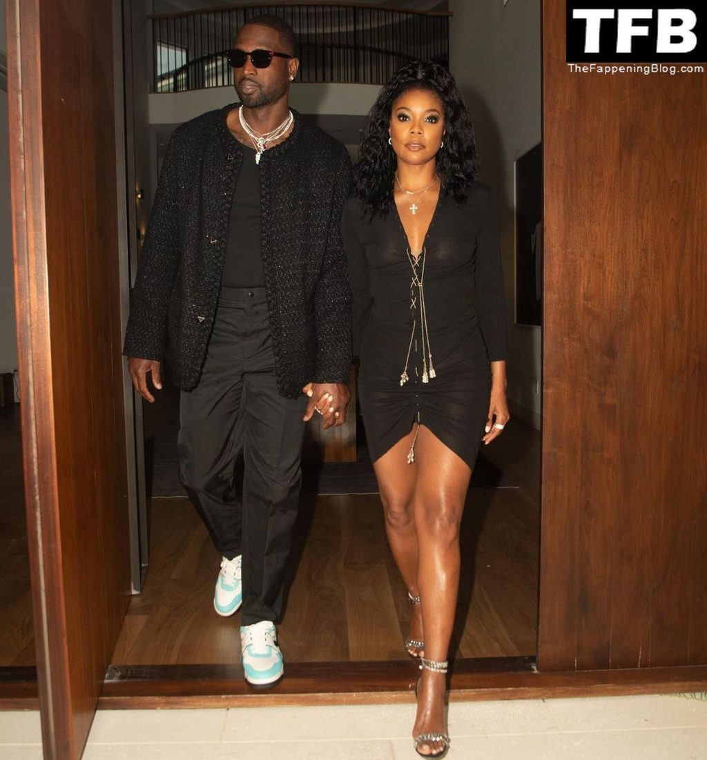 Gabrielle Union sin sostén es vista usando un vestido negro transparente mientras sale a celebrar el 40 cumpleaños de su esposo Dwyane Wade, 22/01/2022.