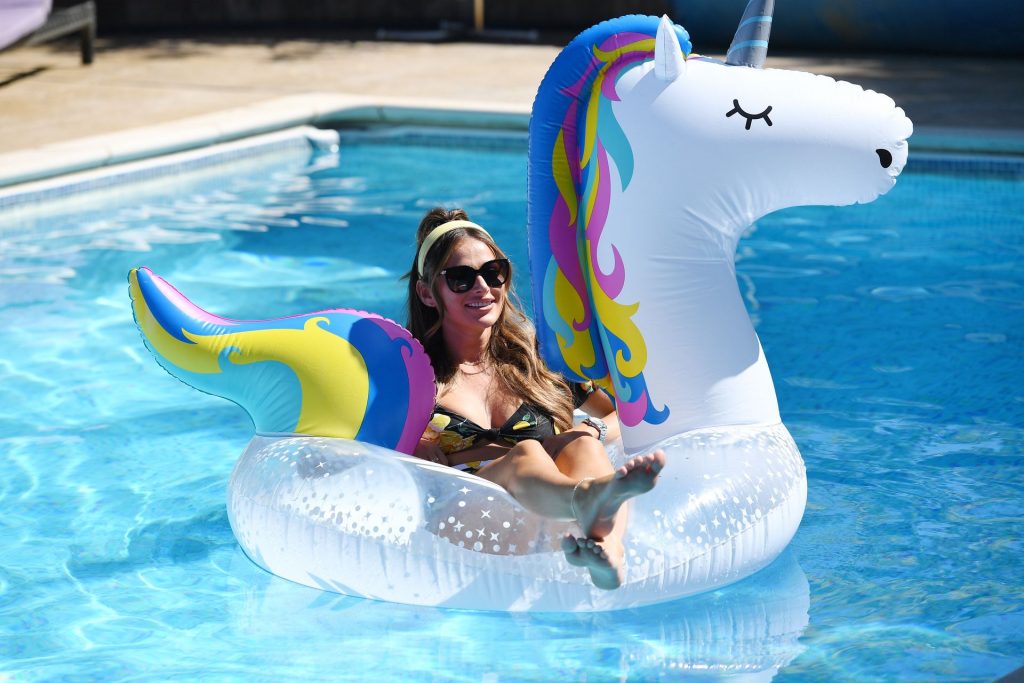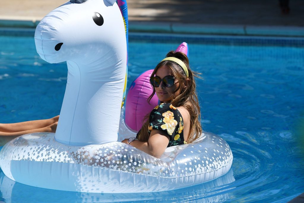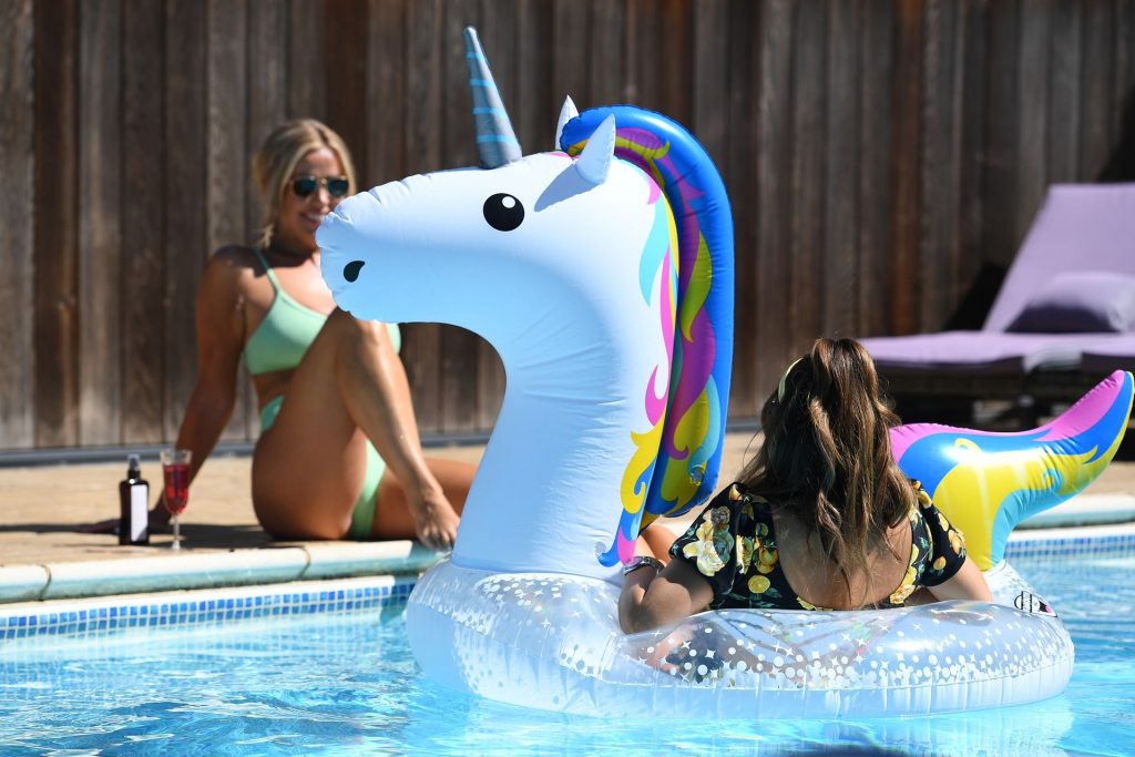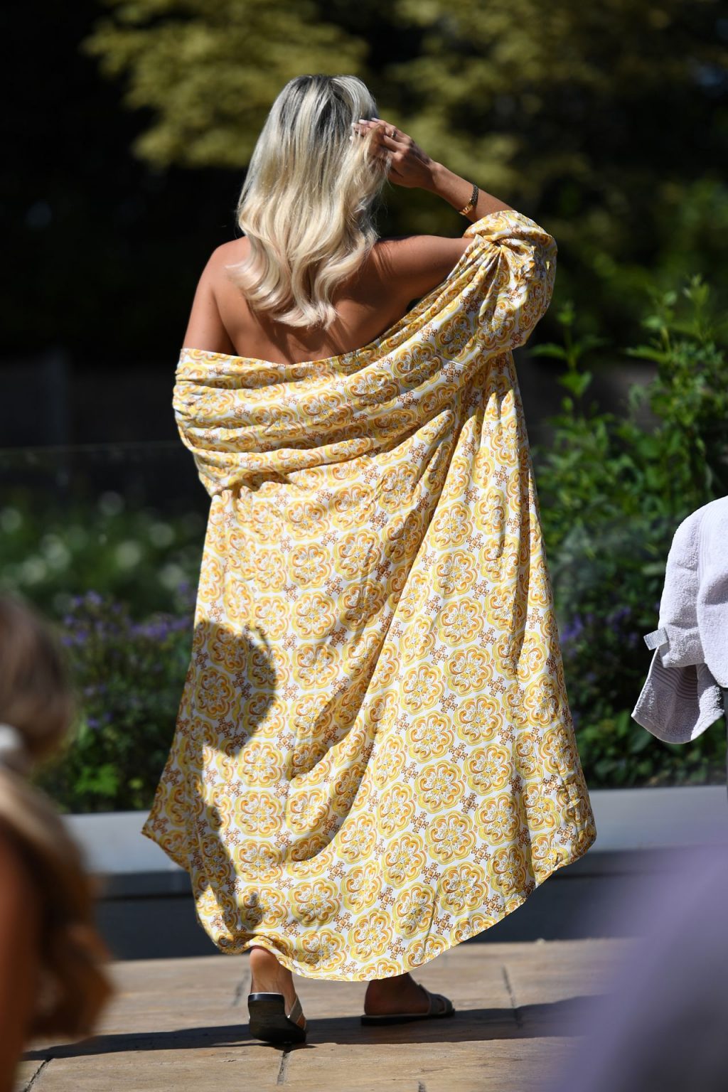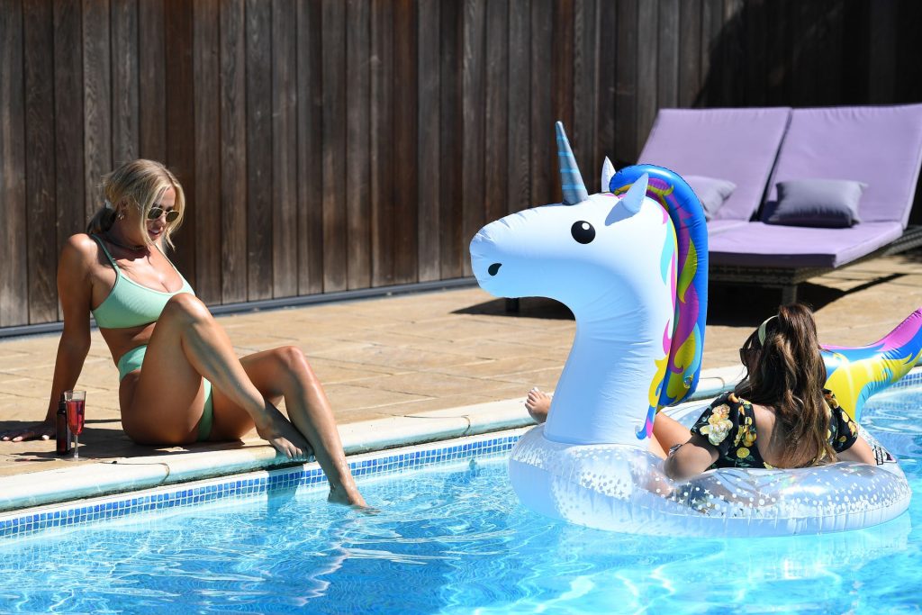 Amber Turner, Chloe Meadows, Courtney Green muestran sus cuerpos sexys en la grabación del programa de televisión “The Only Way is Essex” junto a la piscina, 29/07/2020.