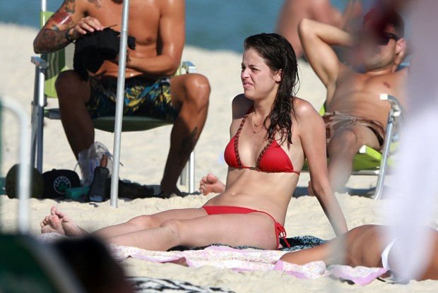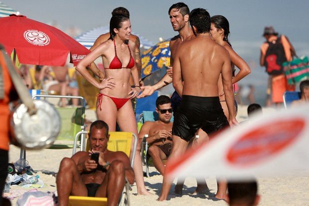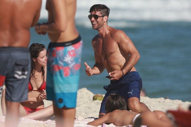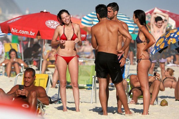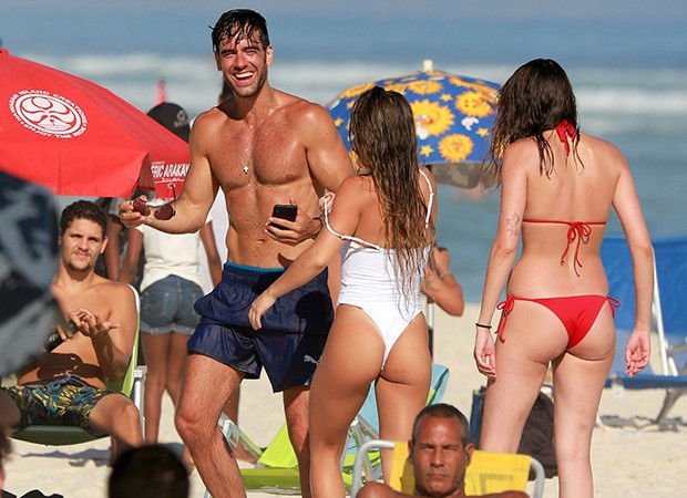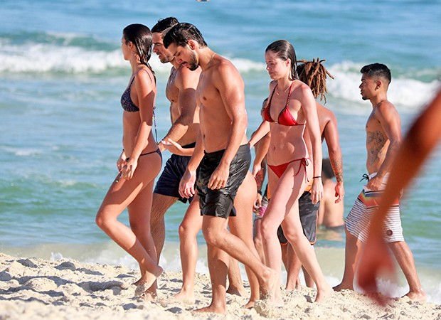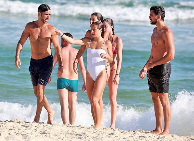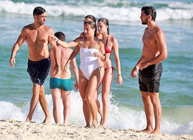 Agatha Moreira, Rodrigo Simas, Marcos Pitombo y Bruna Griphao fueron fotografiados disfrutando del calor de Río en la playa de Barra da Tijuca (2018). Bruna Griphao es una actriz brasileña (Orgullo y Pasión (2018)). Edad: 19.