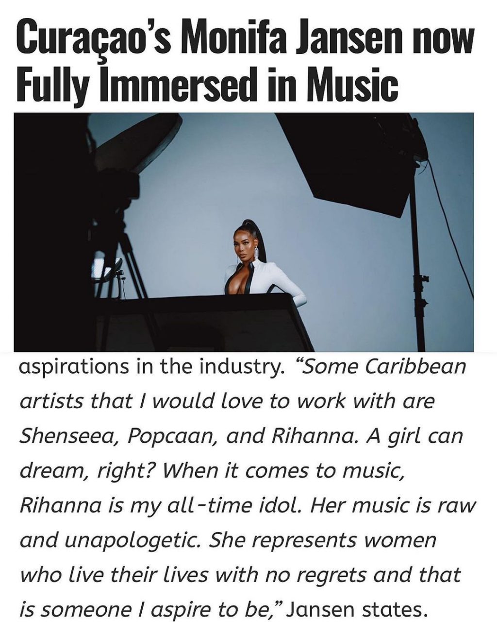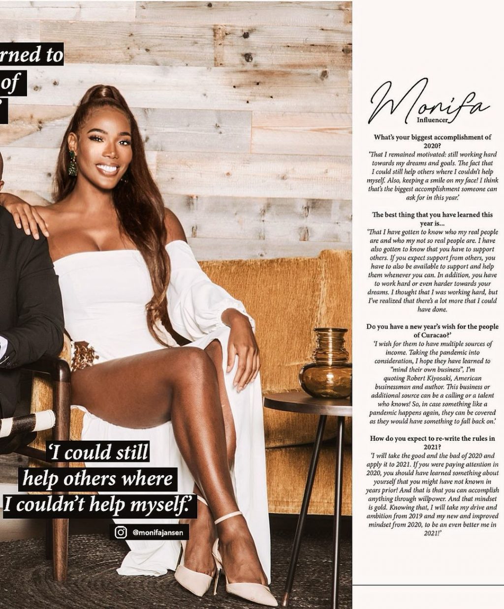 Monifa Jansen (Edad 28) es una curazoleña que fue coronada Miss Curazao y es modelo. Representó a su país en los certámenes Miss Mundo 2011 y Miss Universo 2012. Jansen compitió en el certamen Miss Universo 2012 pero no logró clasificar a las semifinales. Monifa no participó en el certamen Miss Universo 2011 el 12 de septiembre de 2011.