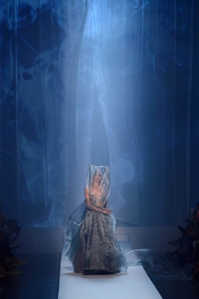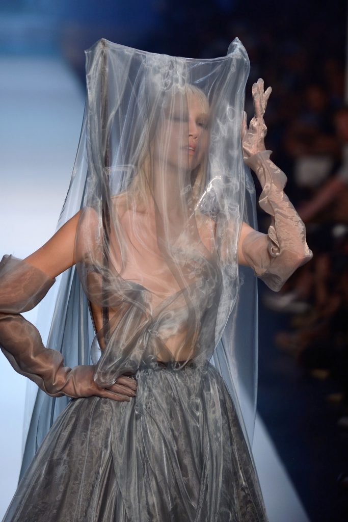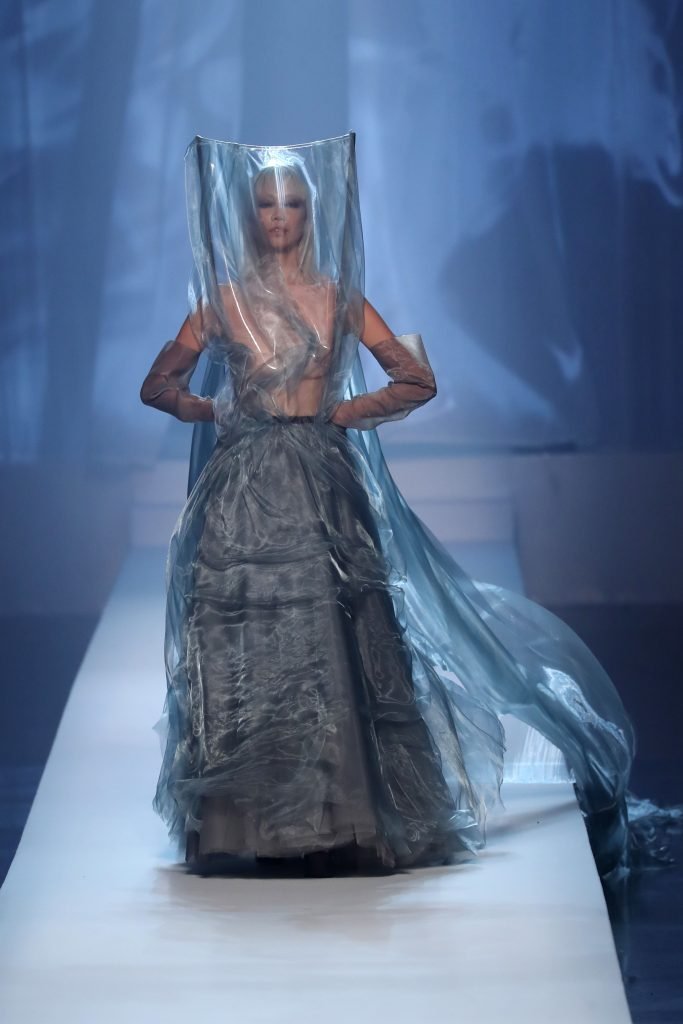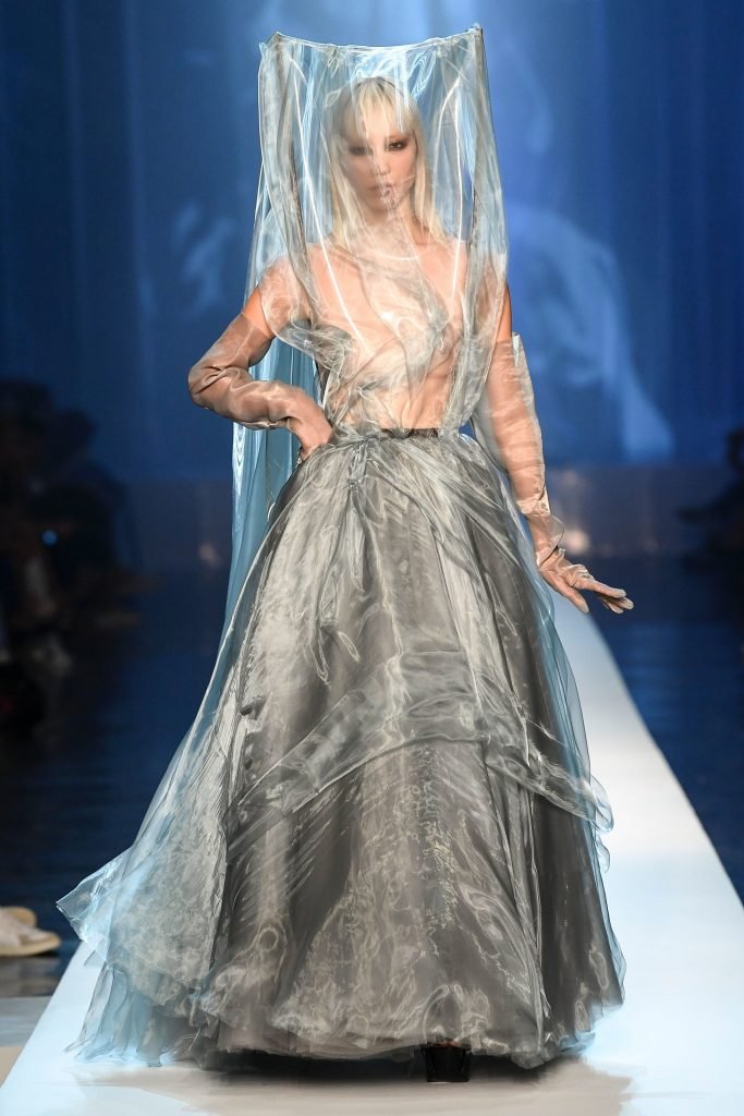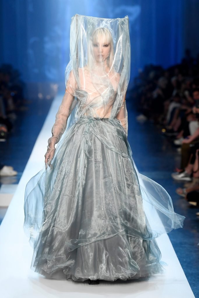 Asian Soo Joo Park camina por la pasarela con un vestido con velo transparente durante la Semana de la Moda Alta Costura Otoño/Invierno 2018/19 de Jean-Paul Gaultier en París, Francia, 07/04/2018. Soo Joo Park es una modelo coreana. Edad: 32.