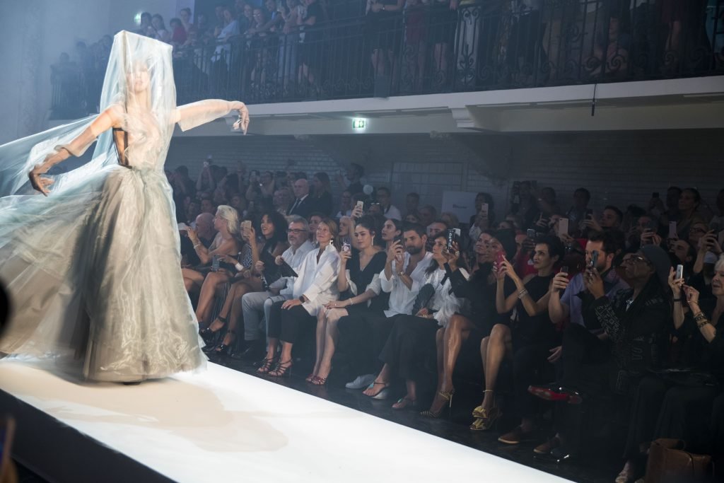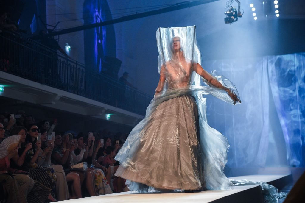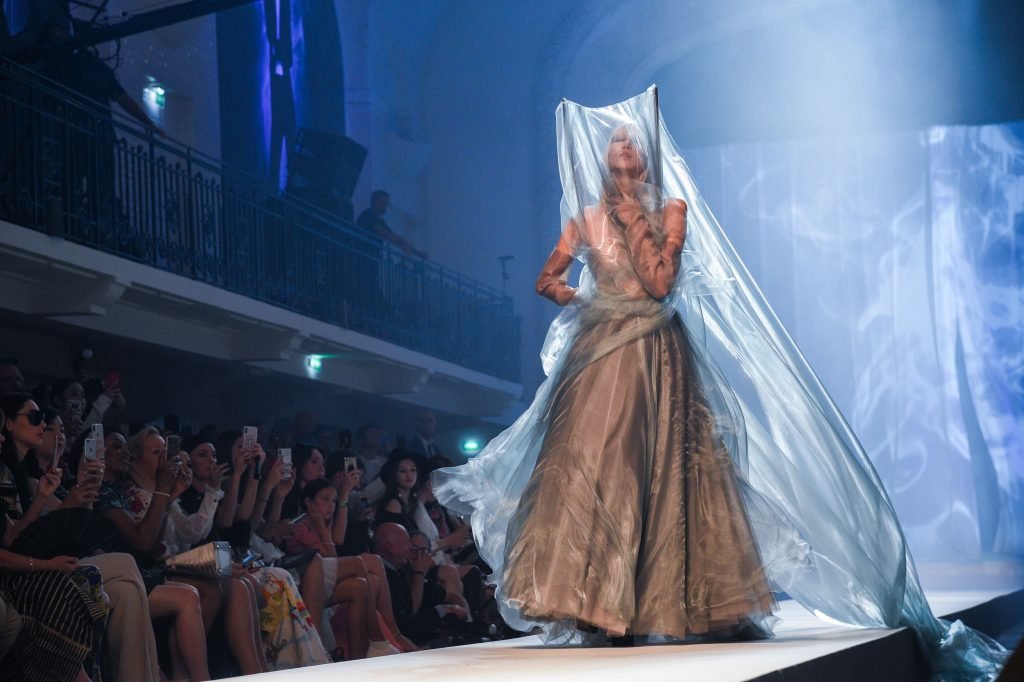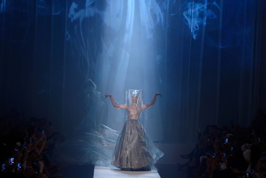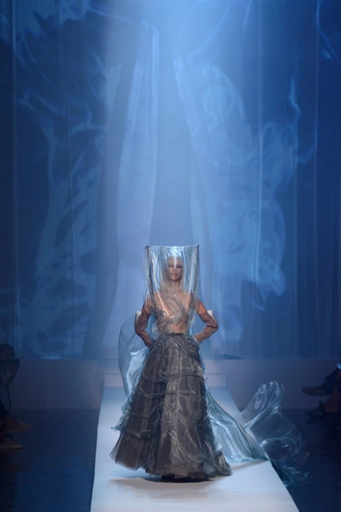 Asian Soo Joo Park camina por la pasarela con un vestido con velo transparente durante la Semana de la Moda Alta Costura Otoño/Invierno 2018/19 de Jean-Paul Gaultier en París, Francia, 07/04/2018. Soo Joo Park es una modelo coreana. Edad: 32.