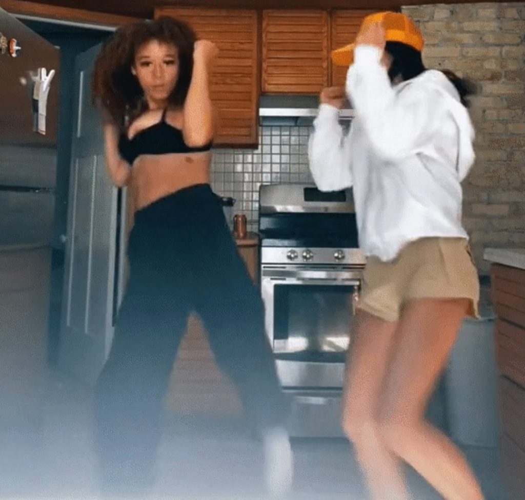 La joven belleza Talia Jackson tiene un desliz de pezón, bailando con un sujetador negro junto a su amiga en el video de TikTok a continuación, 17/09/2021.
