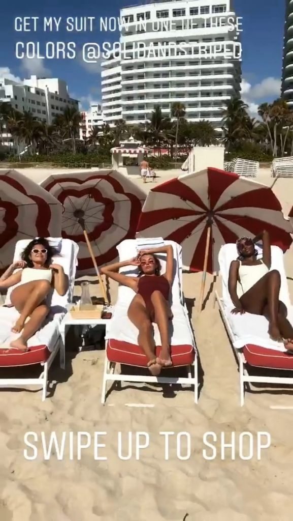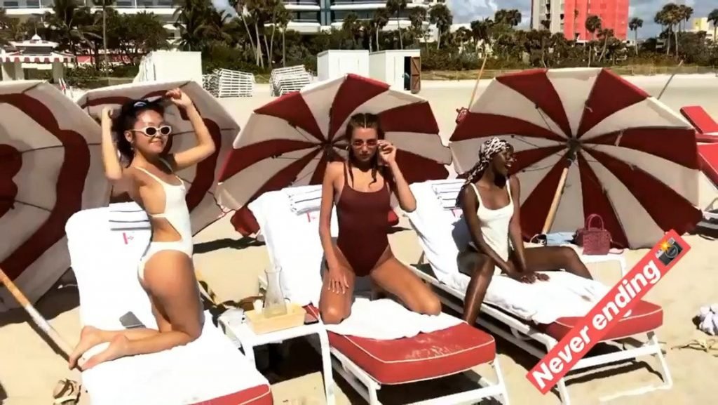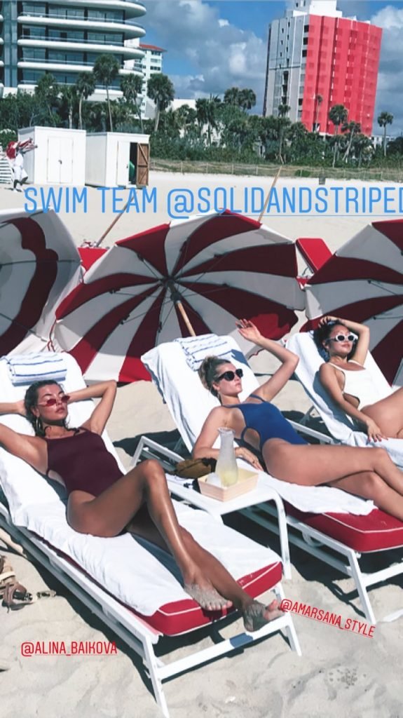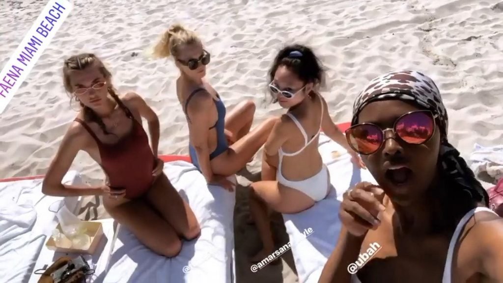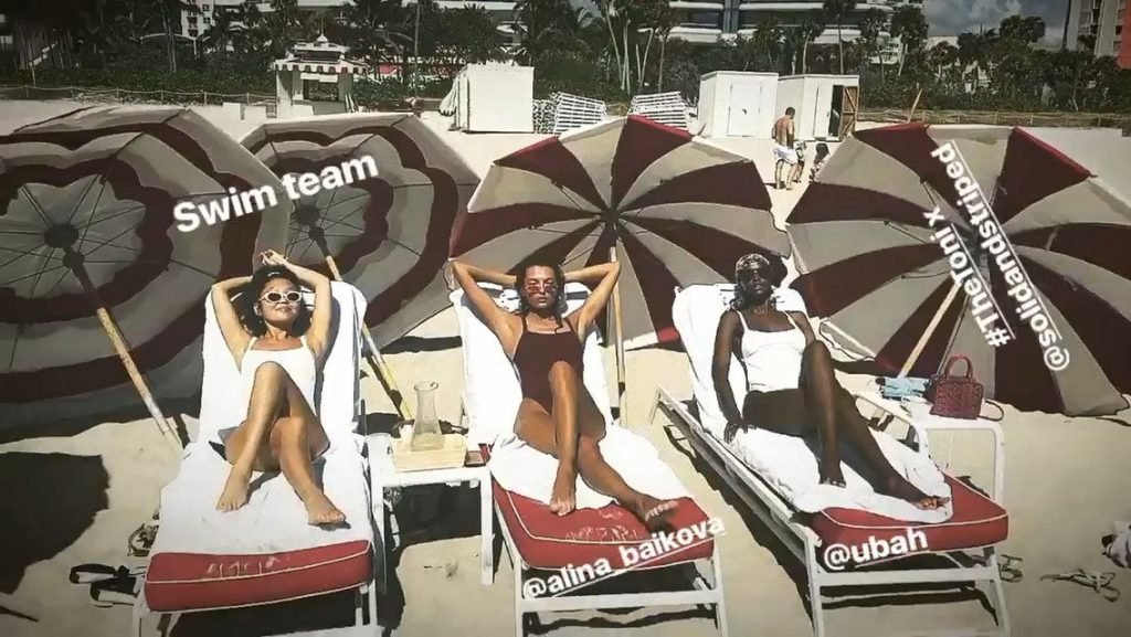 Models Toni Garrn, Alina Baikova, Ubah Hassan y la estilista de moda Amarsana Gendunova llevan bikinis a juego en la playa de Miami, 04/02/2018.