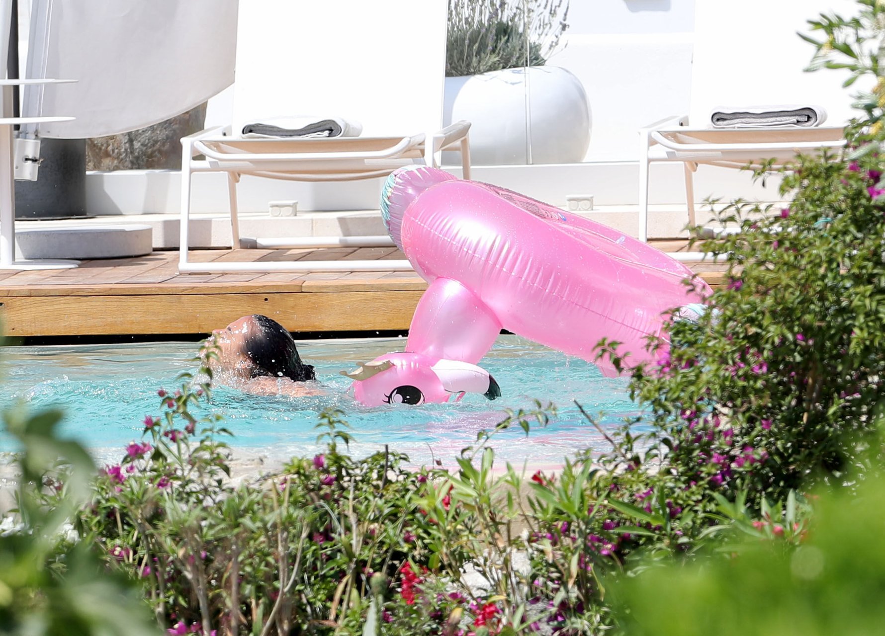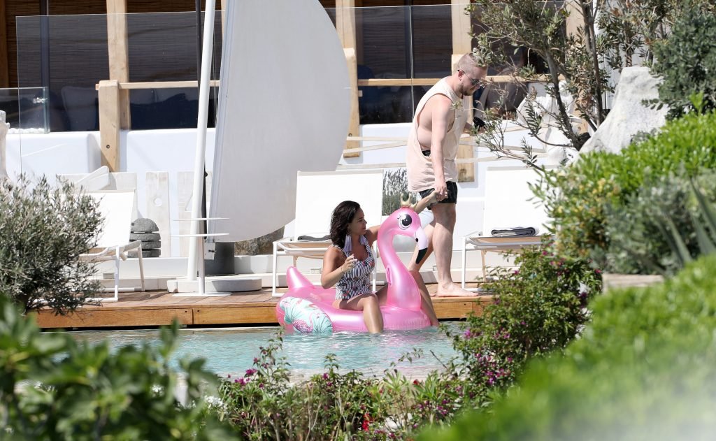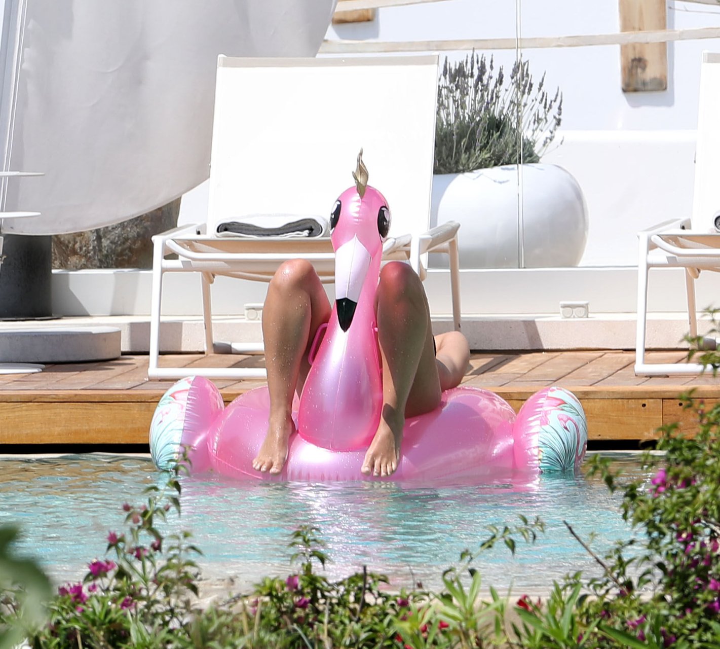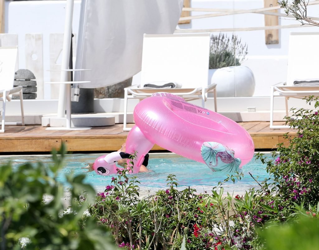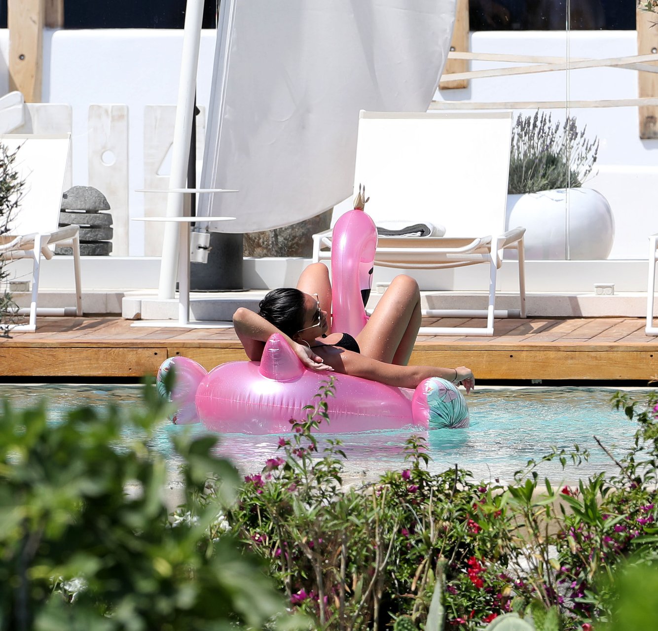 Actriz Georgia May Foote (27) aparece jugando con un flamenco inflable alrededor de una piscina mientras se relajaba en unas vacaciones en Mykonos, 07/05/2018.