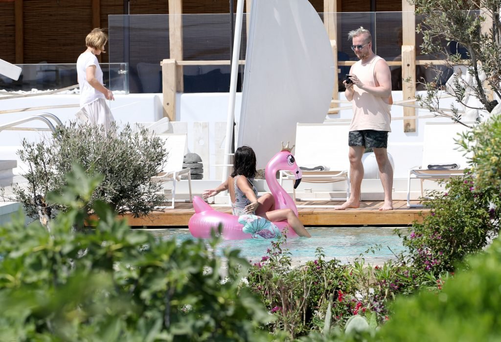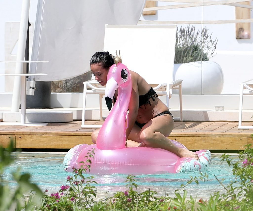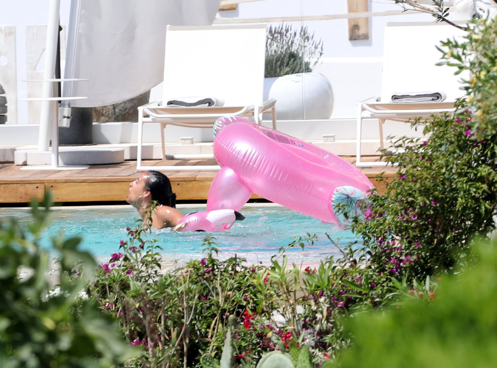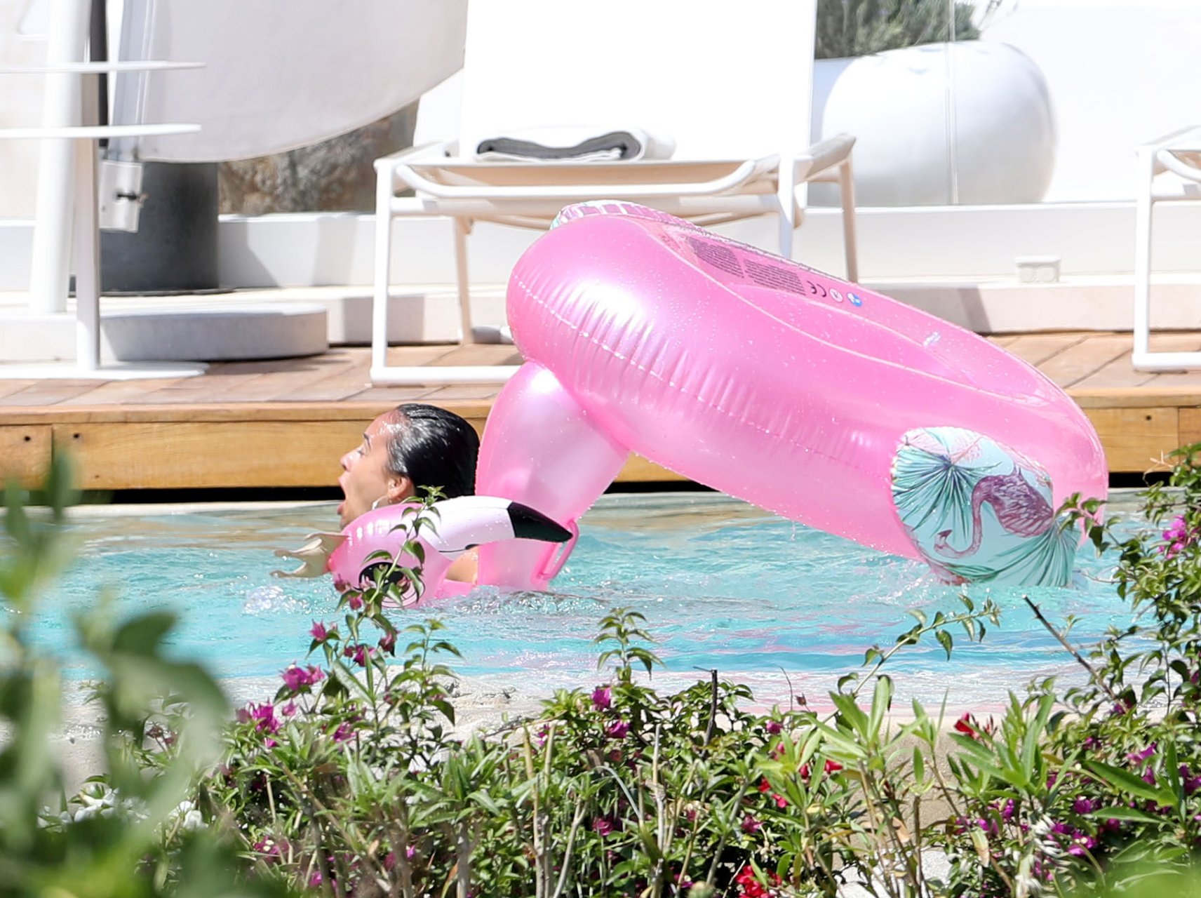 Actriz Georgia May Foote (27) aparece jugando con un flamenco inflable alrededor de una piscina mientras se relajaba en unas vacaciones en Mykonos, 07/05/2018.