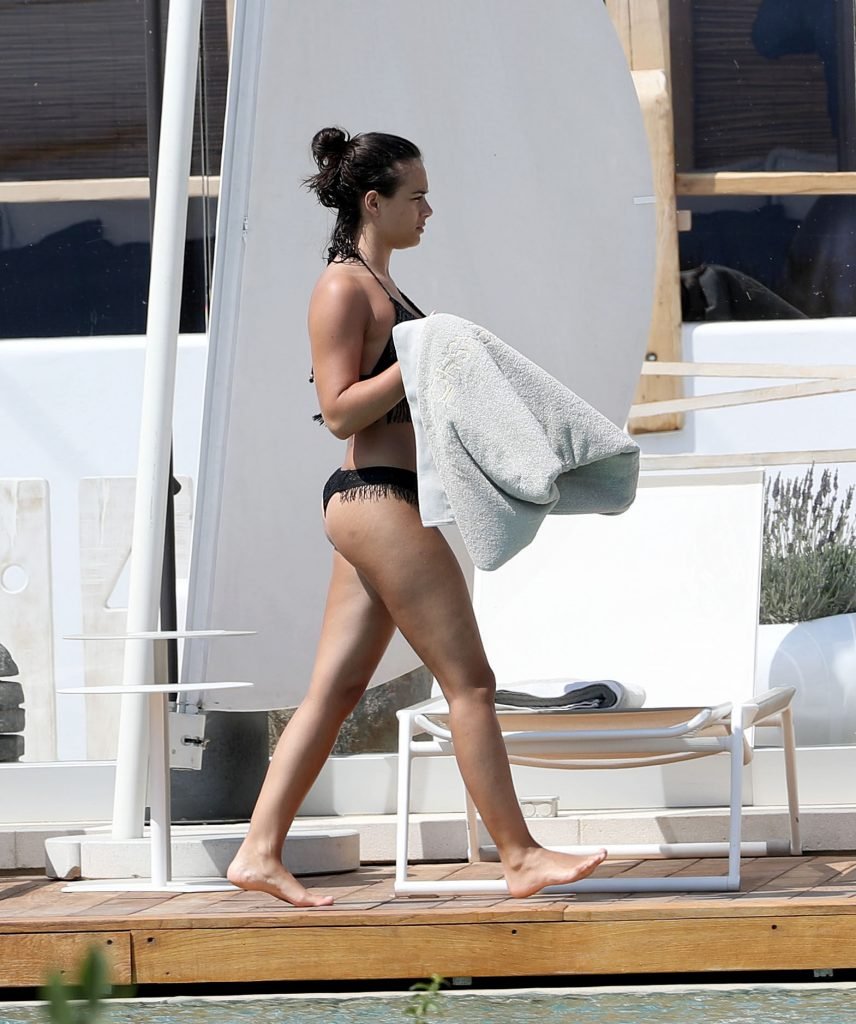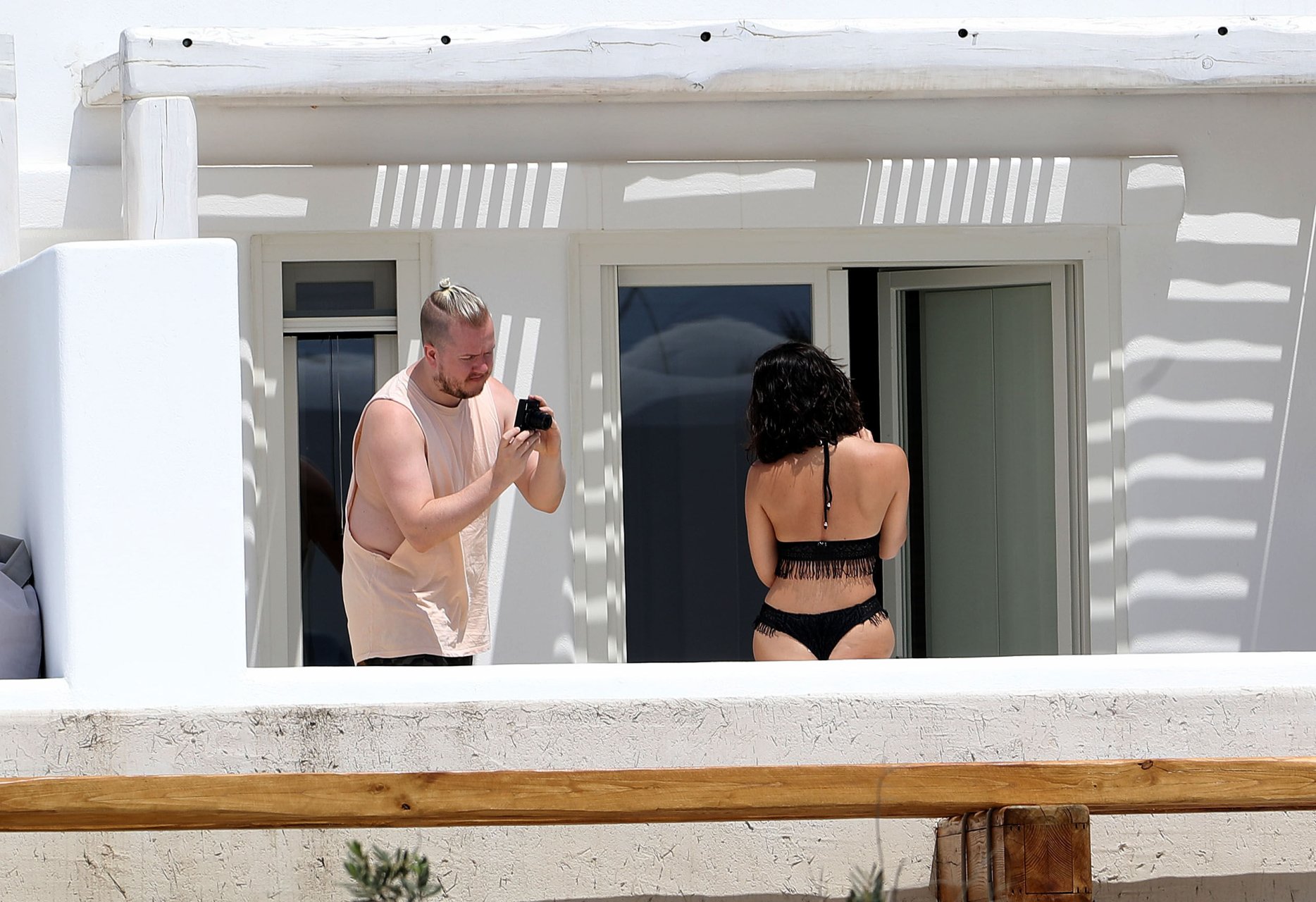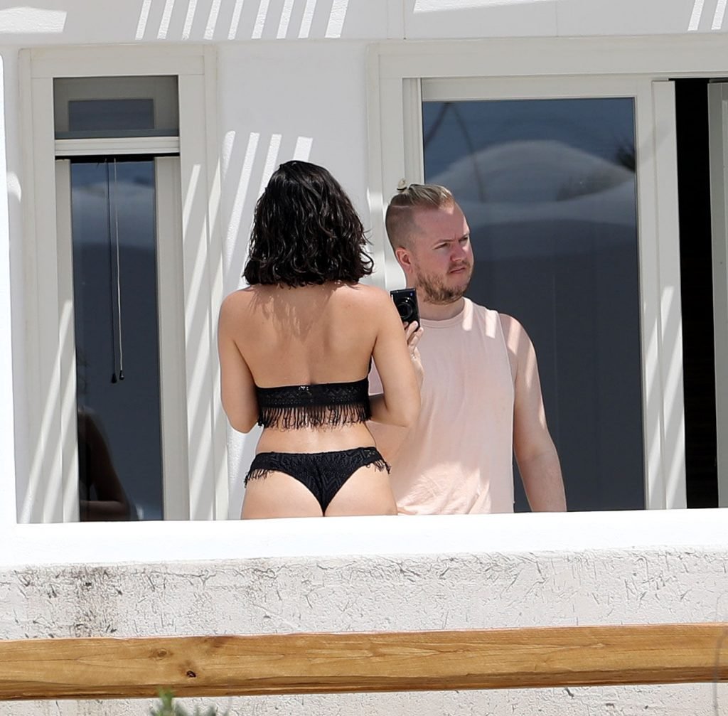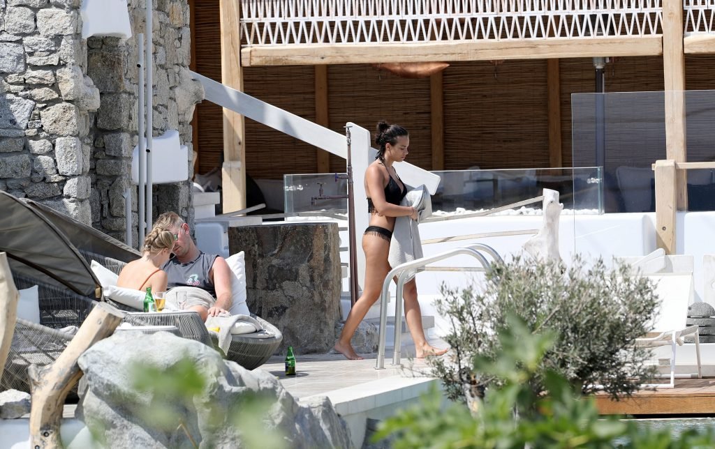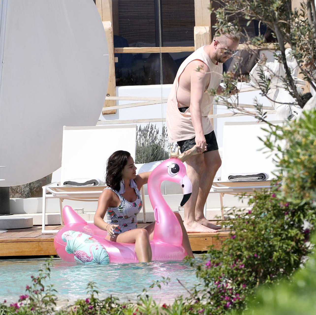Actriz Georgia May Foote (27) aparece jugando con un flamenco inflable alrededor de una piscina mientras se relajaba en unas vacaciones en Mykonos, 07/05/2018.