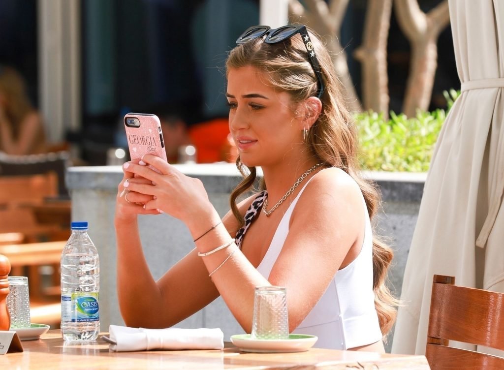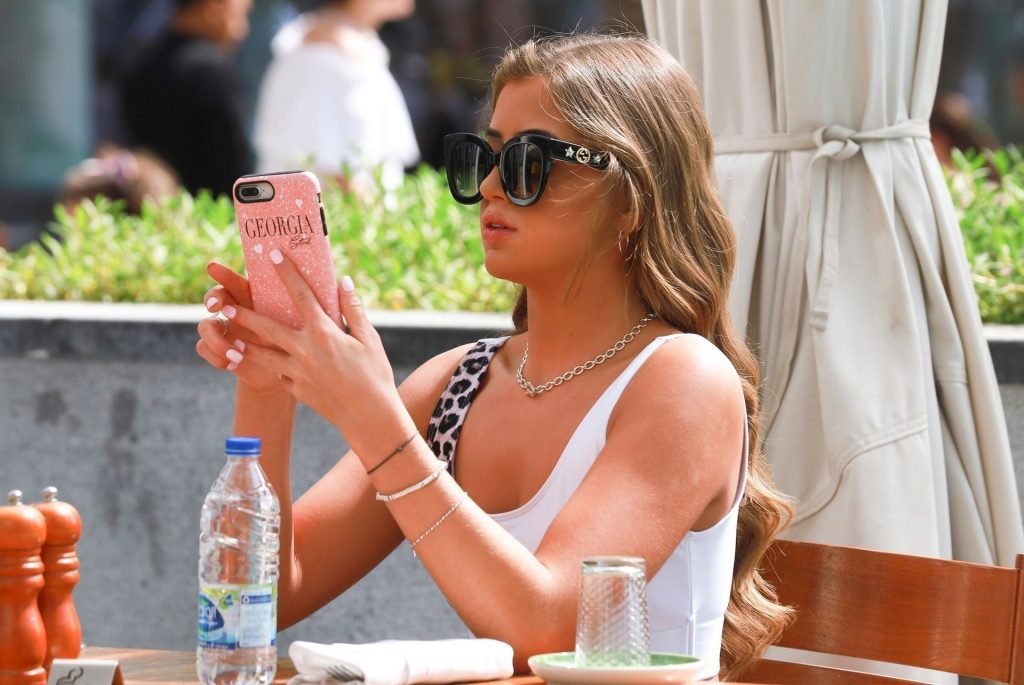 La estrella de la televisión reality Georgia Steel fue vista con un bikini mitad y mitad mientras se refrescaba junto a la piscina en Dubái en el hotel FIVE Palm, 27/04/2019.