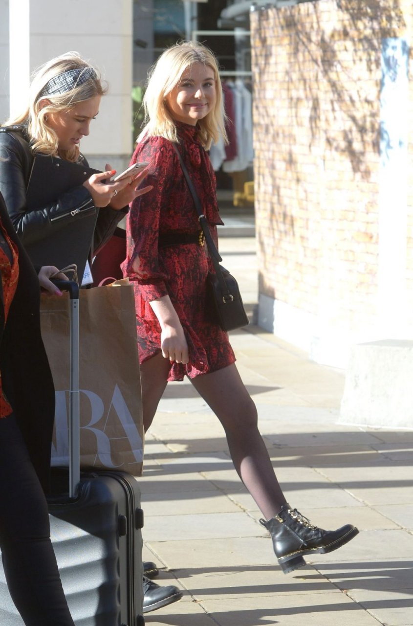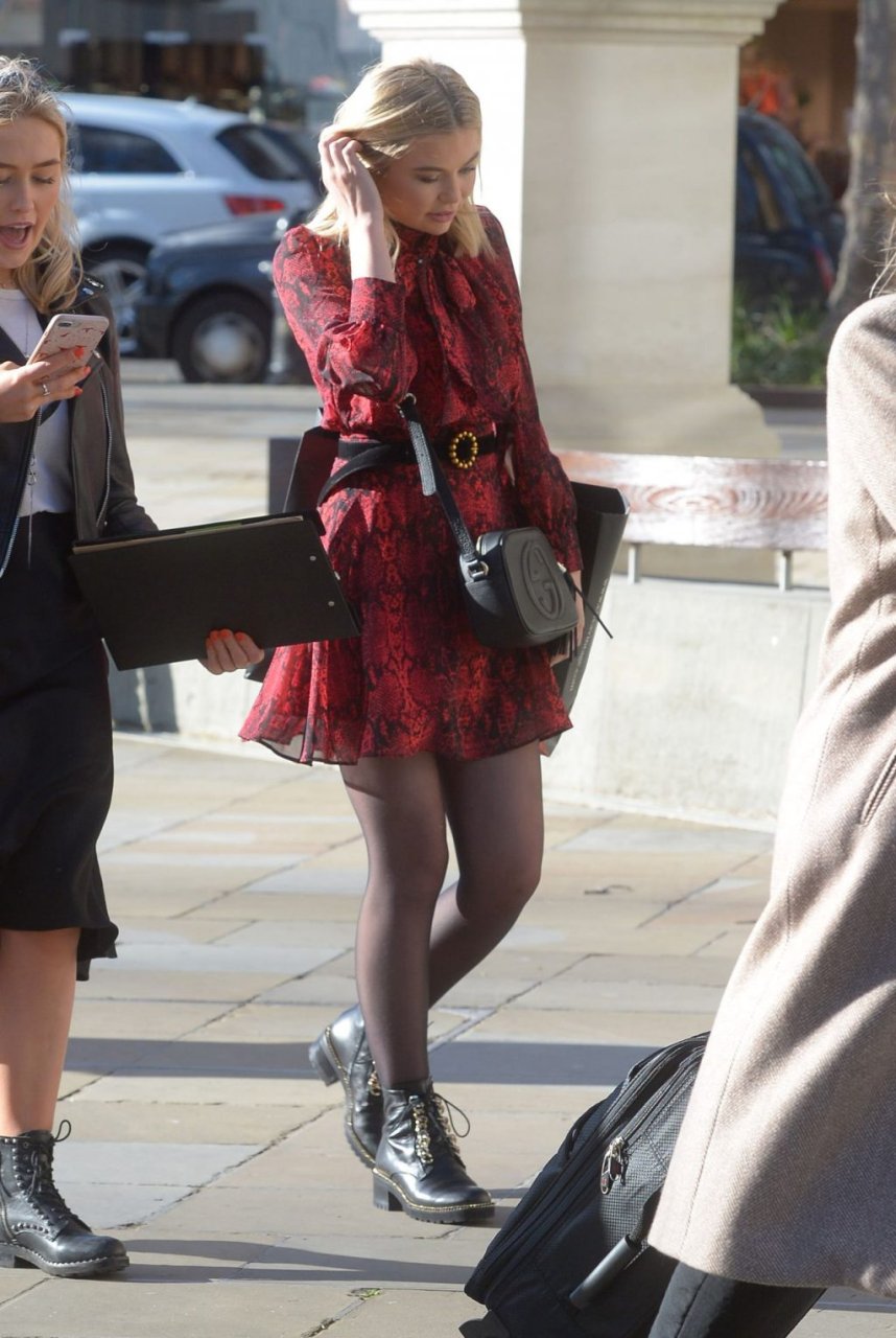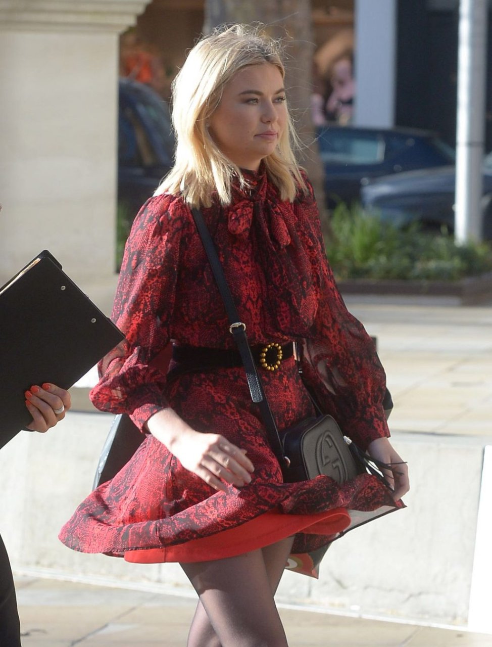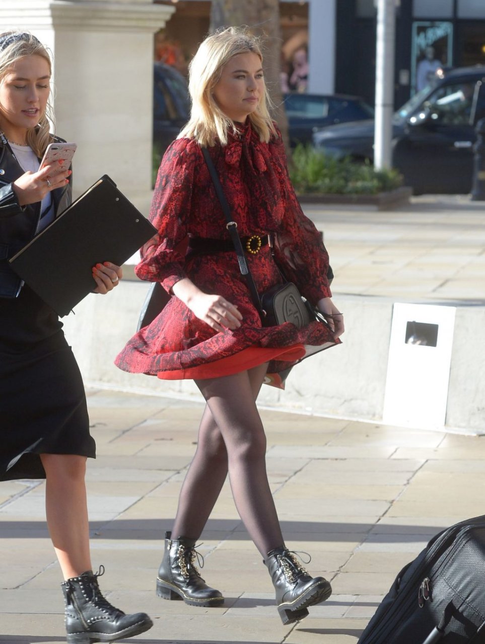 Reina de la Jungla y estrella de MIC, Georgia Toffolo fue vista llegando a la Galería Saatchi en Chelsea, donde los fuertes vientos causaron estragos con su falda camisa, escapando por poco de un fallo de vestuario, 03/10/2019.