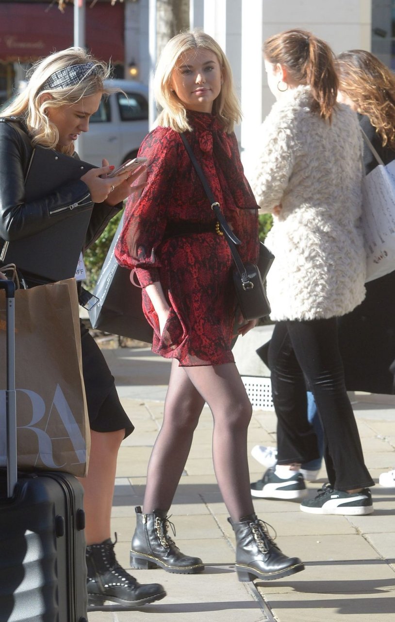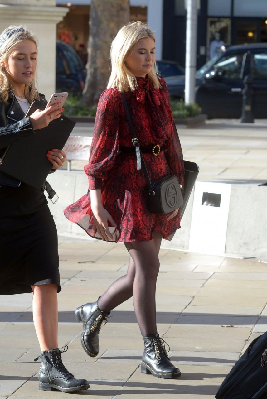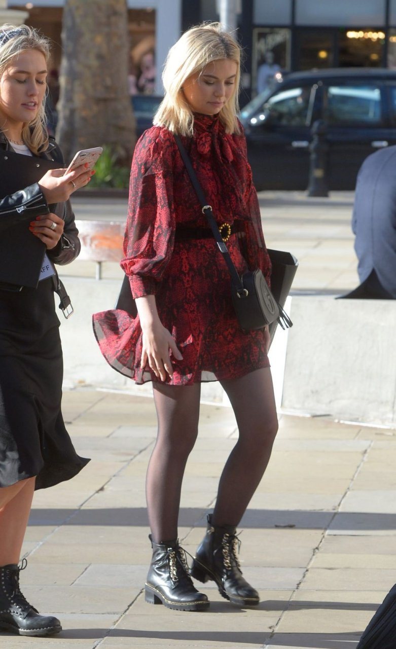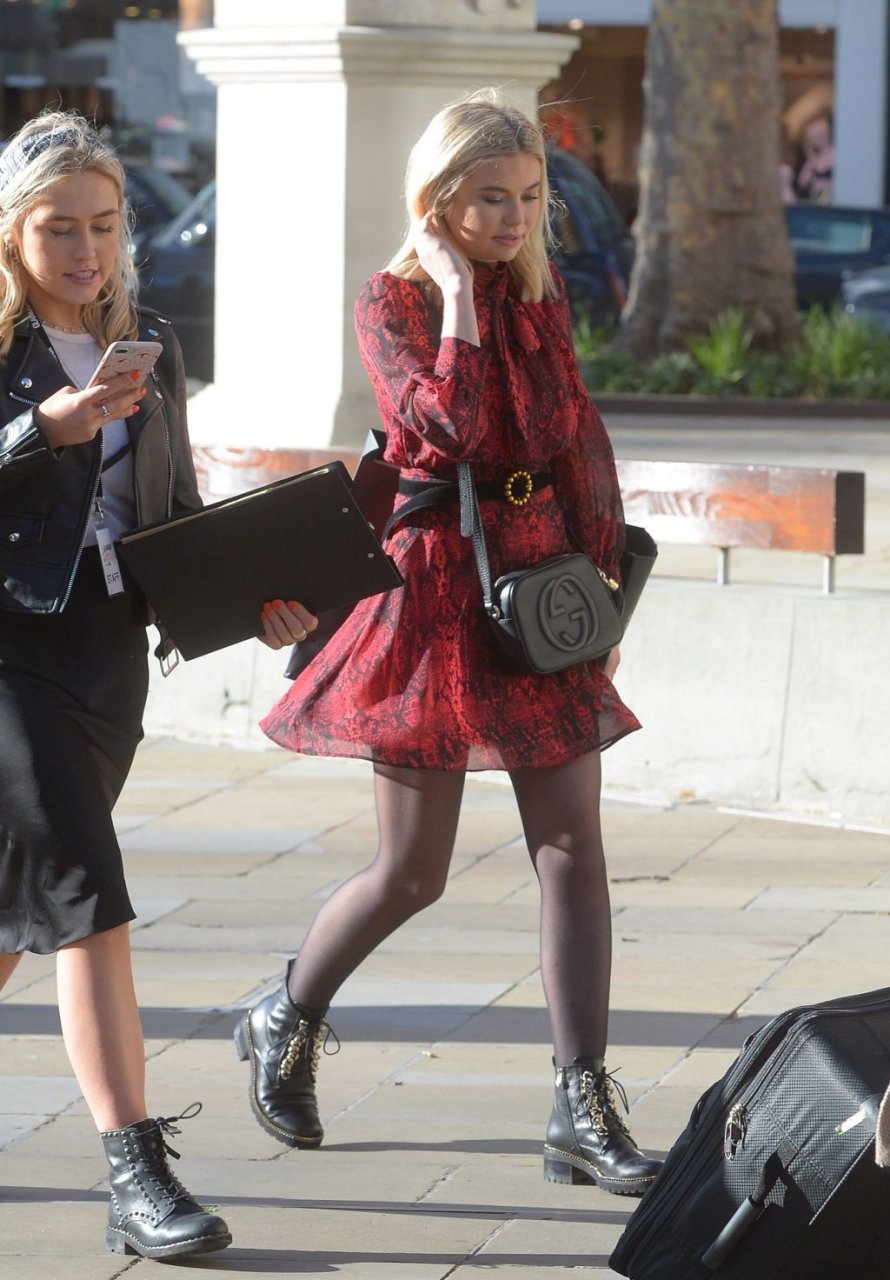 Reina de la Jungla y estrella de MIC, Georgia Toffolo fue vista llegando a la Galería Saatchi en Chelsea, donde los fuertes vientos causaron estragos con su falda camisa, escapando por poco de un fallo de vestuario, 03/10/2019.