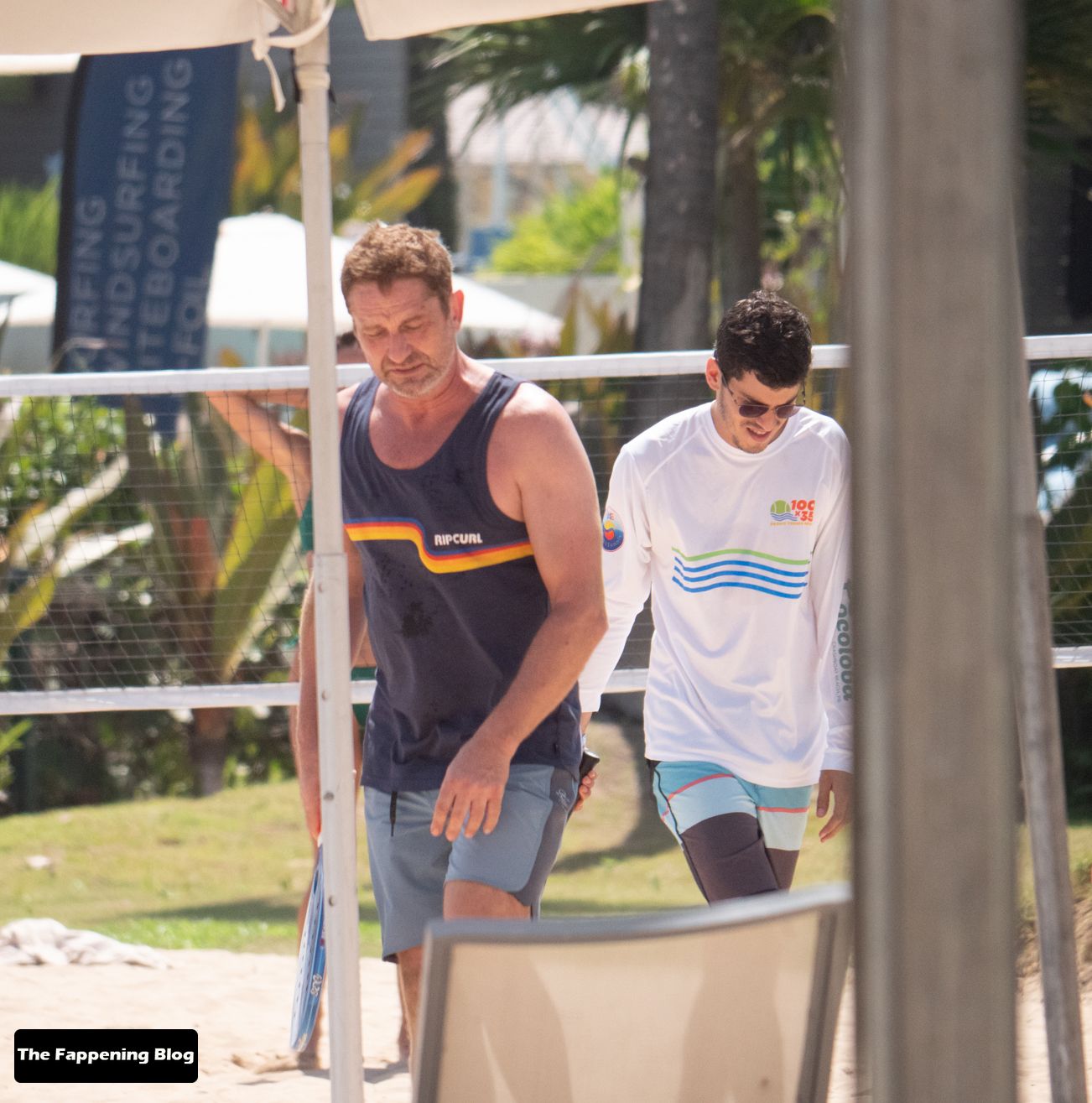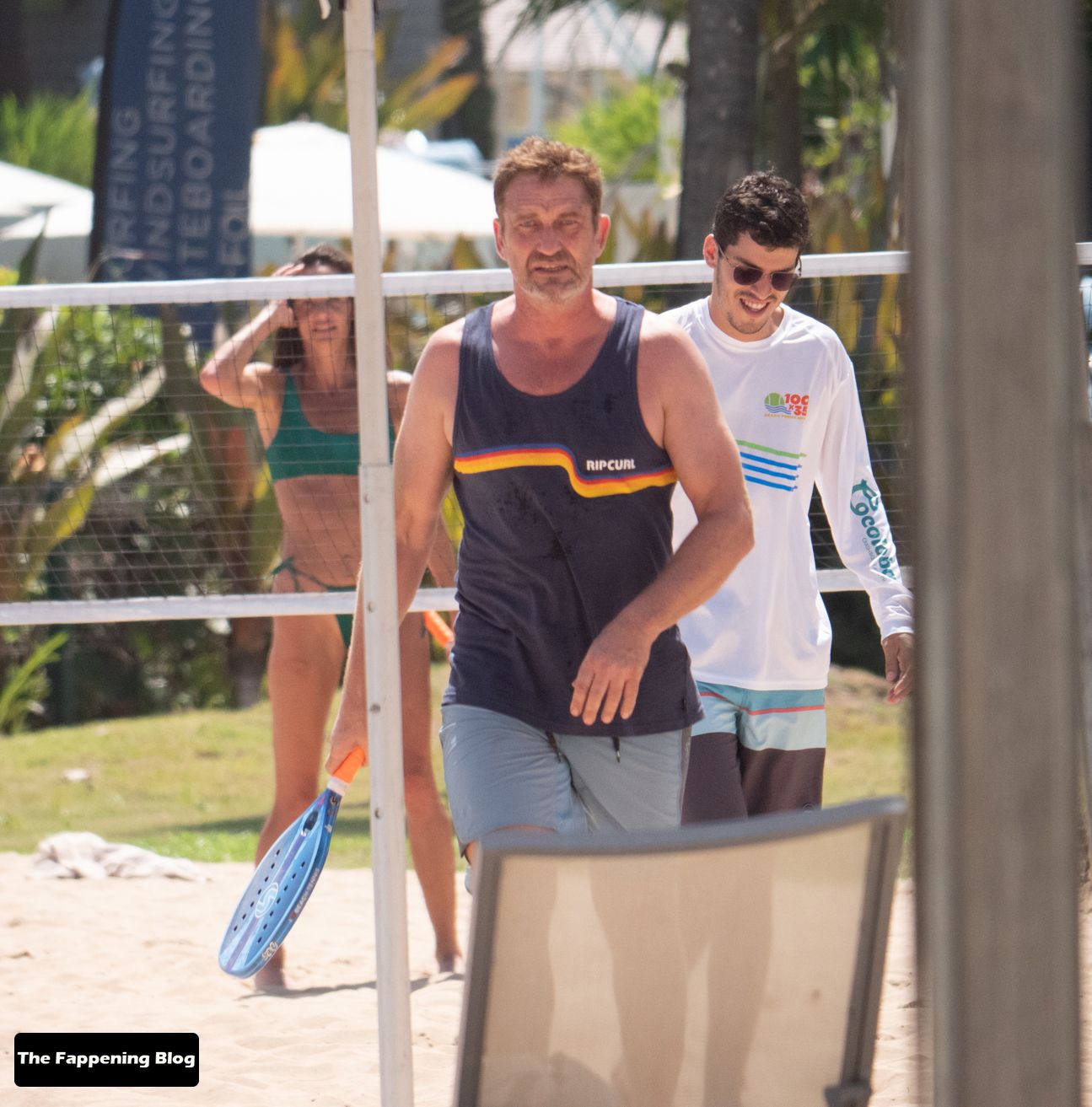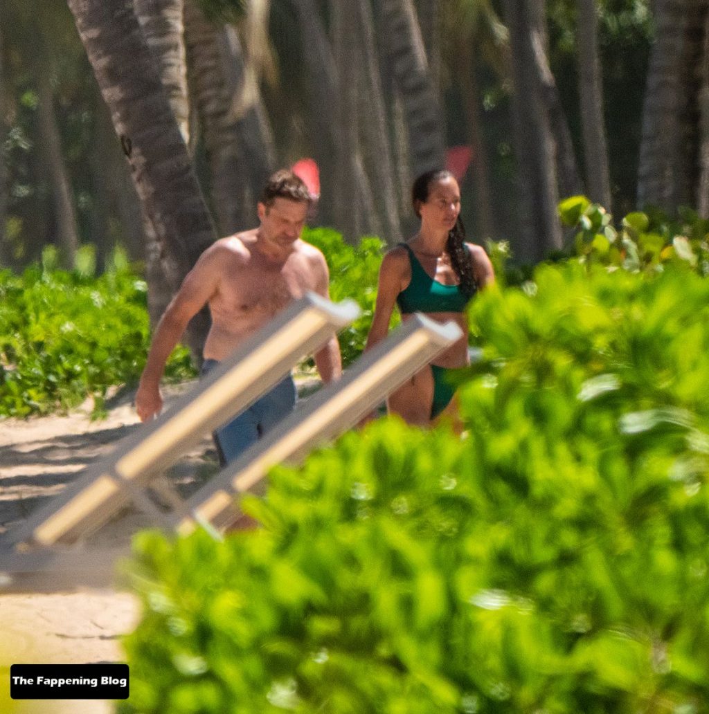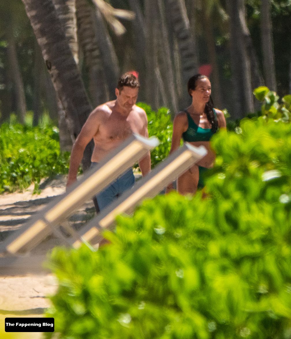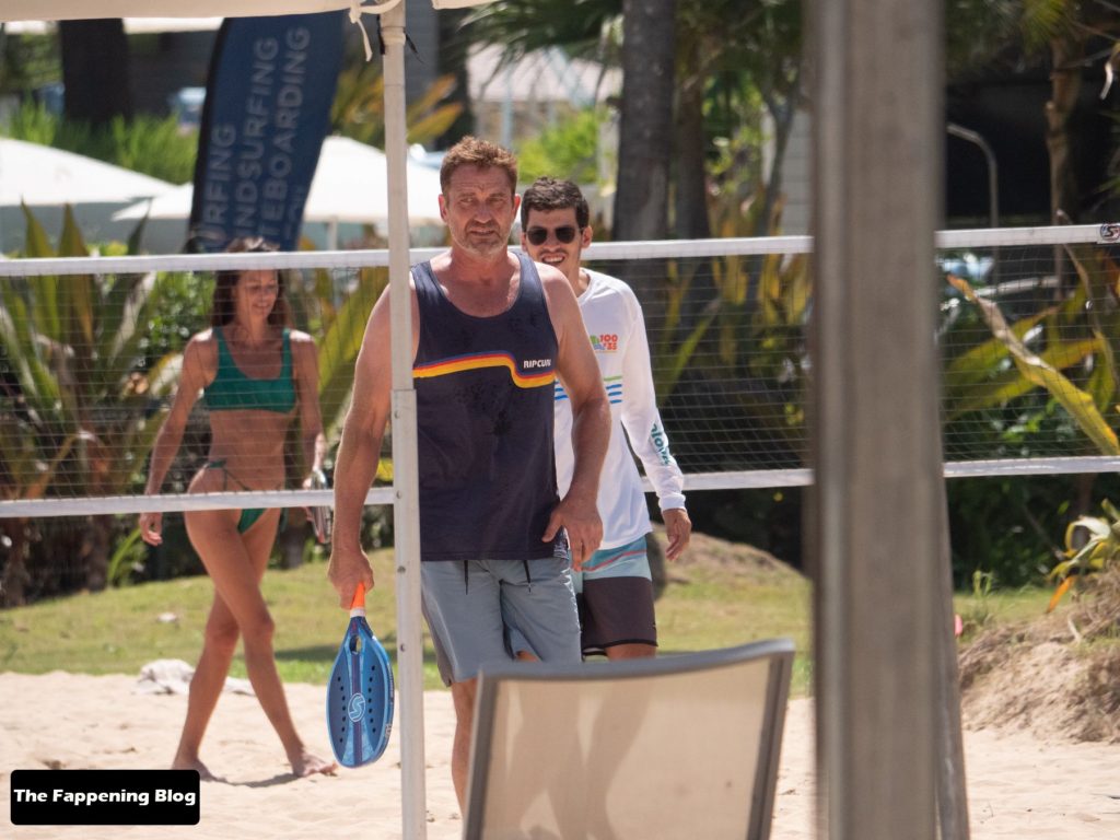 El actor de 51 años y su pareja en bikini dieron un paseo romántico por la orilla del mar, antes de que Butler jugara algunos juegos con amigos.