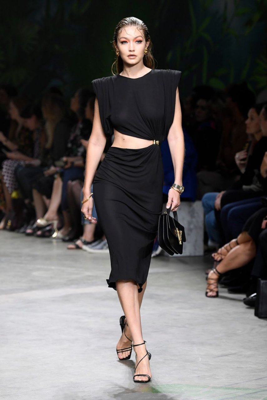 Modelo Gigi Hadid camina por la pasarela sin sostén para el desfile de Versace Primavera/Verano 2020 durante la Semana de la Moda de Milán en Italia, 20/09/2019.