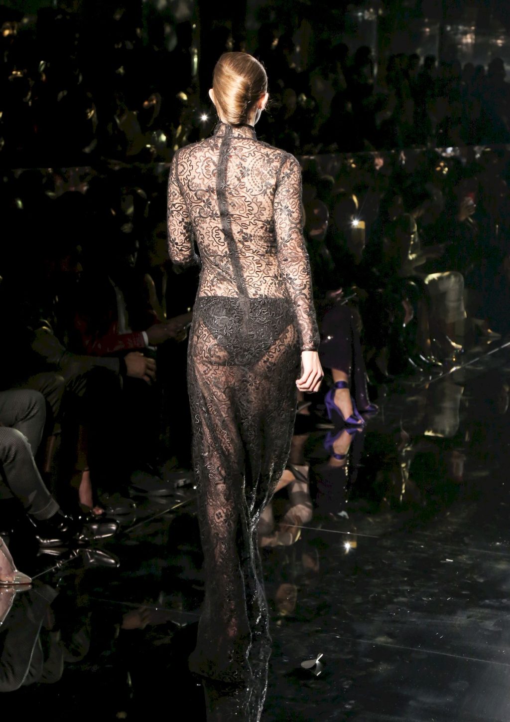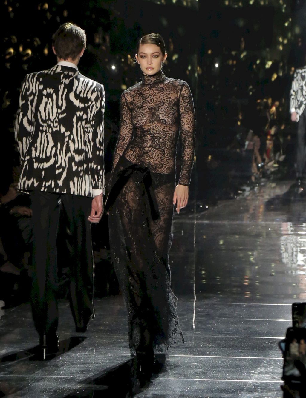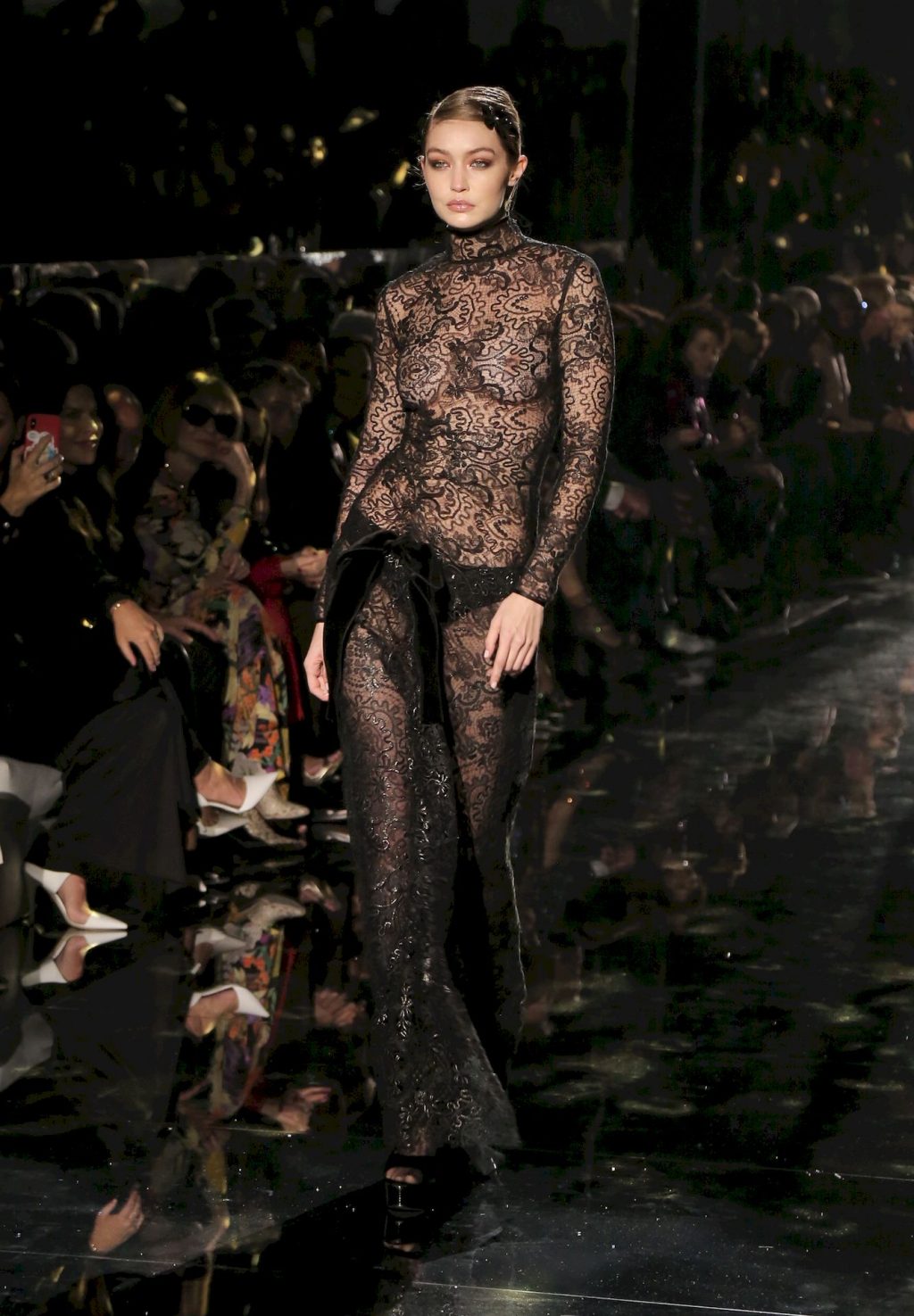 Gigi Hadid camina por la pasarela durante el desfile Tom Ford AW20 en Milk Studios el 07 de febrero de 2020 en Hollywood. La hermana de Bella también mostró sus tetas, vistiendo un vestido transparente.