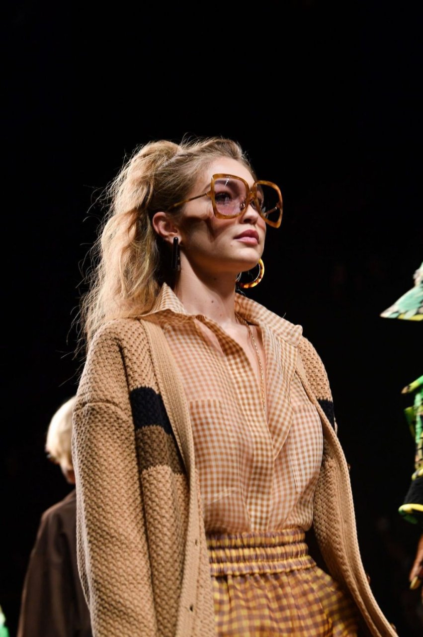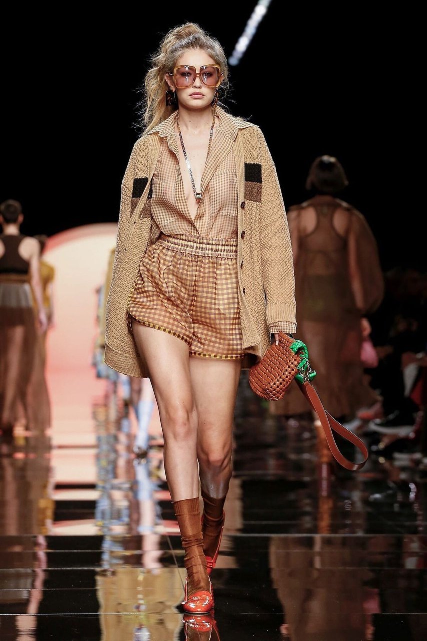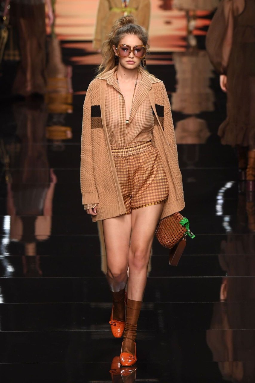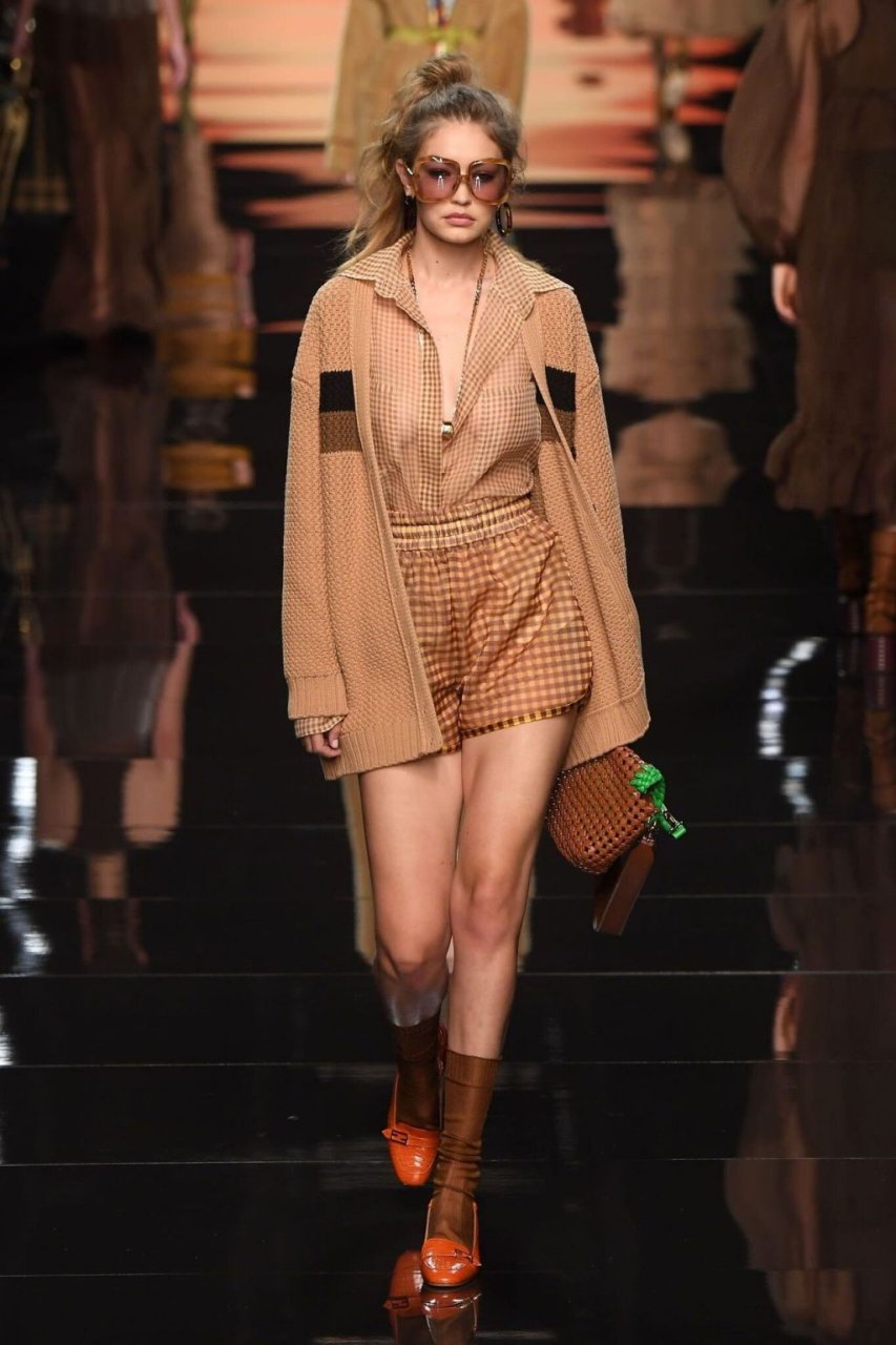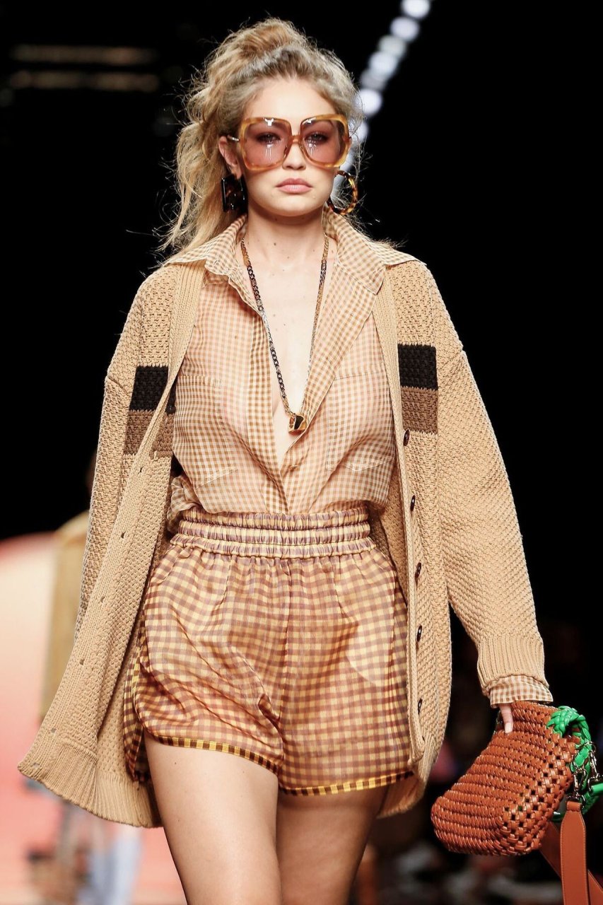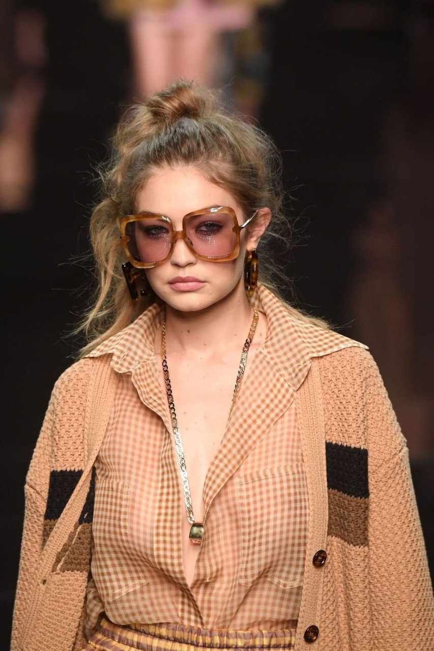 Model Gigi Hadid mostró su escote, vistiendo una camisa transparente en el desfile de Fendi durante la Semana de la Moda de Milán Primavera/Verano 2020, 19/09/2019.