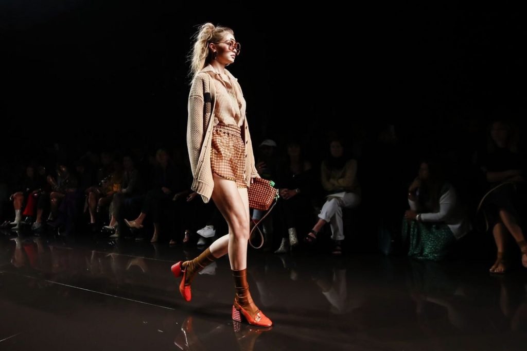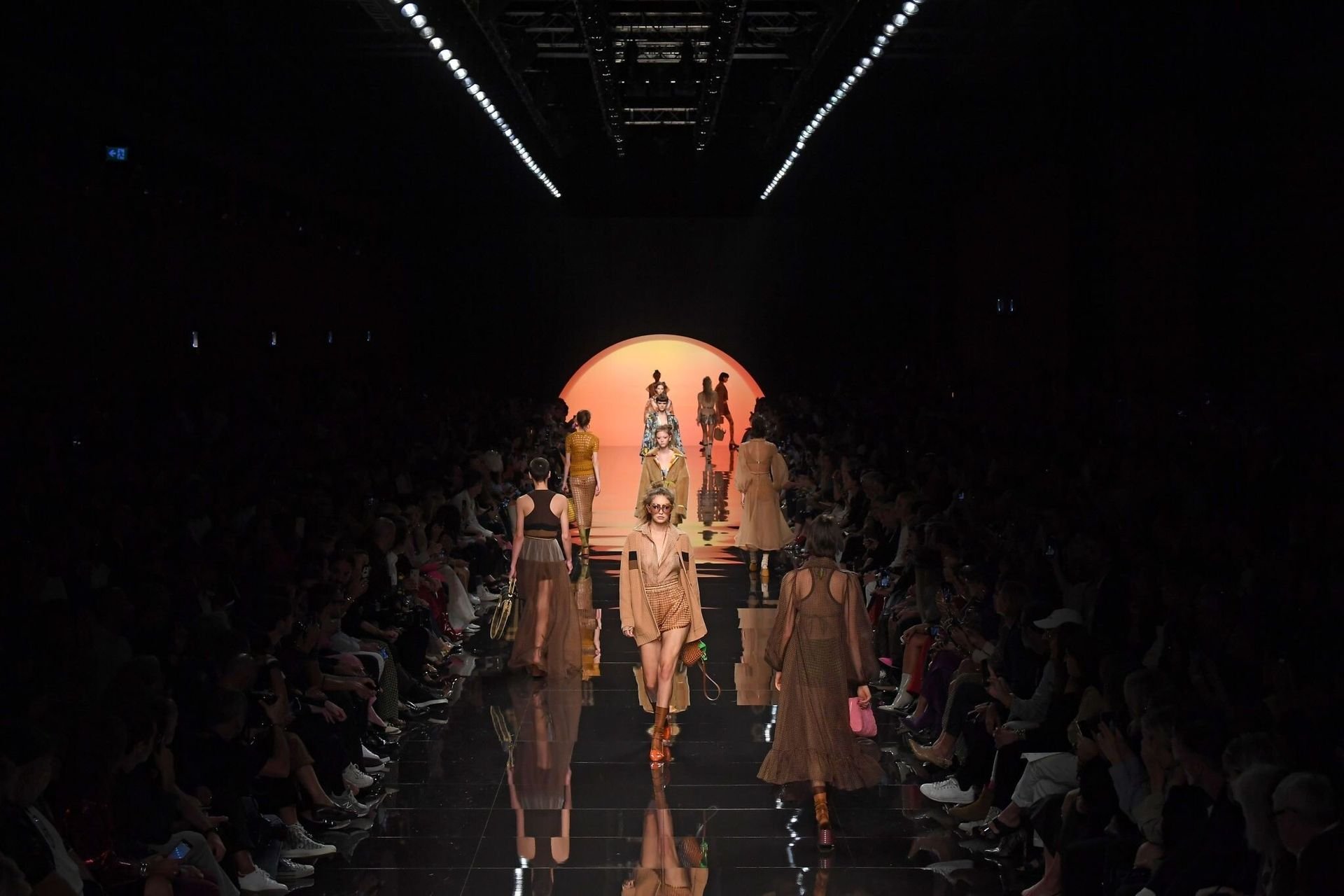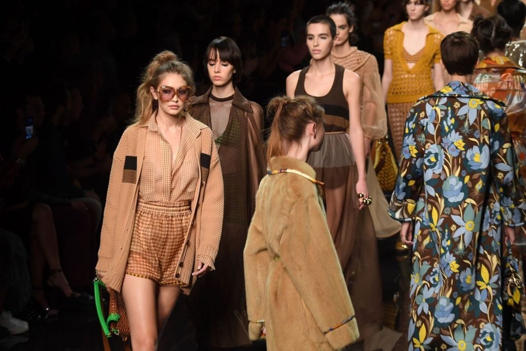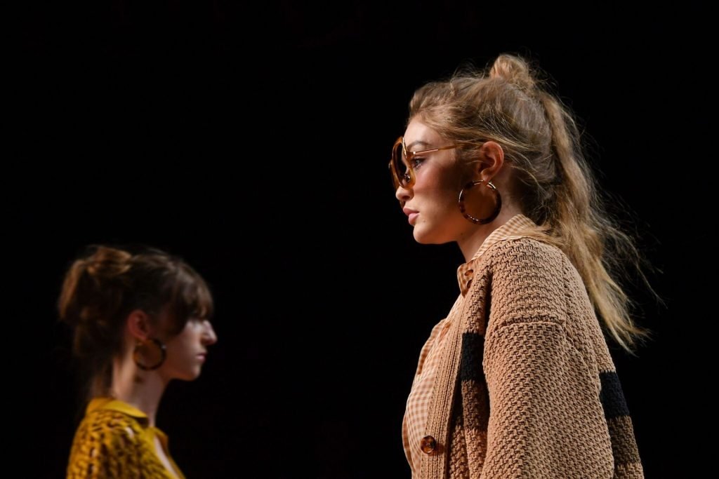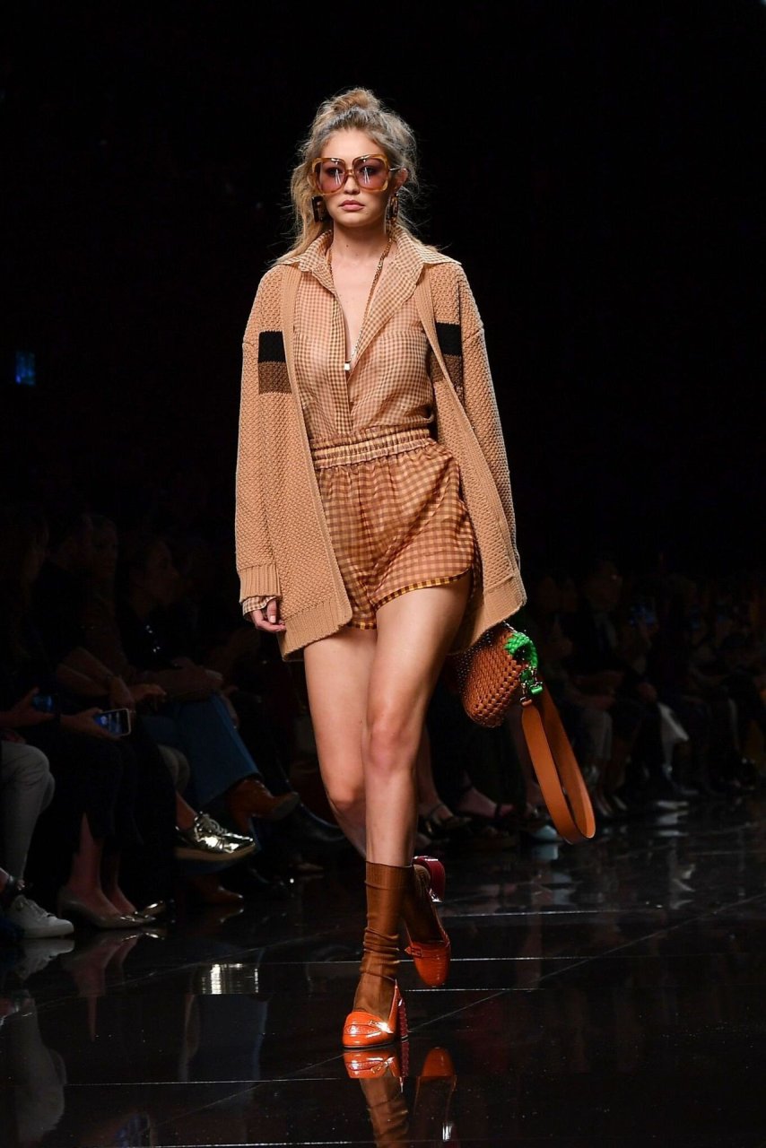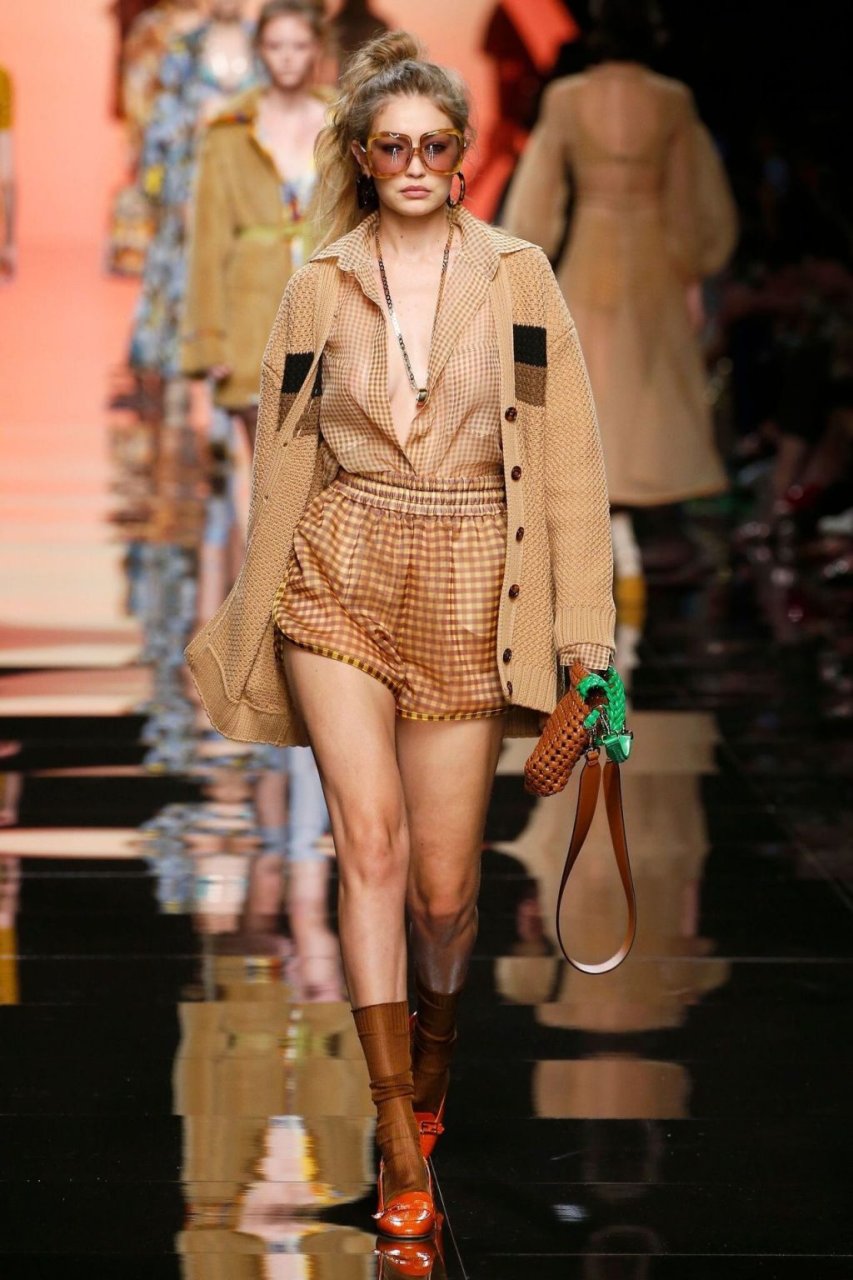 Model Gigi Hadid mostró su escote, vistiendo una camisa transparente en el desfile de Fendi durante la Semana de la Moda de Milán Primavera/Verano 2020, 19/09/2019.