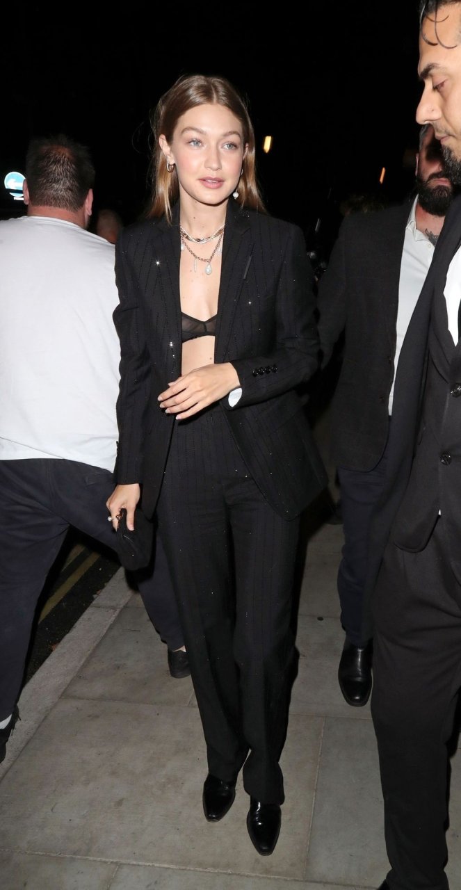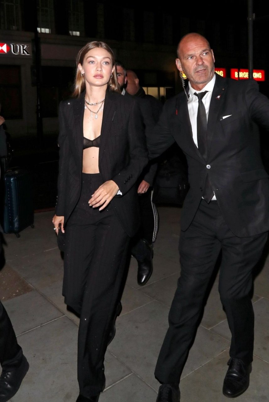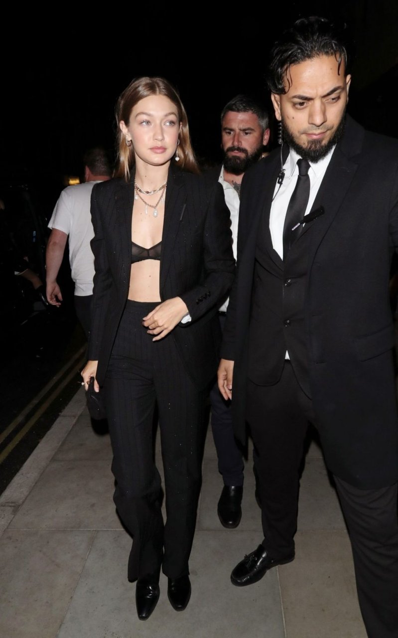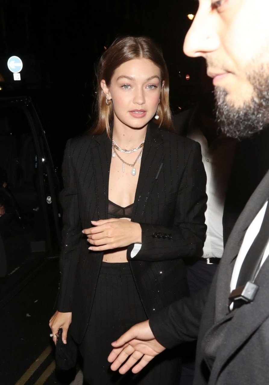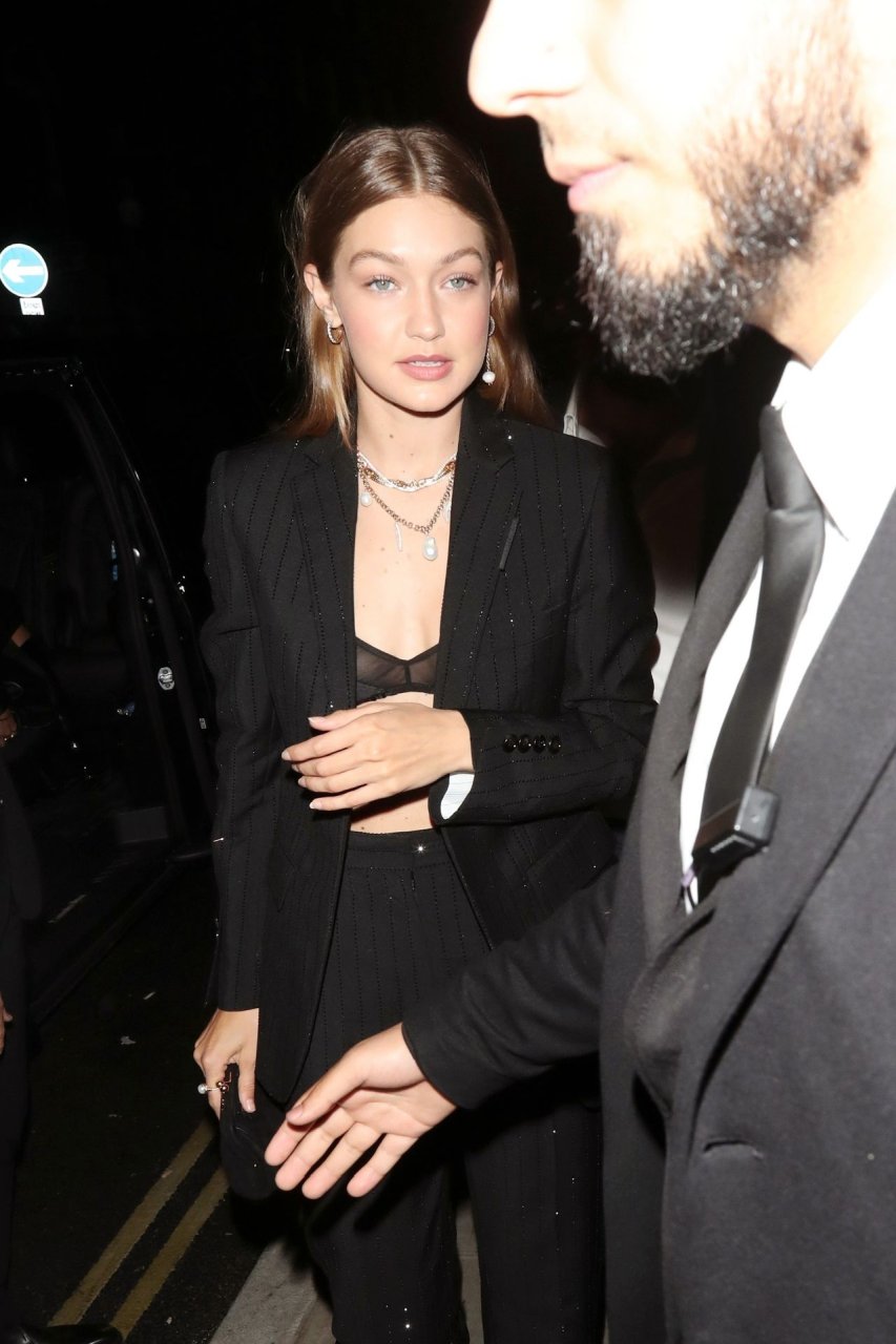 La modelo estadounidense Bella Hadid y Gigi Hadid fueron vistas saliendo del hotel Cafe Royal en Londres, 16/09/2019. Gigi mostró su sujetador negro de encaje.