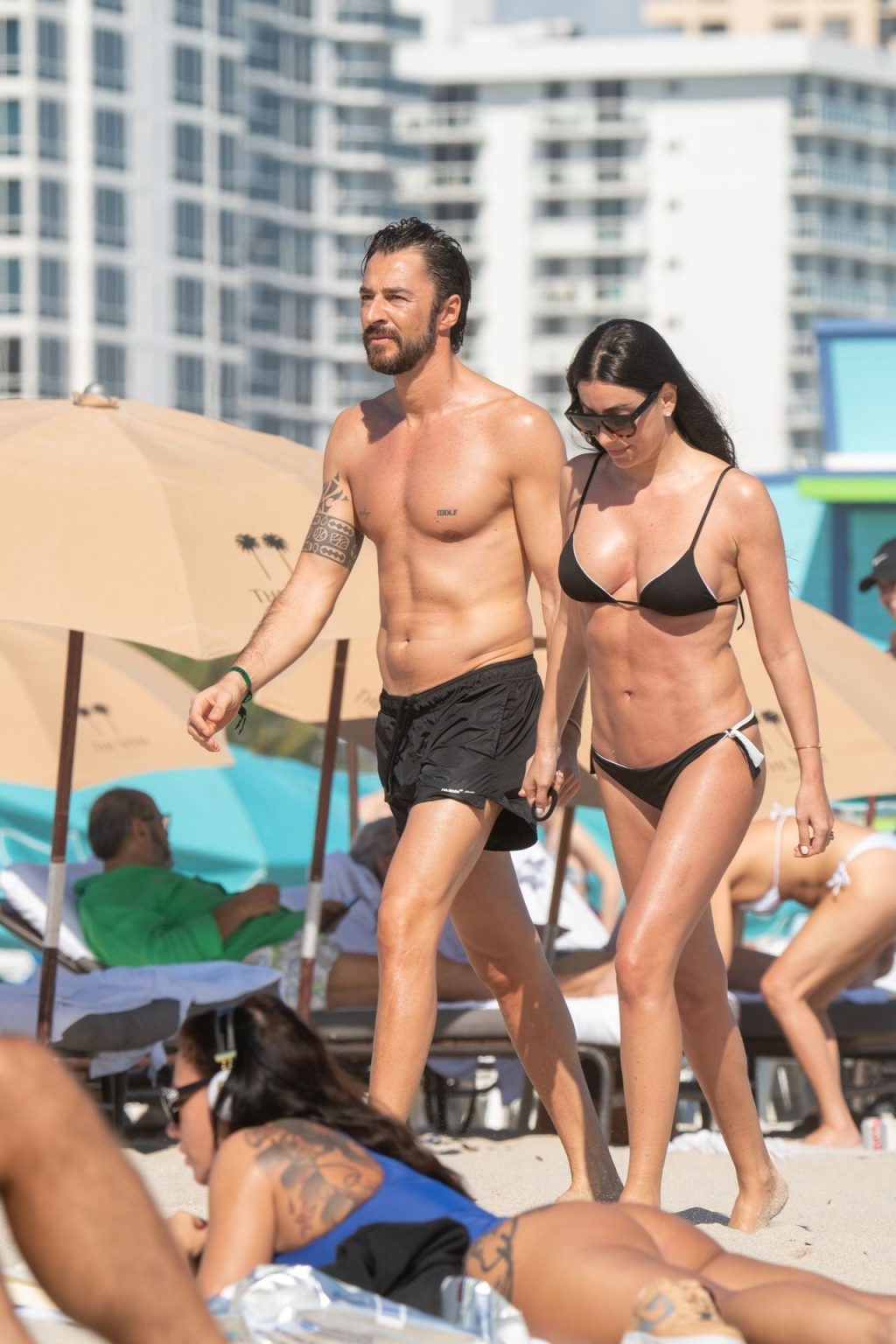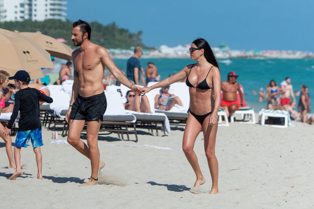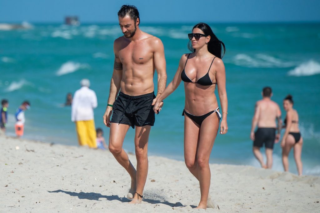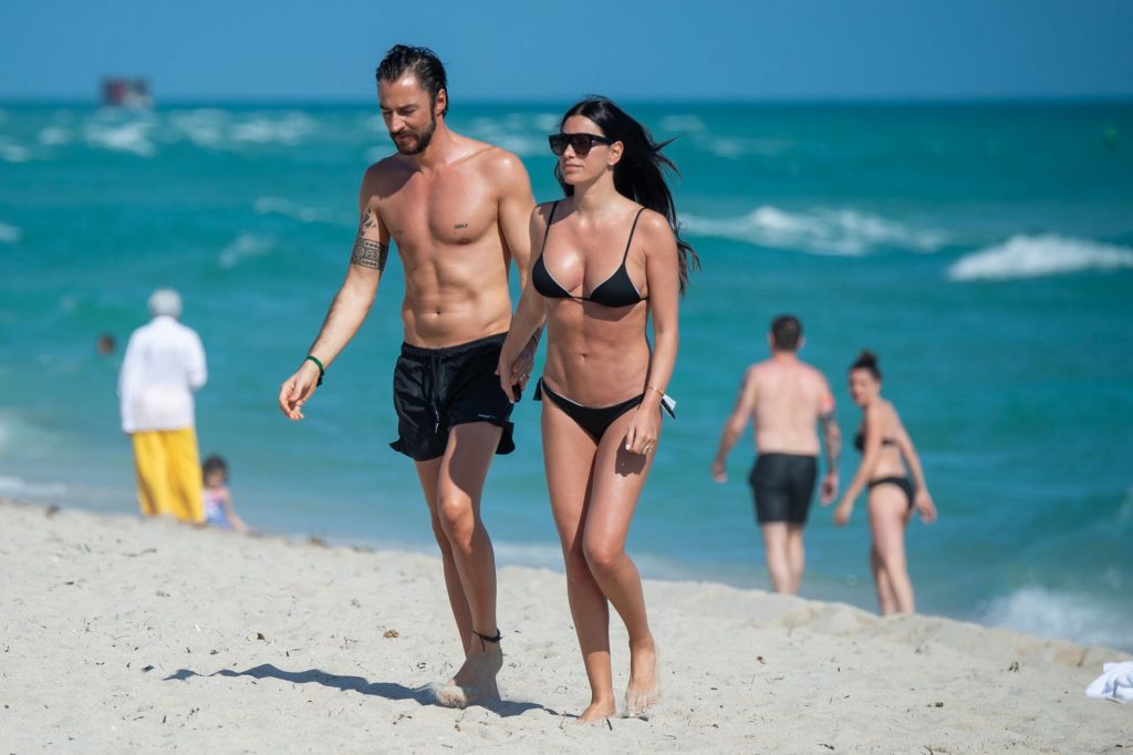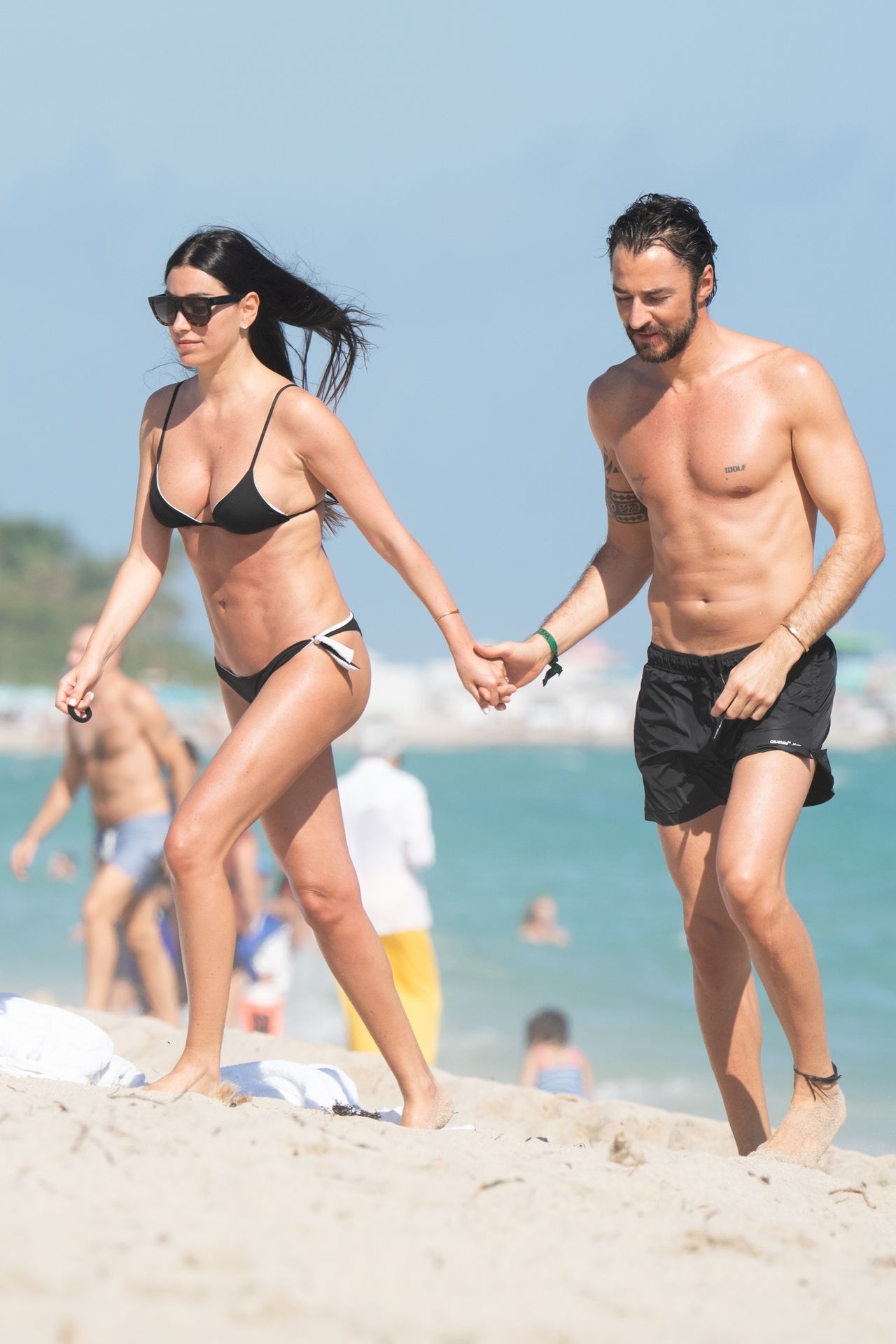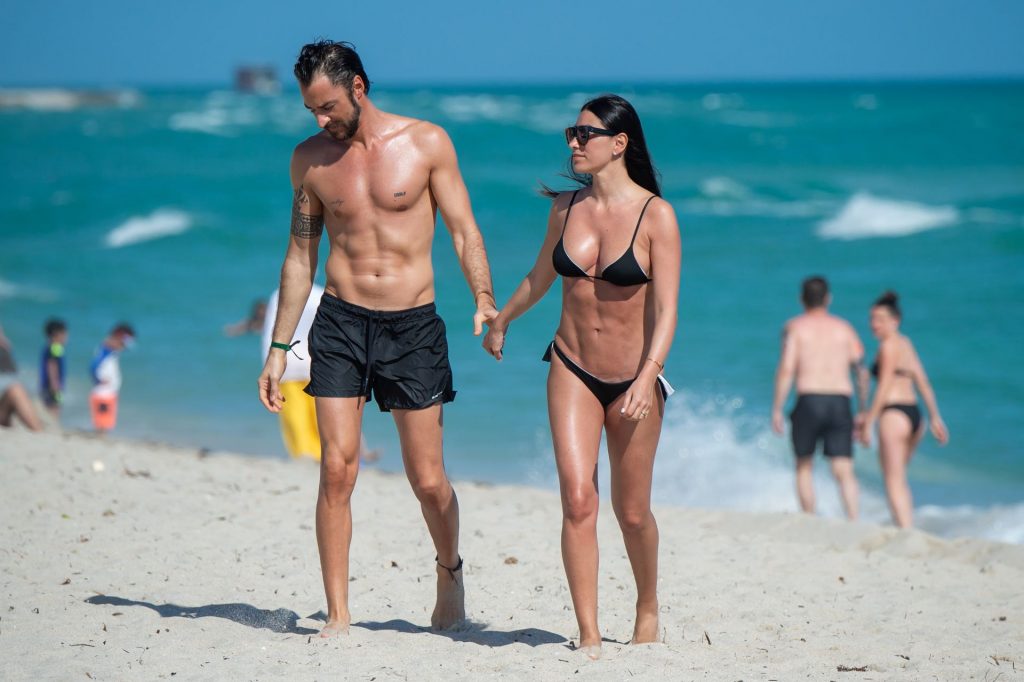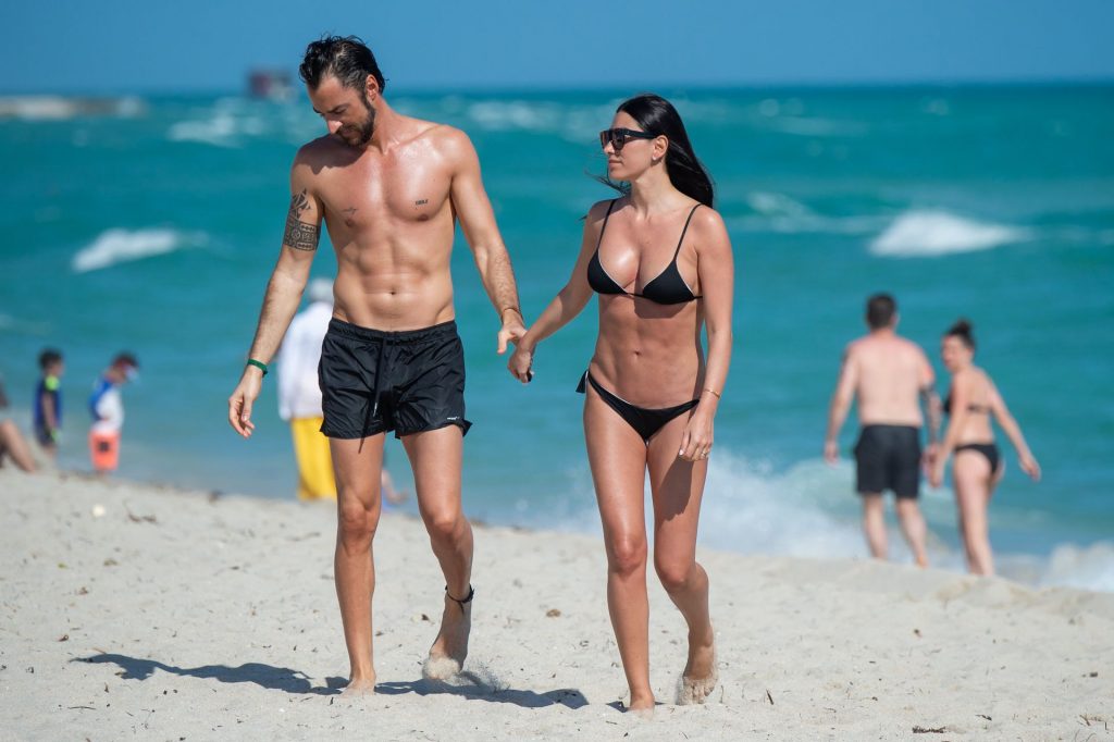 La celebridad italiana y nueva mamá Giorgia Gabriele y su pareja Andrea Grilli son vistos durante un día de playa en Miami, 01/03/2020. Giorgia Gabriele mostró su increíble cuerpo post parto mientras usaba un mini negro.